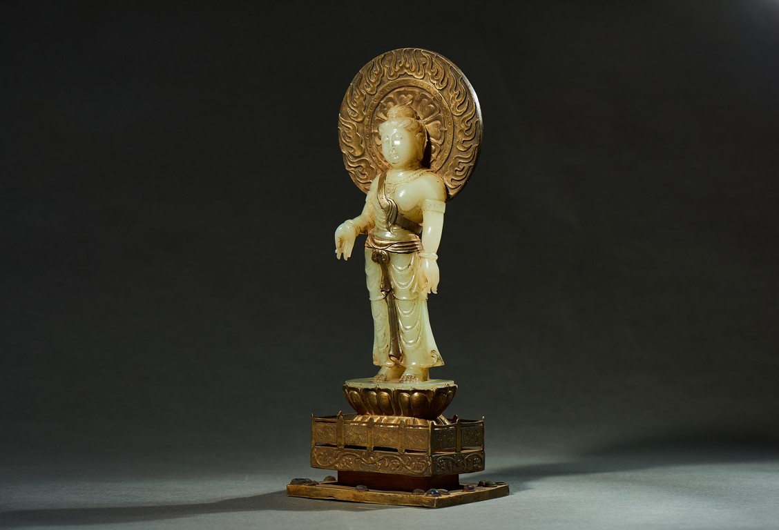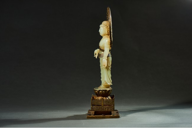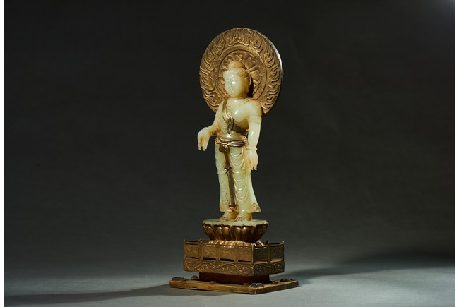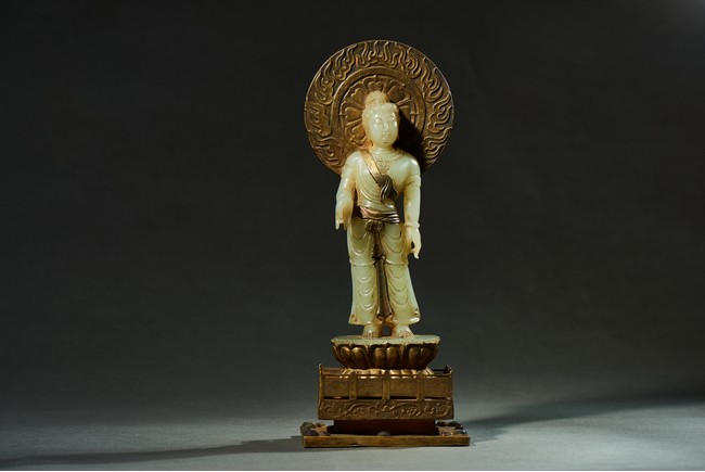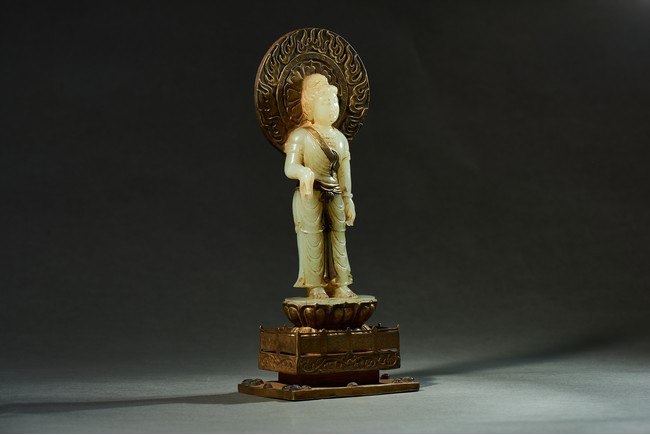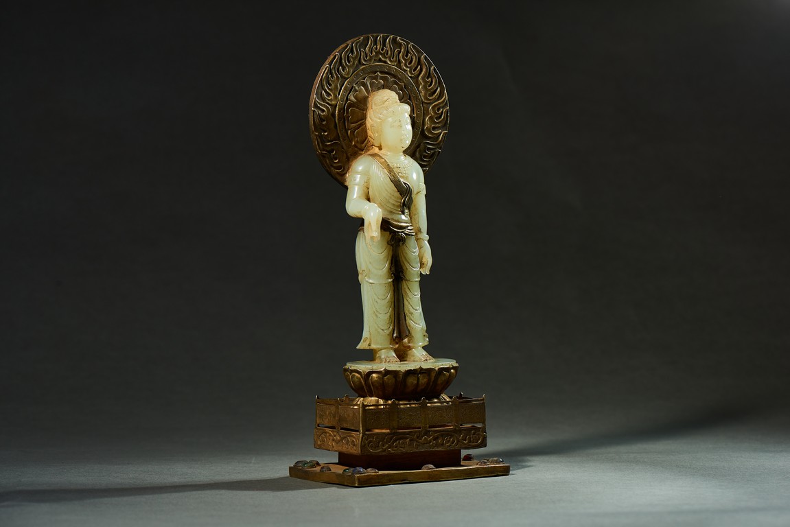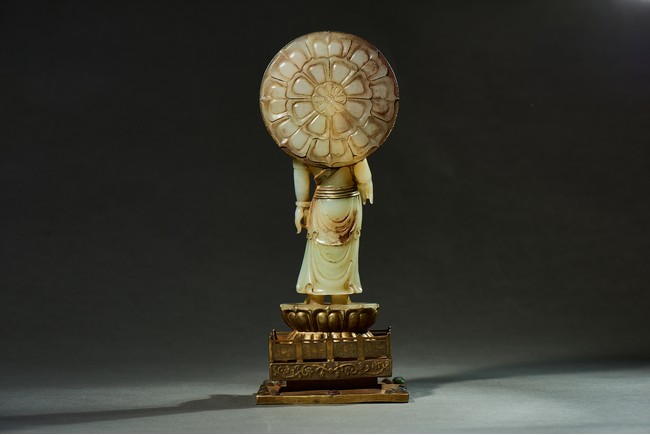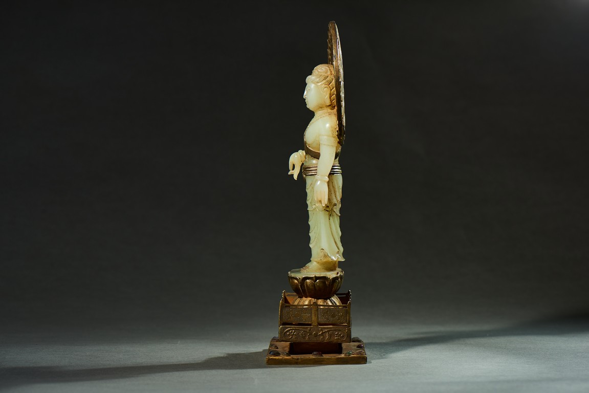 The standing bodhisattva shown wearing dhoti with face in serene expression, backed by a large circular mandorla in gilt bronze and supported on square plinth.