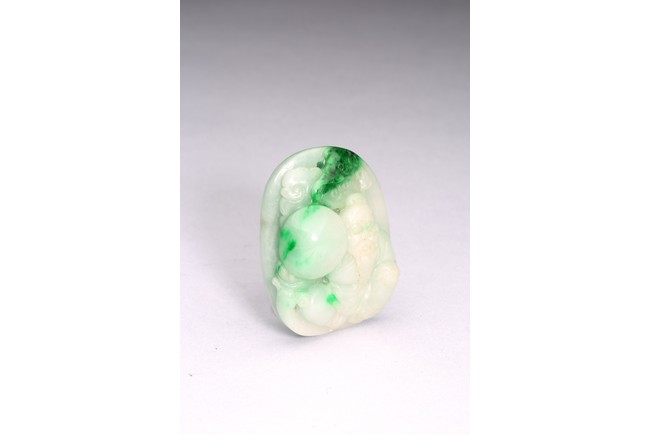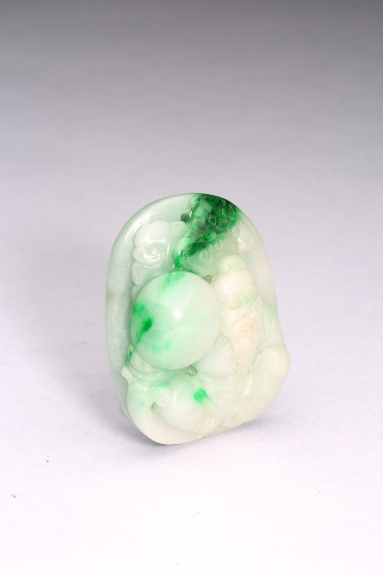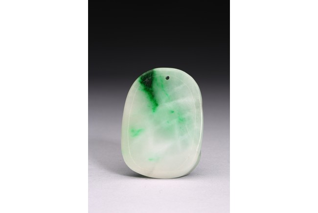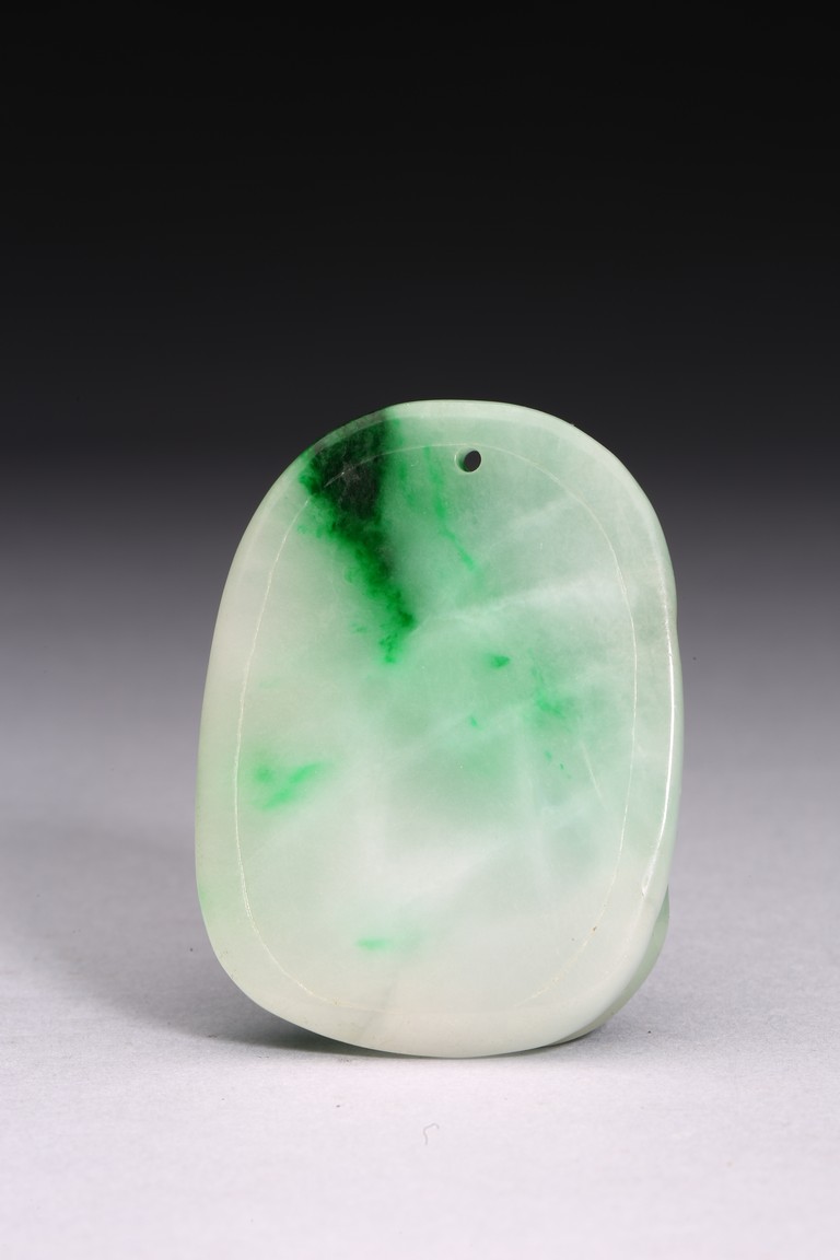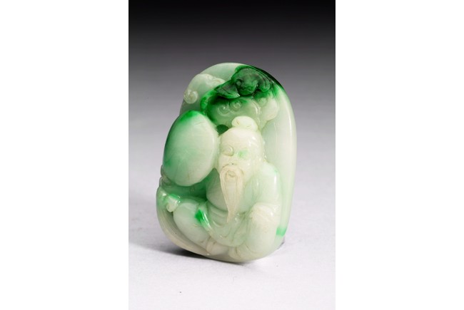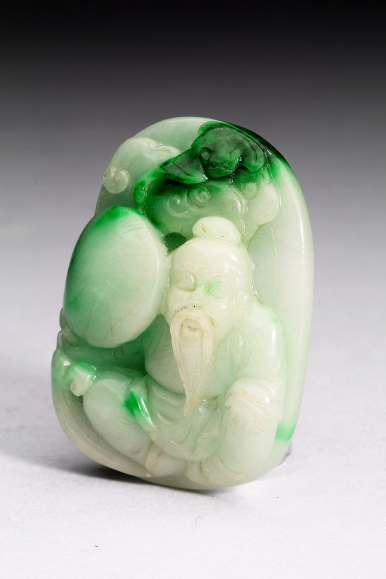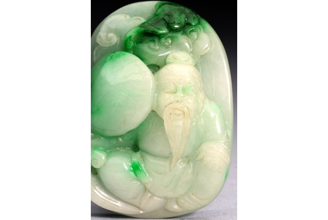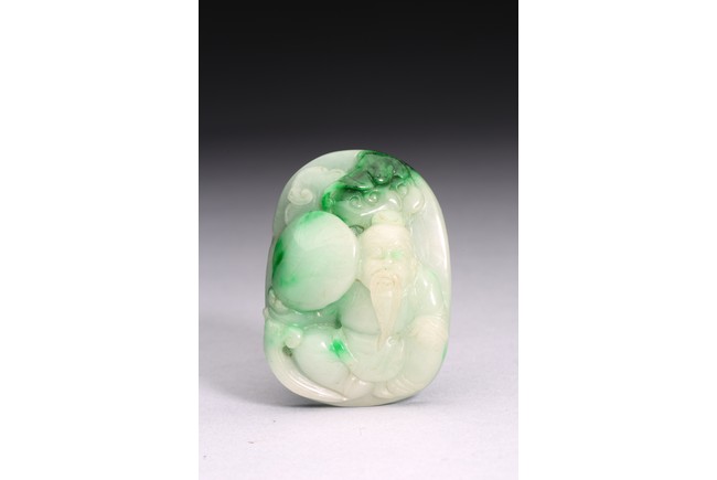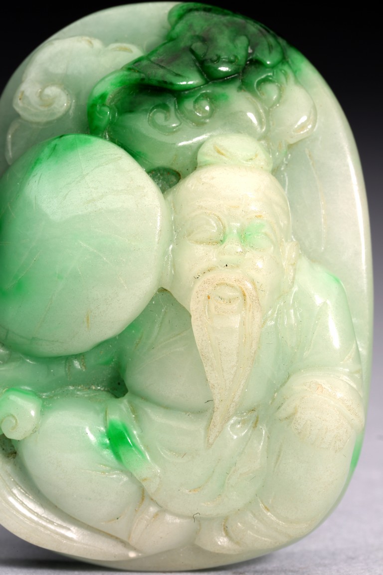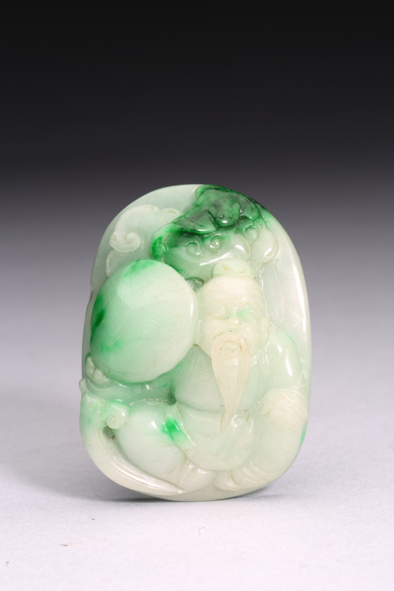 Of oval form, the pendant carved to the front to depict the longevity immortals. Qing Dynasty period.