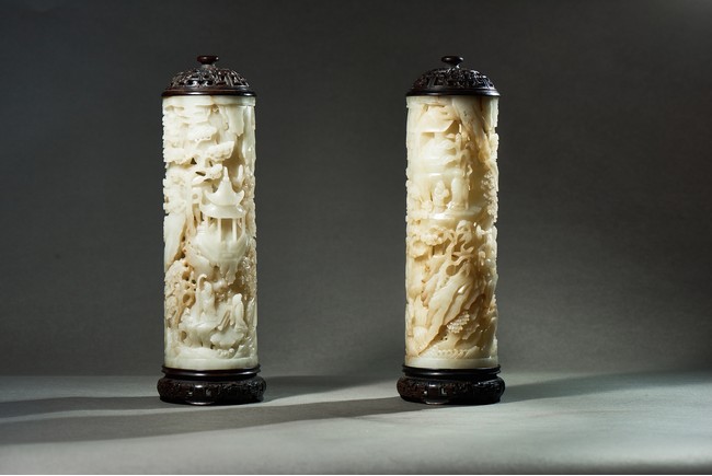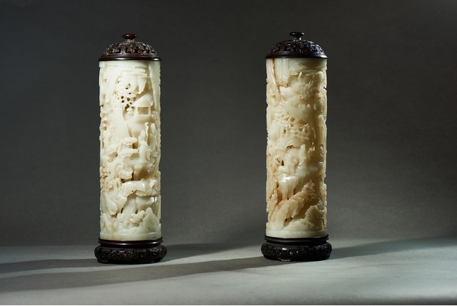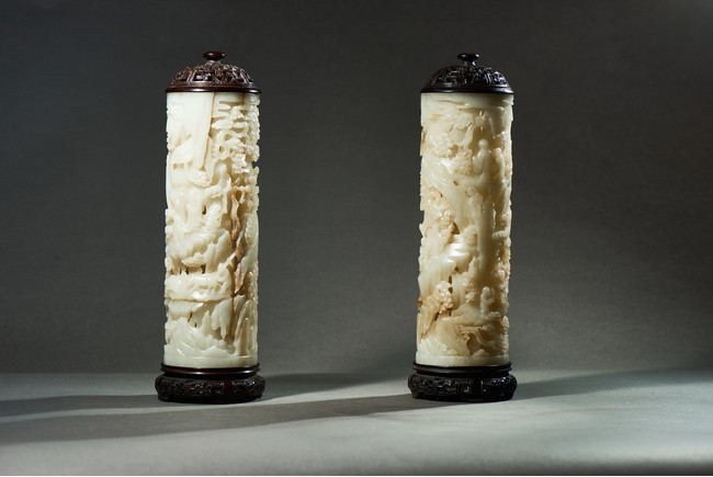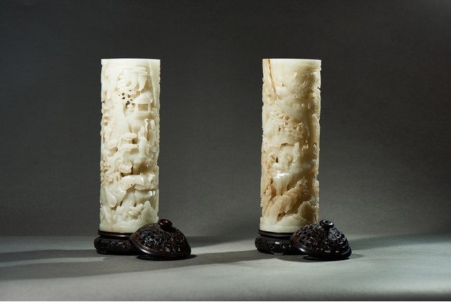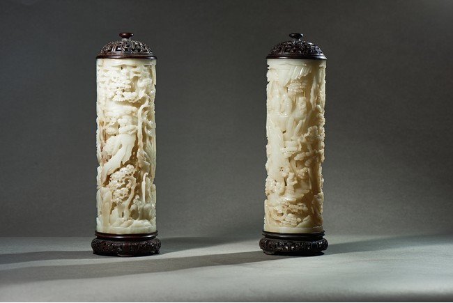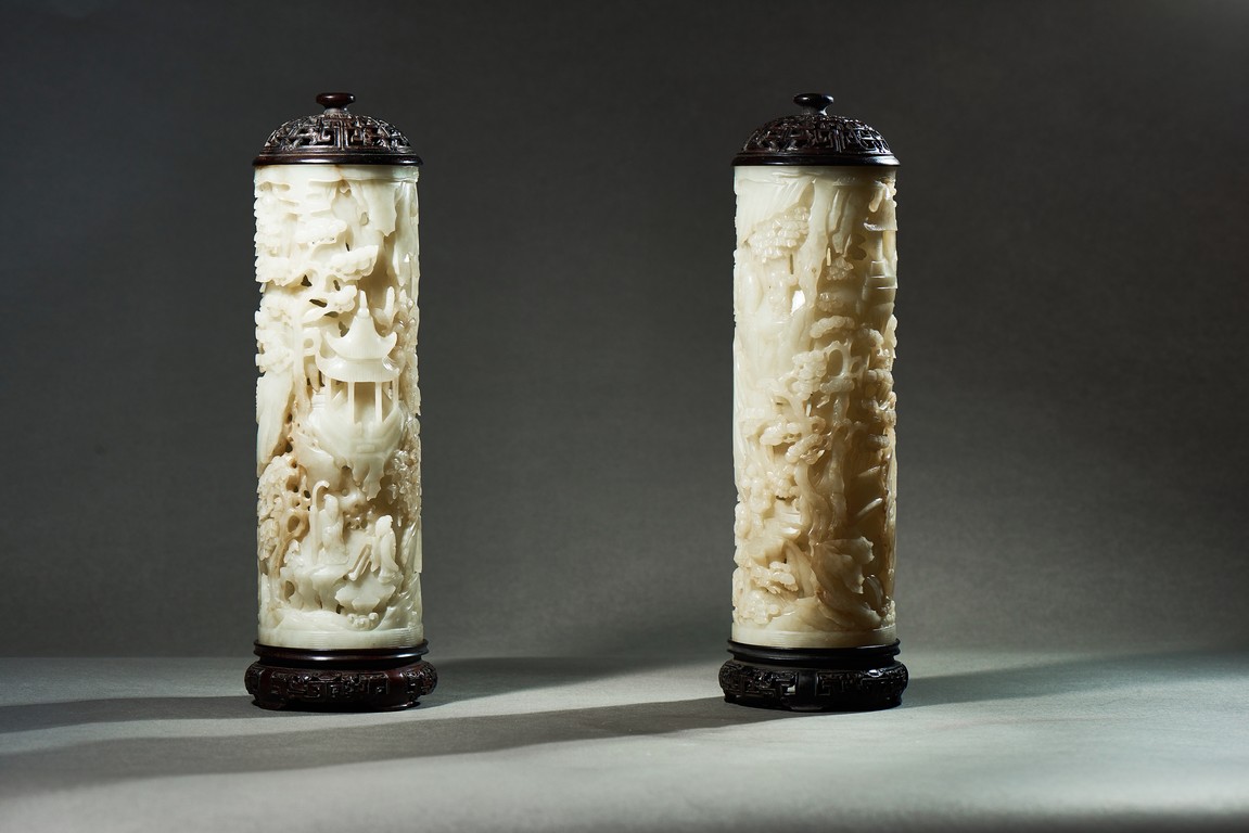 Provenance: Property from a private collection, San Francisco 香筒是古代淨化空氣的一種室內用具,一般是直接將特製的香料或是香花放入香筒內, 香氣便從筒壁、筒蓋的氣孔中溢出,是一種清雅的室內陳設品。此對香筒取材白玉,做直筒式,圓口,硬木器蓋,上有鈕。內壁平滑,外壁採用淺地浮雕技法,雕松下高仕圖。蒼松翠柏中,亭台樓閣隱約可見,曲徑通幽處,文人雅士有跡可循,人物、景緻被刻畫得惟妙惟肖,淋漓盡致。人物傳神,意境空幽,畫面雅緻,韻味綿長。此對香筒用料上乘,玉質滋潤,溫婉細潤,通體佈局精巧,疏密有致,運刀流暢,以嫻熟的刀法刻畫出文人山水畫的空靈與灑脫之境,頗見功力。 來源:三藩市私人藏家提供