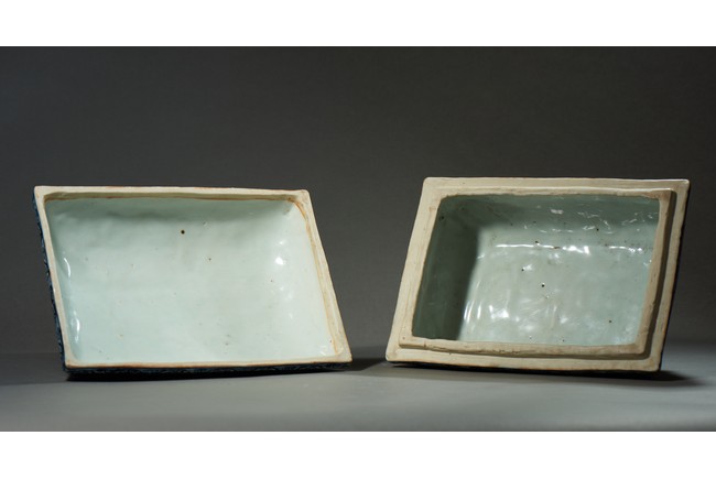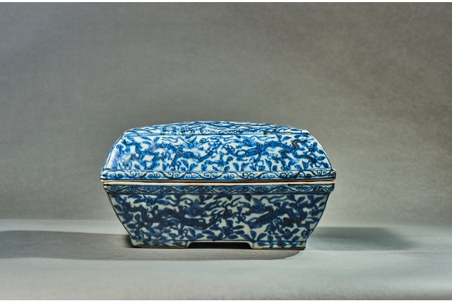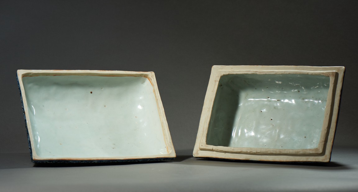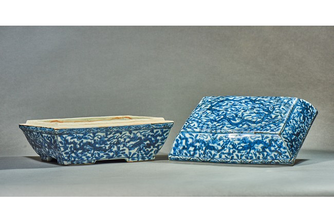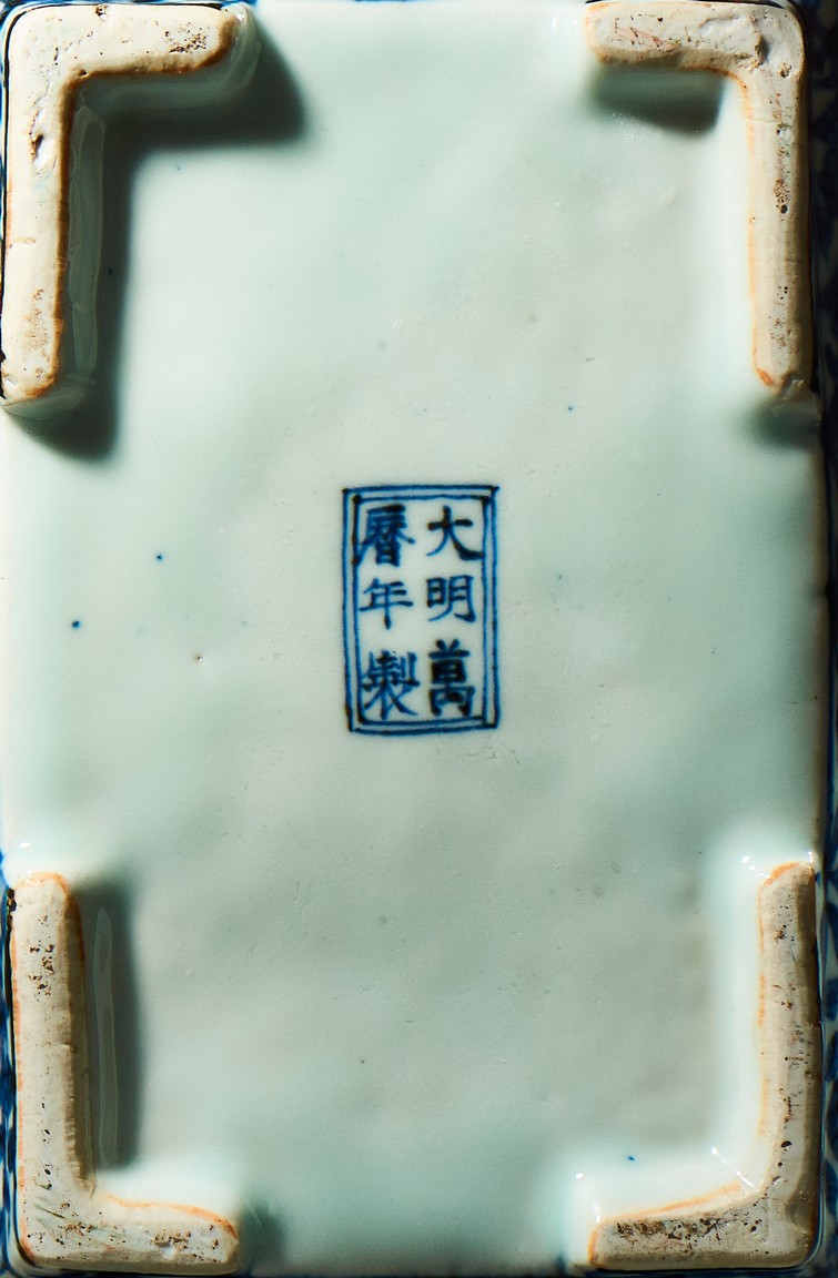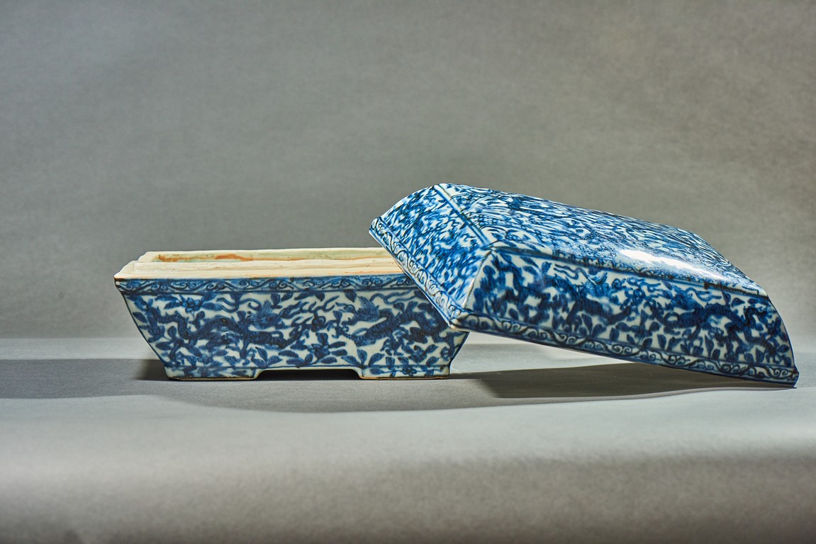 Of rectangular form, the box top decorated with a pair of confronting dragons chasing flaming pearl amidst leafy floral sprays enclosed within a shaped double band border, the cover and box sides similarly decorated, all supported on four short stubs, base inscribed with six character Wanli mark. Ming Dynasty period.