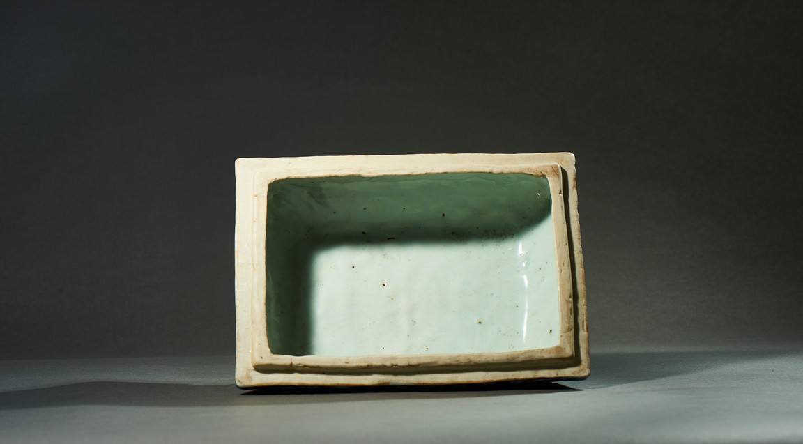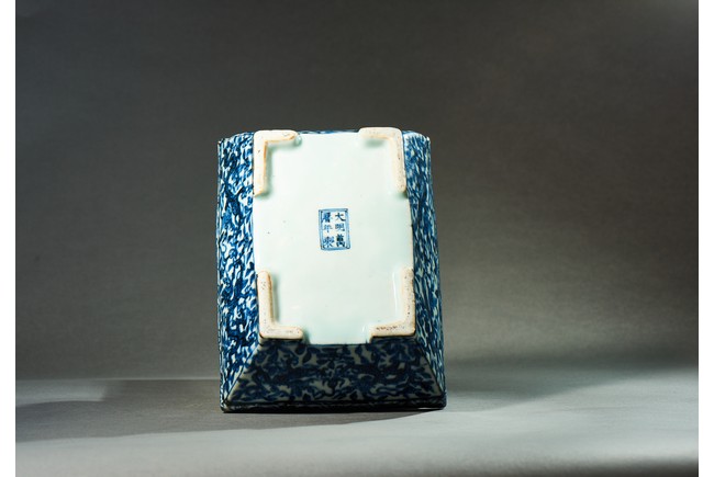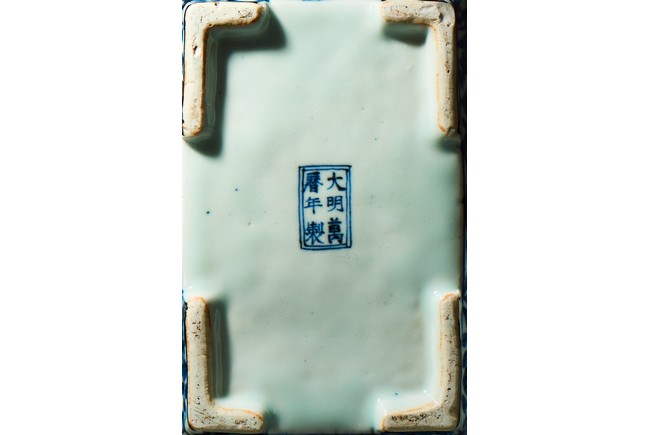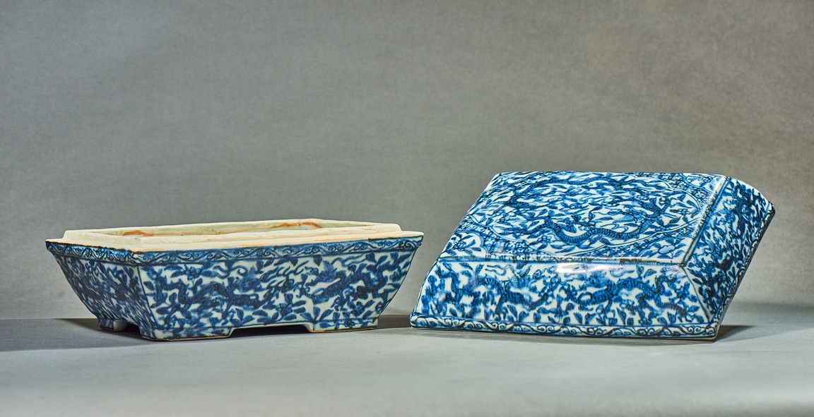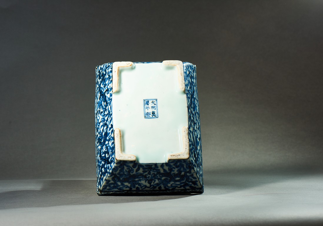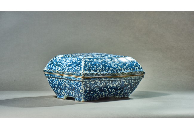 Provenance: Property from a private collection, Las Vegas 盒呈方形,子母口,上下結合緊密。該盒釉質亮白如玉,胎體製作精細。通體以青花為飾,繪雙龍戲珠紋,青花髮色清新亮麗。整體古雅大方,畫面工整。 “大明萬曆年制”款識。 來源:拉斯維加斯私人藏家收藏