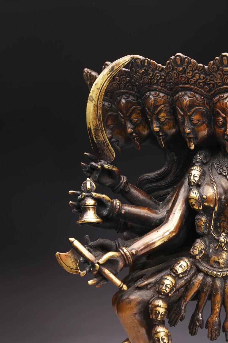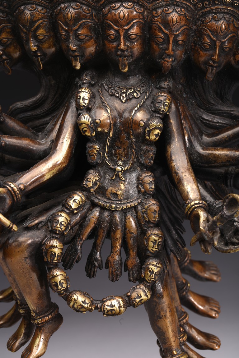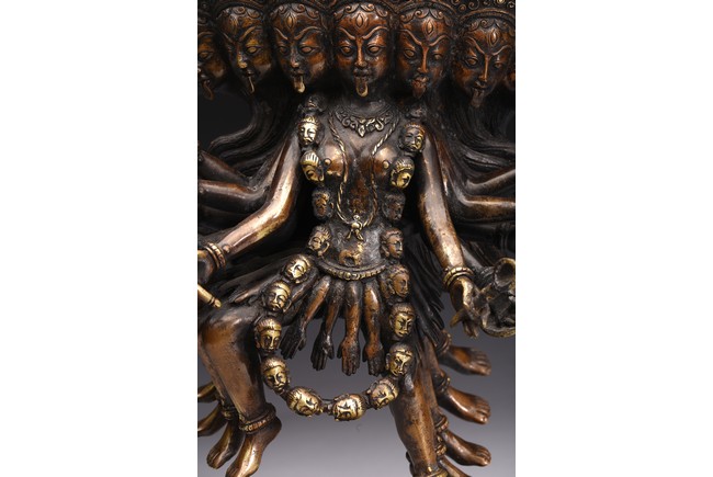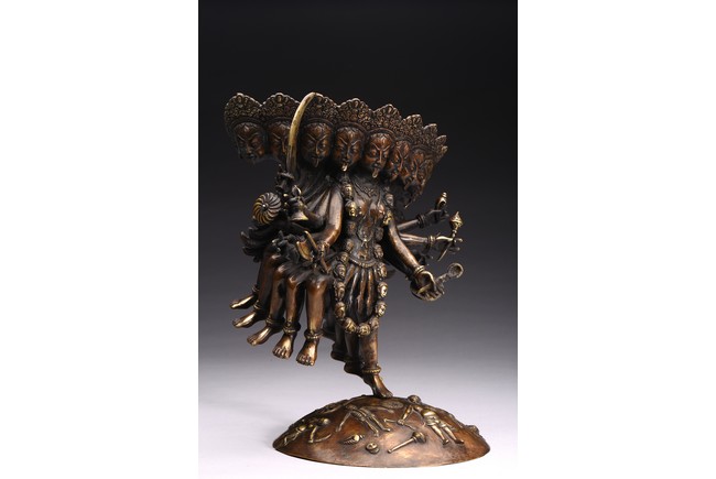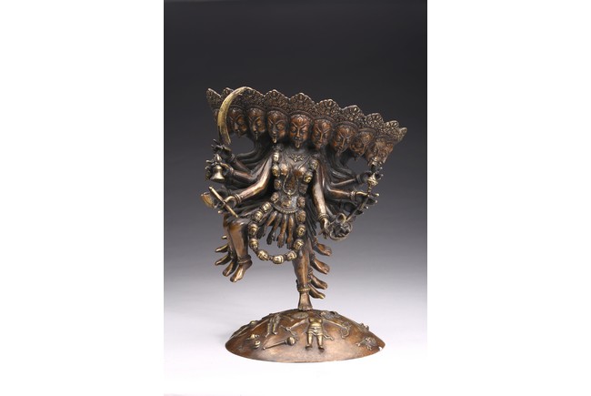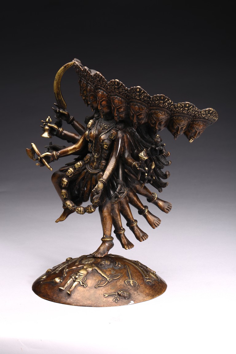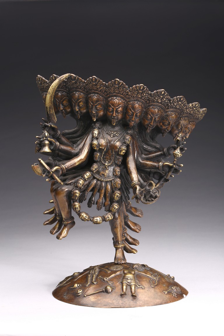 Shown standing upon dome of corpses, multiple arms radiating out holding various weapons and ritual objects, faces with ferocious expression.