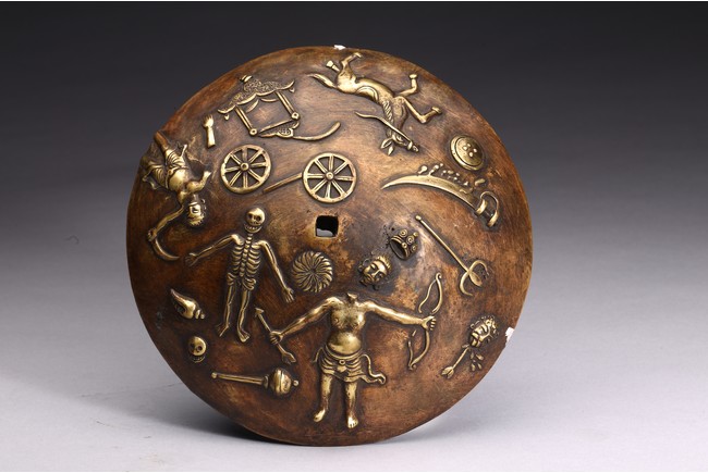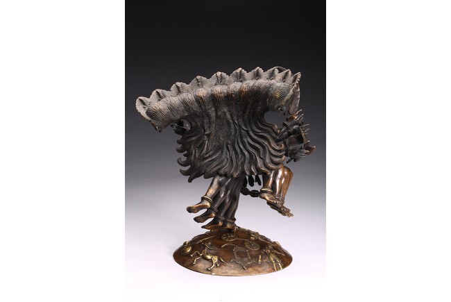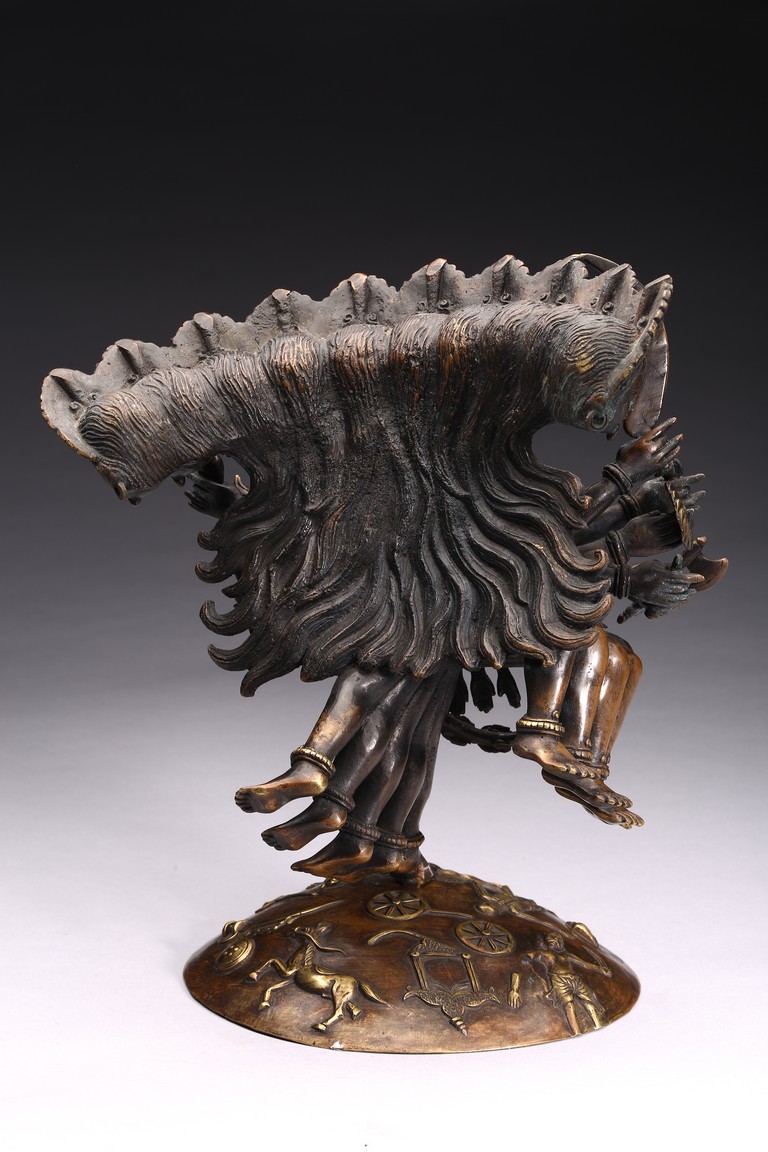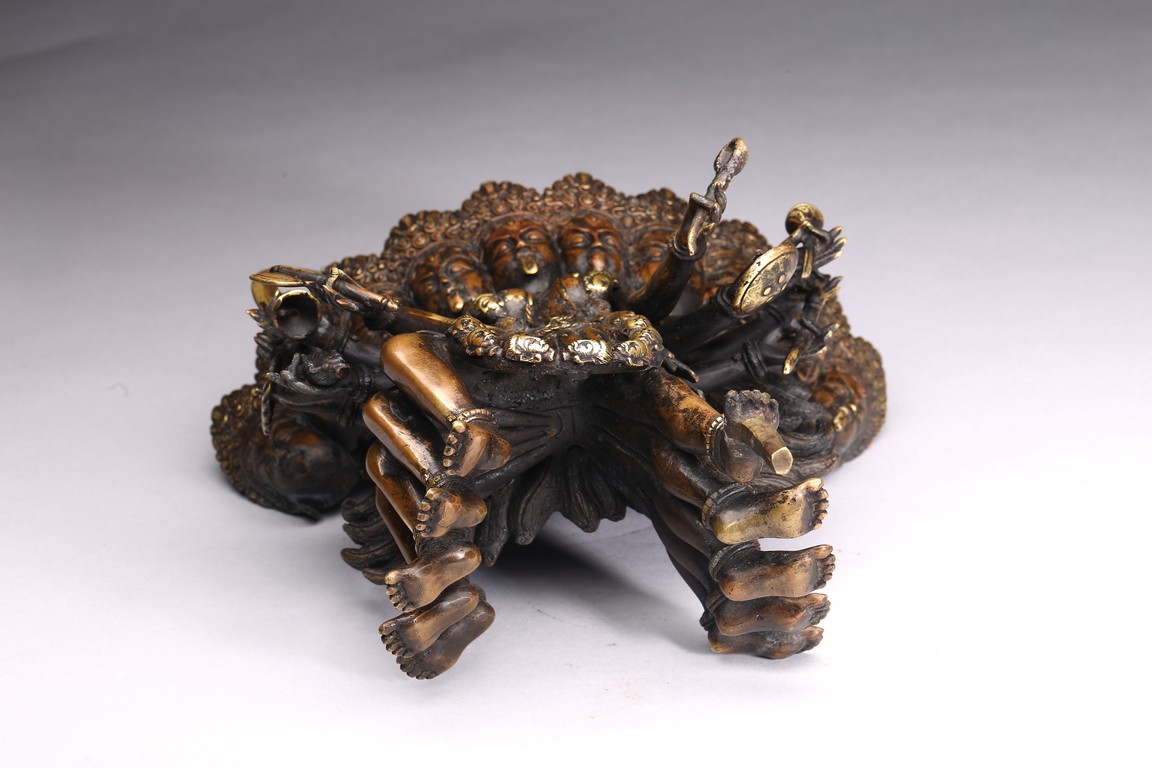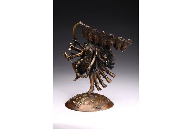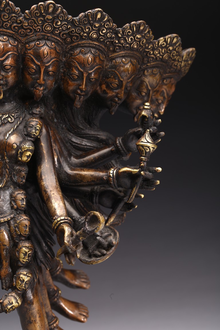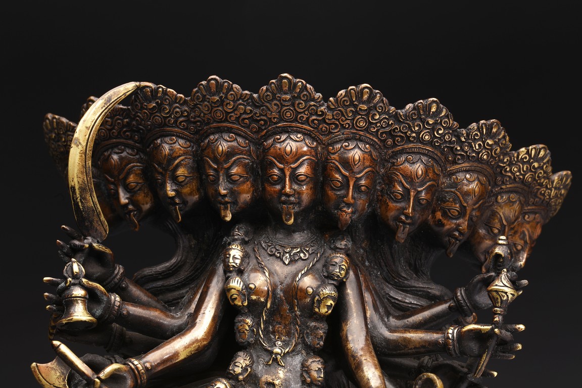 Shown standing upon dome of corpses, multiple arms radiating out holding various weapons and ritual objects, faces with ferocious expression.