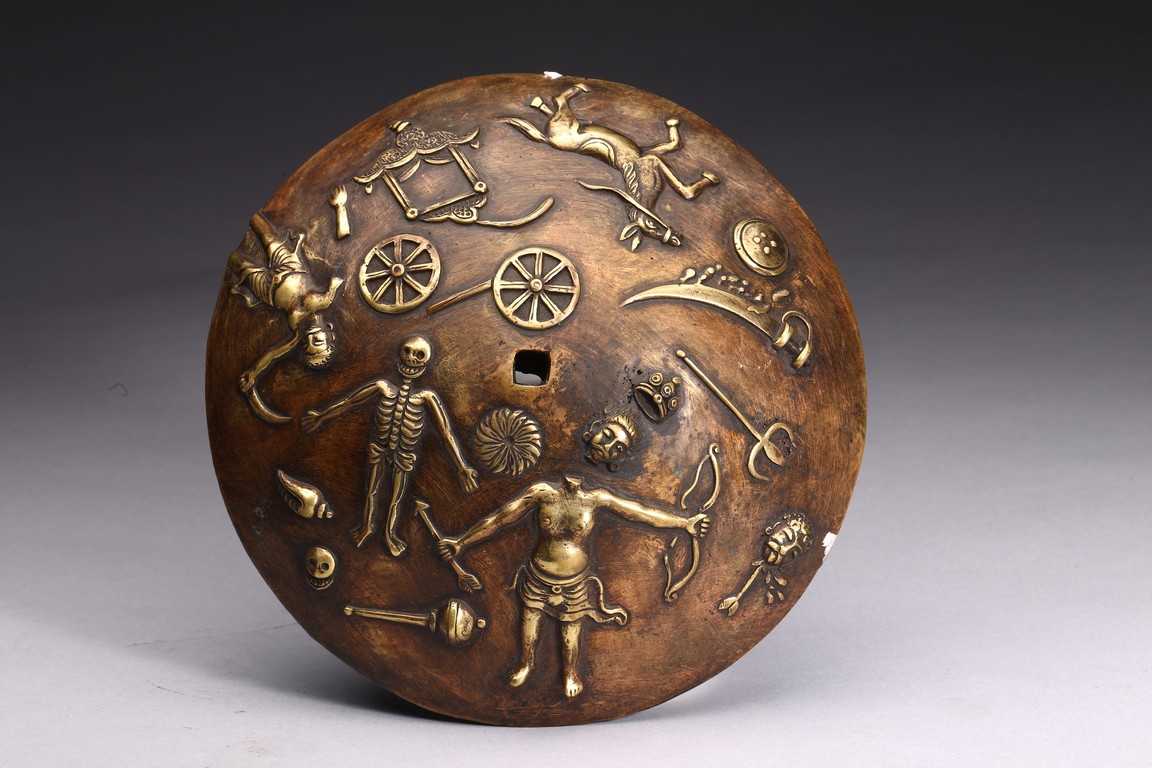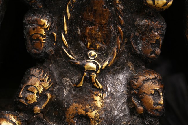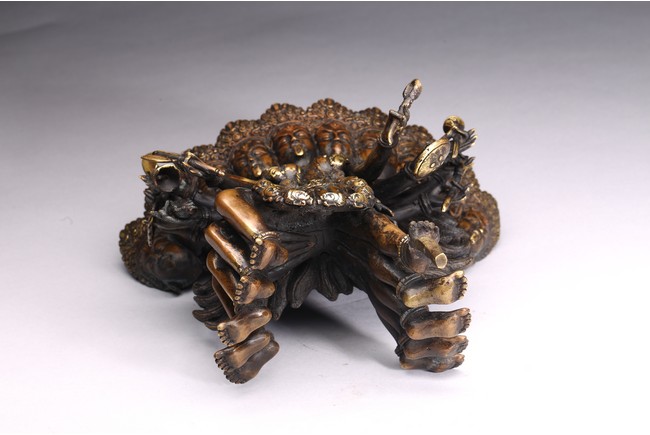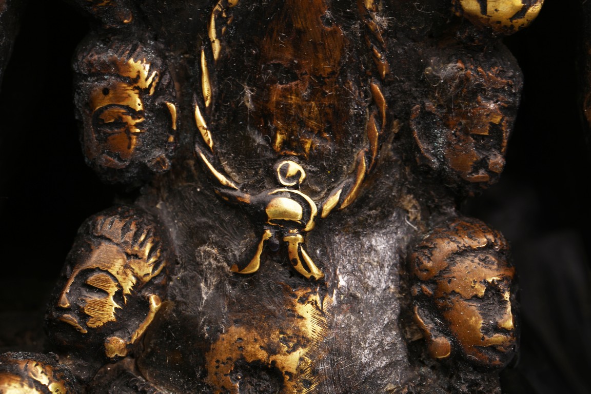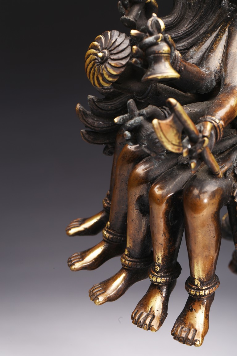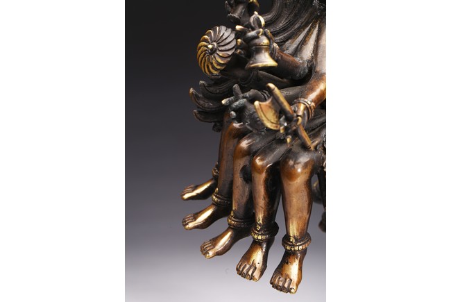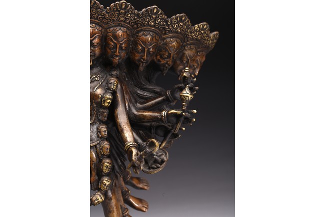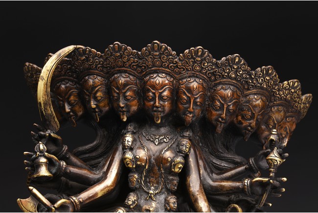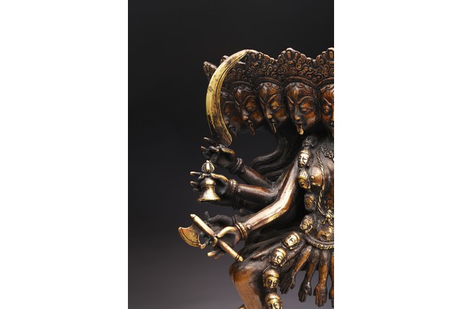 上樂金剛,是藏密瑜伽部的母續本尊,也是藏密四大派共修的本尊。每面各具三目,呈寂忿相,雙目圓睜,張口結舌,手持金剛鈴、金剛斧、金剛索。左腿直伸,足踏大自在天神,右腿懸空,皆以五十乾濕人頭瓔珞作為裝飾。此尊上樂金剛造型特殊,優美生動,富有較強的藝術感染力。