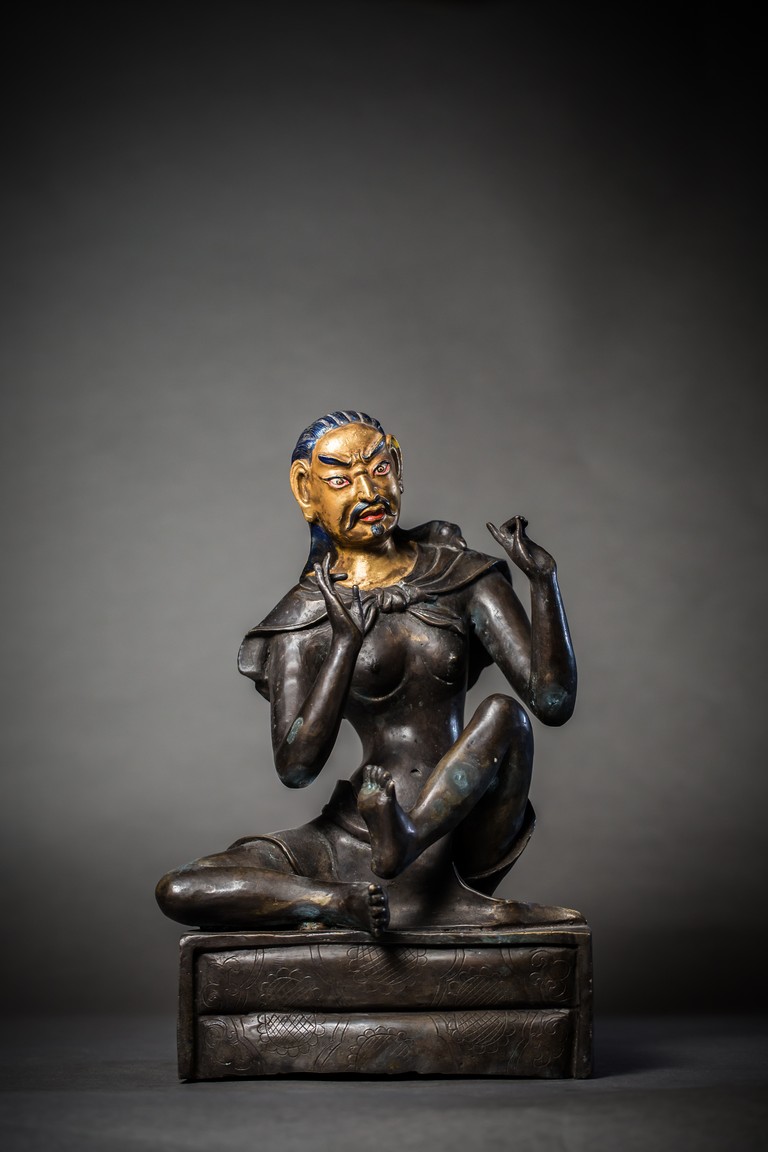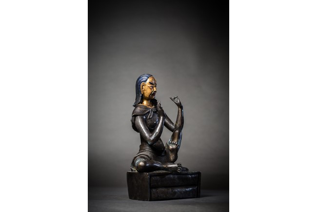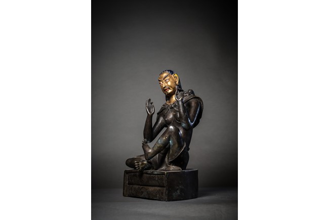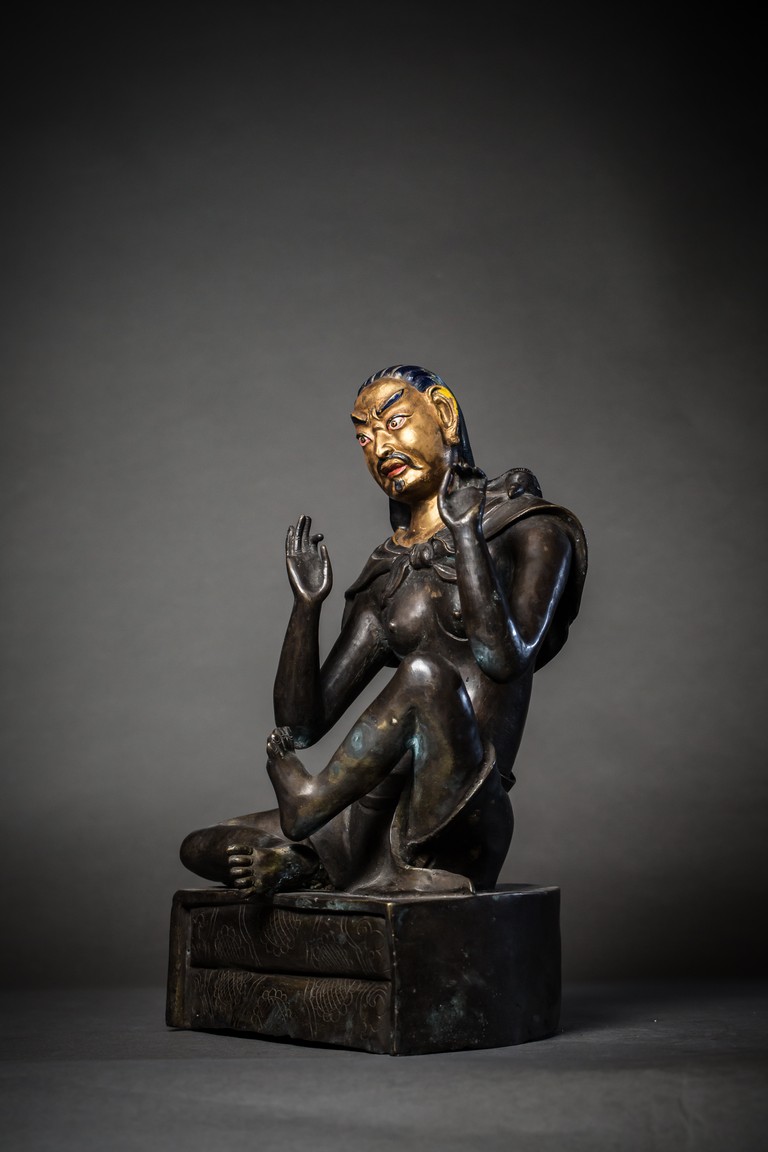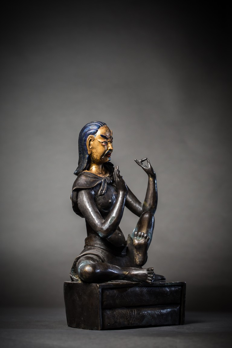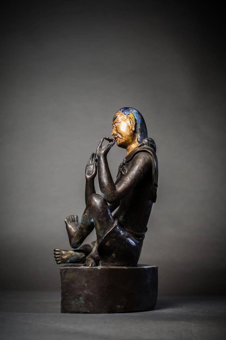 公元 8-12 世紀是印度密教的興盛時期。在此期間,印度境內先後共有八十四位因實踐和傳承佛教密法而獲得成就的大師,即“大成就者”。他們的形像多為肩披長髮,蓄留鬍鬚, 並以各不相同的姿態修行。此件造像為印度修學密法中著名的八十四位大成就者之一。造像以合金銅製作而成,面部鎏金,面相圓潤,額部寬廣,雙眉上揚,疑神靜思,山羊鬍鬚,嘴唇緊閉,袒露上身,脖子係有披風,下身著短裙,結半跏趺姿坐於方形台座上,左右手皆作說法印。整尊造像題材少見,造型比例協調,鑄造及雕刻工藝極為精湛,人物形像生動,五官刻劃清晰,面部表情逼真,藝術水平極高,具有強烈的寫實風格,生動地塑造了一位道行高深的印度修行者的真實形象。