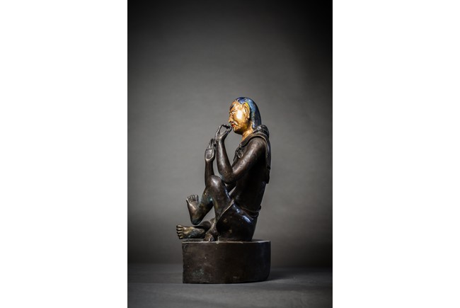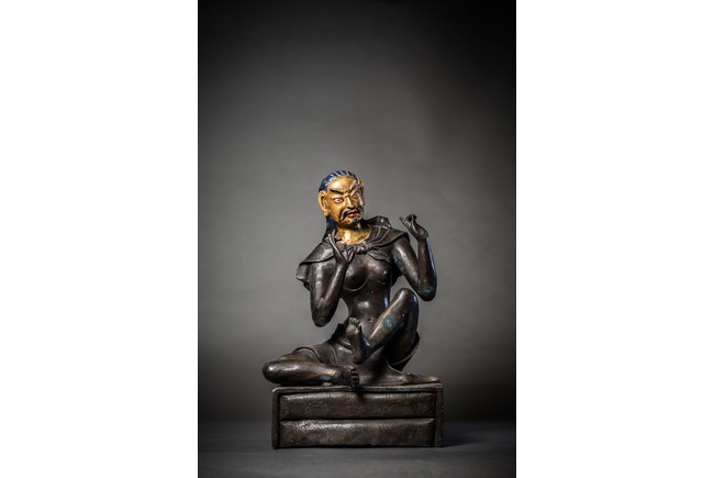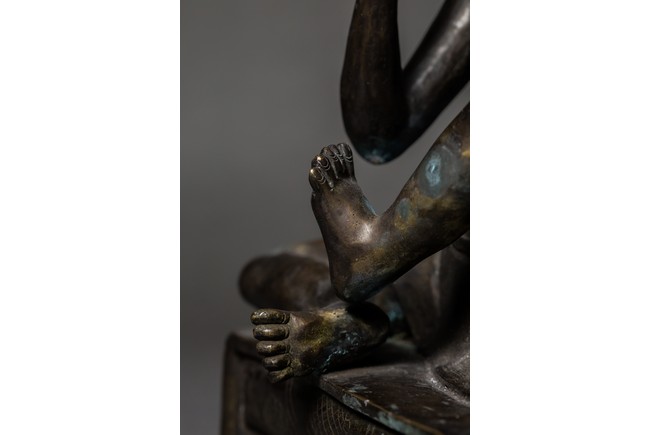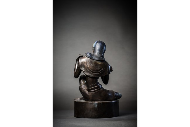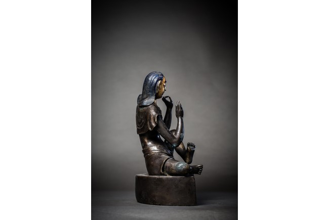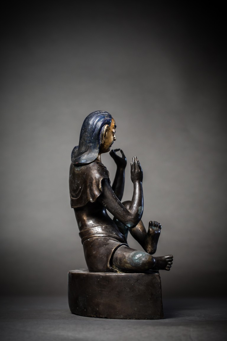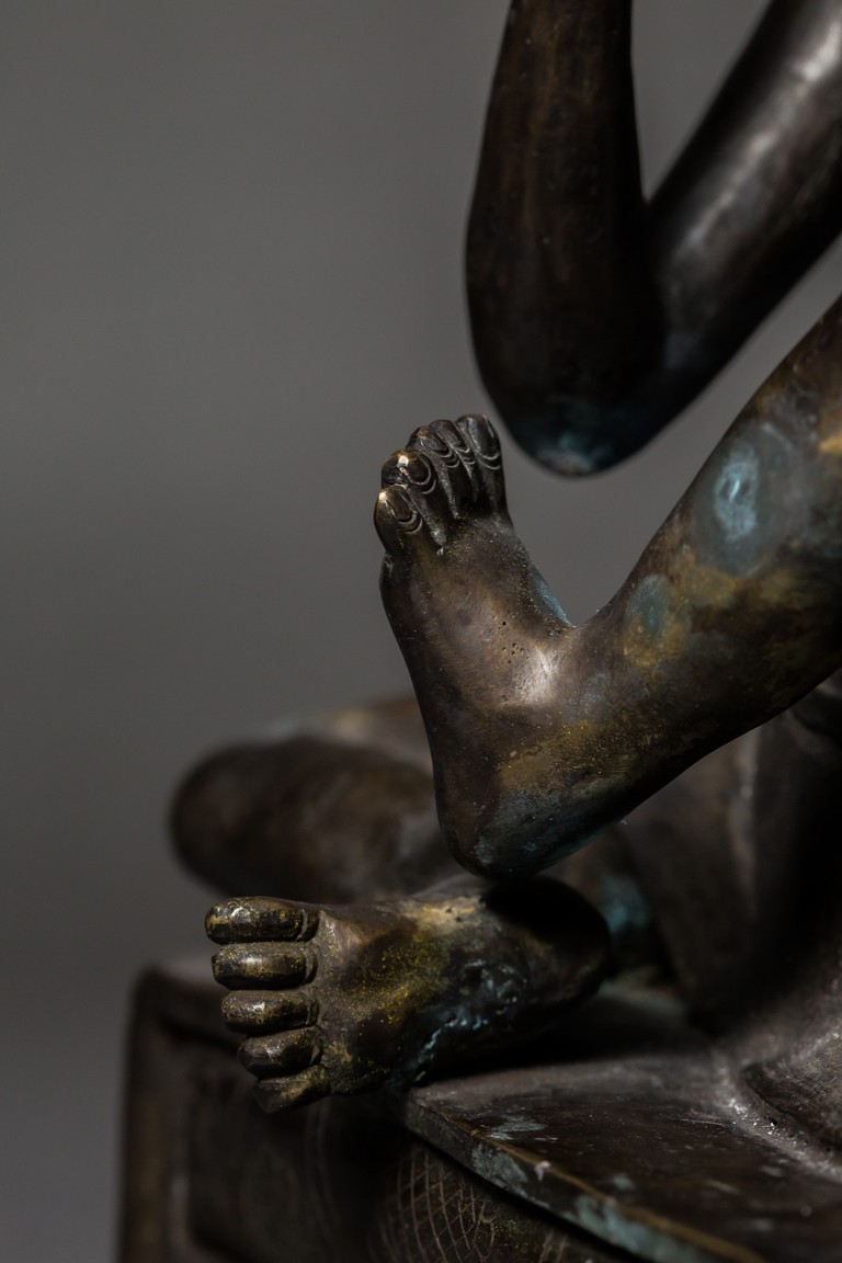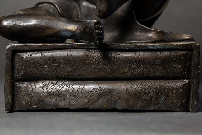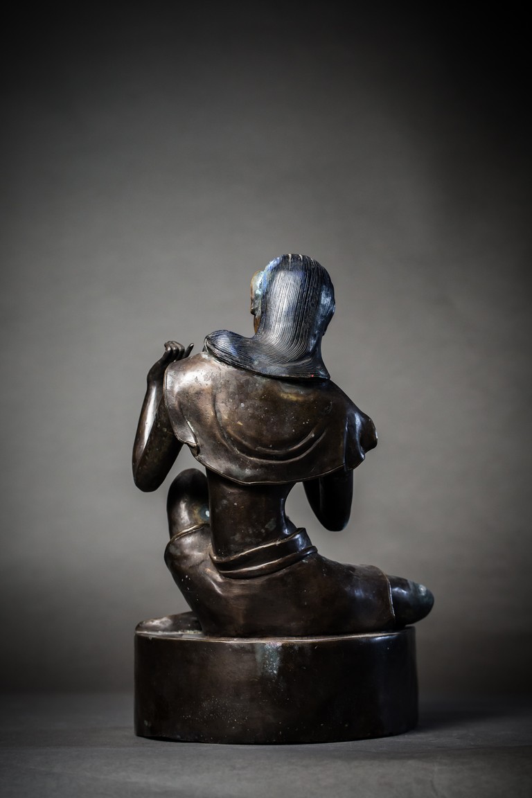 公元 8-12 世紀是印度密教的興盛時期。在此期間,印度境內先後共有八十四位因實踐和傳承佛教密法而獲得成就的大師,即“大成就者”。他們的形像多為肩披長髮,蓄留鬍鬚, 並以各不相同的姿態修行。此件造像為印度修學密法中著名的八十四位大成就者之一。造像以合金銅製作而成,面部鎏金,面相圓潤,額部寬廣,雙眉上揚,疑神靜思,山羊鬍鬚,嘴唇緊閉,袒露上身,脖子係有披風,下身著短裙,結半跏趺姿坐於方形台座上,左右手皆作說法印。整尊造像題材少見,造型比例協調,鑄造及雕刻工藝極為精湛,人物形像生動,五官刻劃清晰,面部表情逼真,藝術水平極高,具有強烈的寫實風格,生動地塑造了一位道行高深的印度修行者的真實形象。