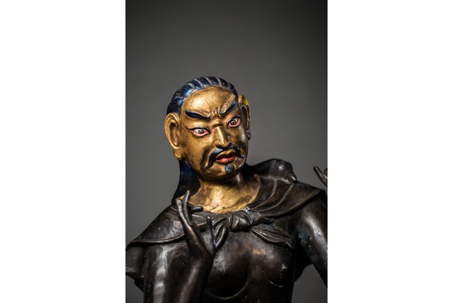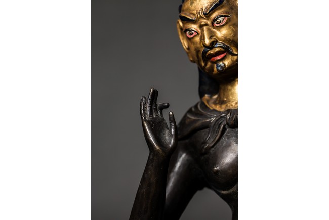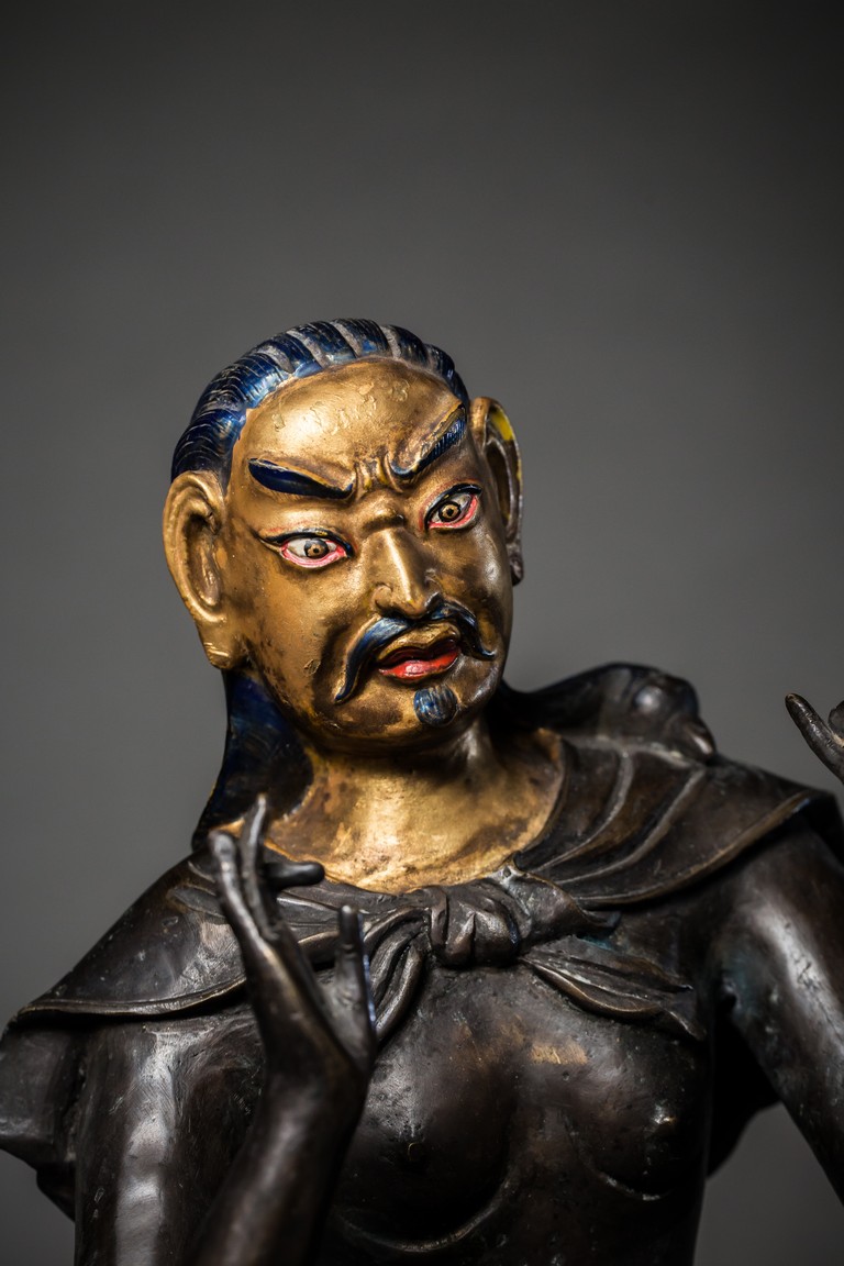 The figure is seated in a relaxed posture on an animal-skin draped over the cushion. Both hands are held in different gestures. His cold-gilted and painted face displays a severe expression with open eyes and is framed by moustache and beard.