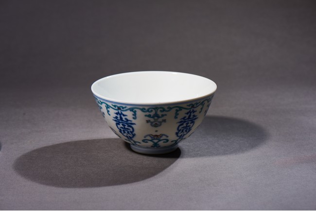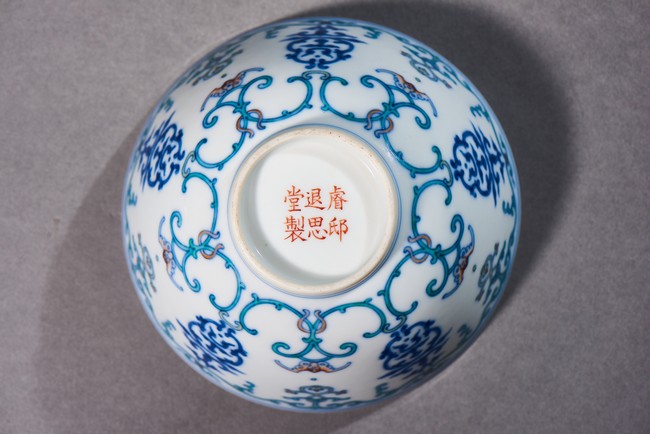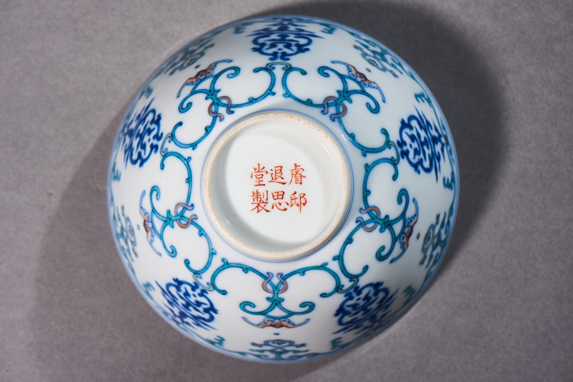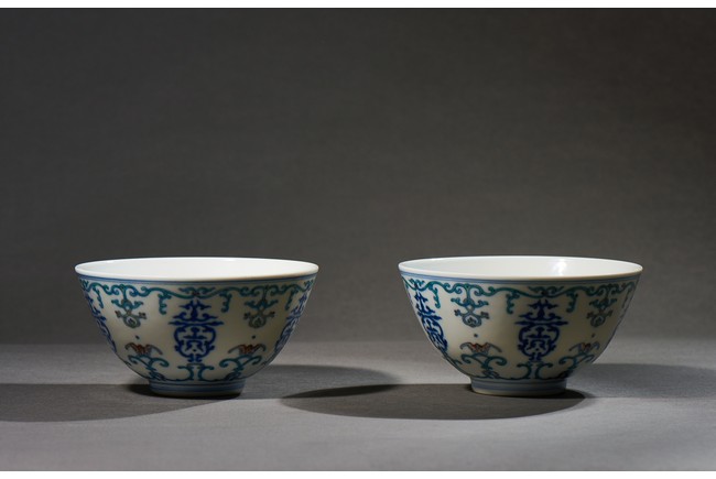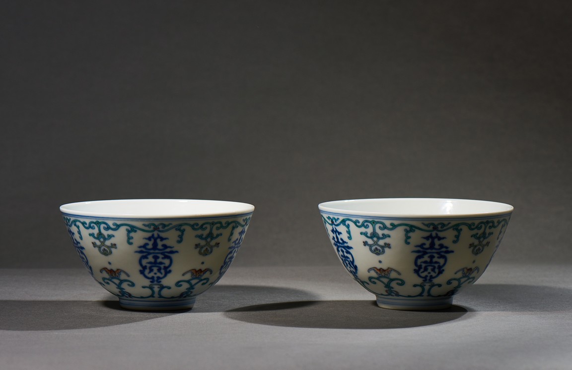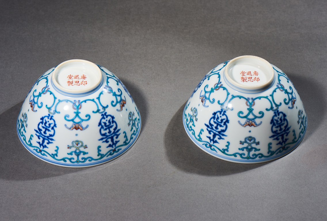 碗敞口,深弧腹,圈足。外壁以鬥彩繪纏枝蝠壽紋,其佈局清新疏朗,填色精準,青花明亮靜恬,綠彩嬌嫩青翠,黃彩明快潤澤,諸彩交映出淡雅柔和、臻於至美的內廷恭造風格。 “睿邸退思堂制”款識。 (清代道光年間官窯瓷器堂名款,系王府用器。)成對保存完好。