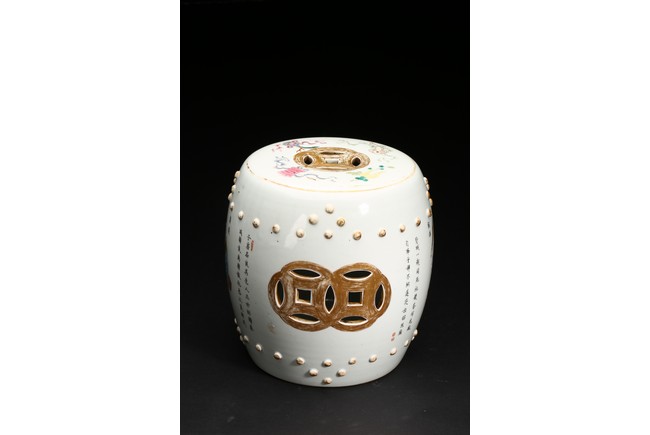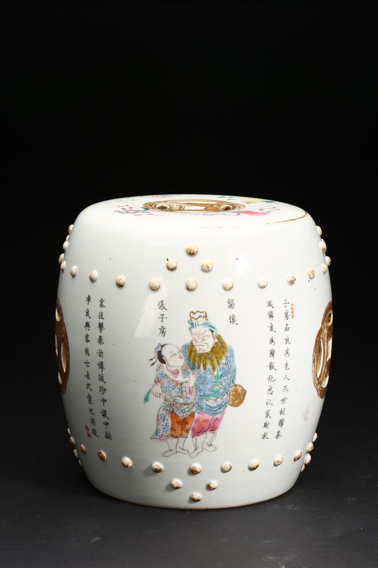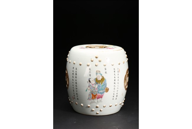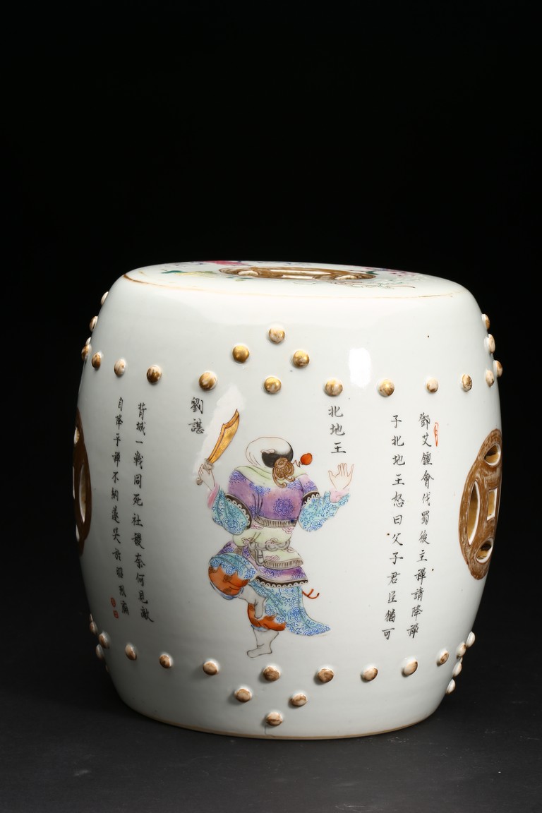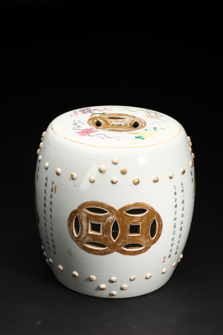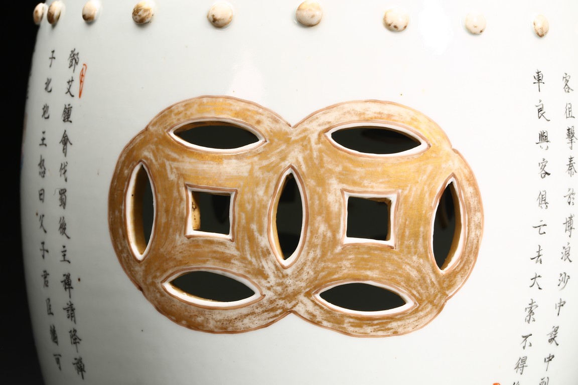 此鼓式凳,器型飽滿、渾圓,秀美挺拔,胎質潔白細膩,釉水瑩潤。粉彩描繪人物, 人物形像生動,神態自然,肩腳處飾成排小鼓釘,顆顆飽滿,十分可愛,鏤空雕雙錢紋, 吉祥別緻。成對保存,非常難得。