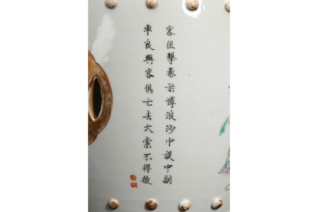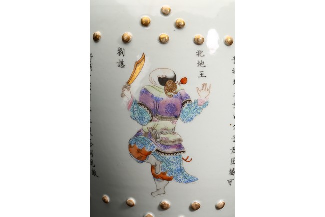 Each of drum shape, painted with historical figures from Han Dynasty period with inscriptions interspaced by openwork coin motif and flanked by two band of raised bosses, the top carved with similar coin motif surrounded by four painted auspicious motif. Qing Dynasty period.