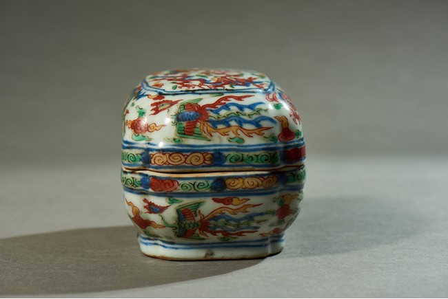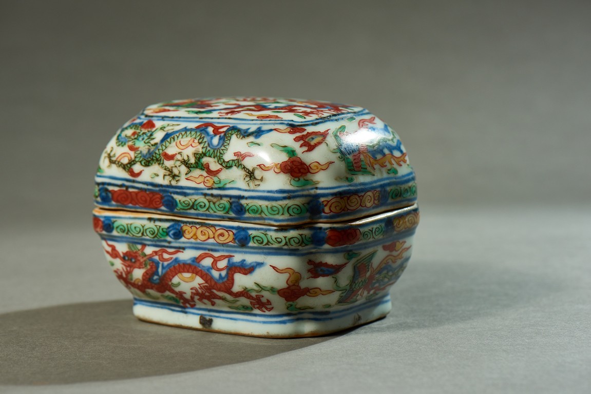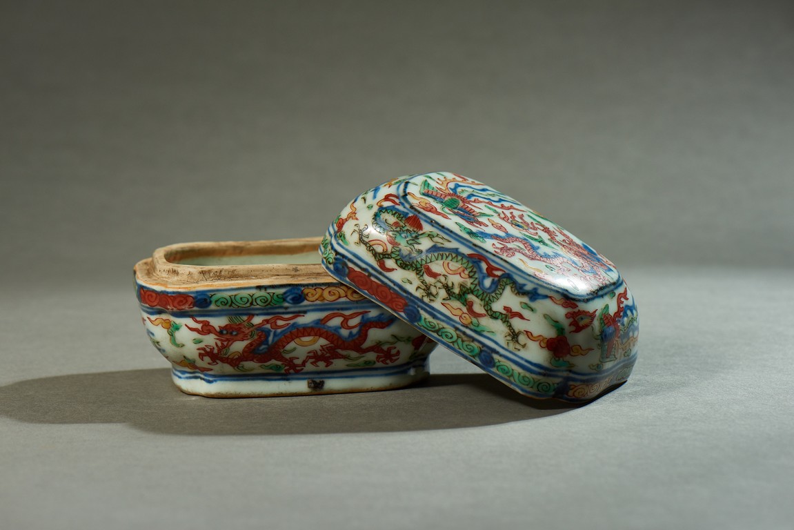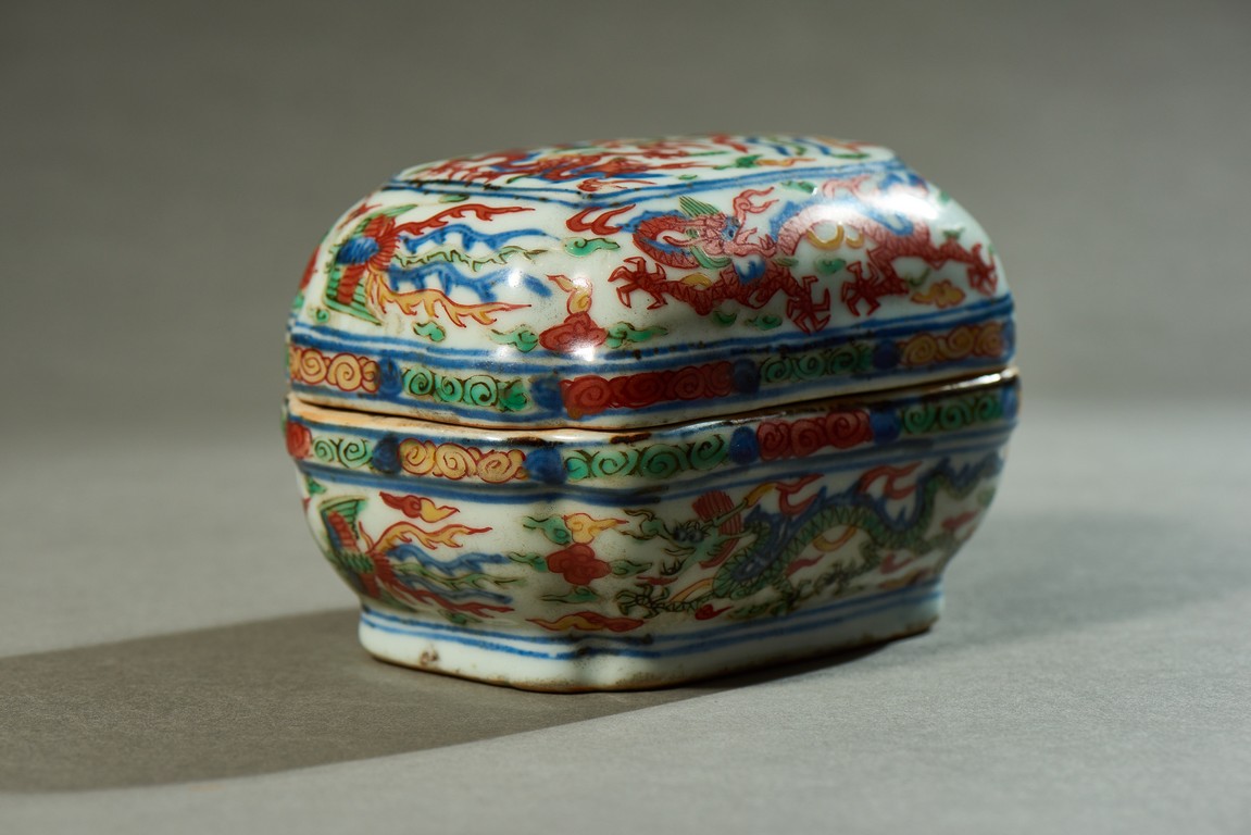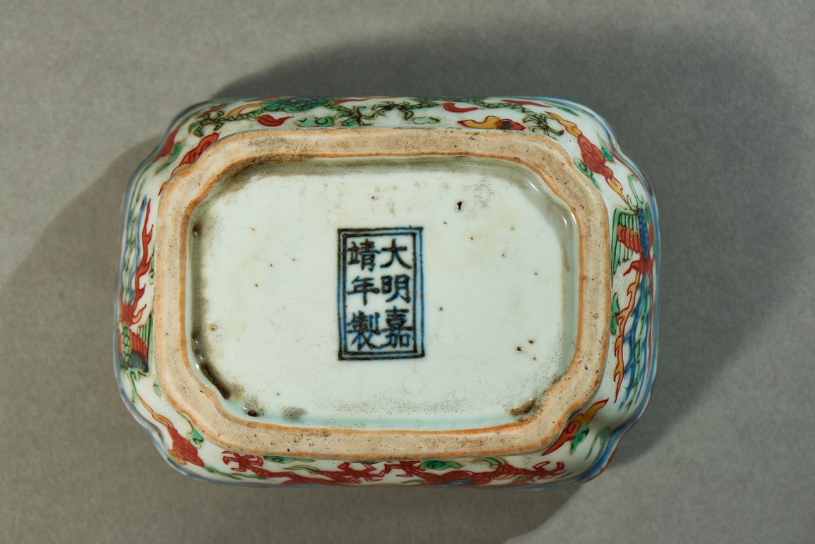 嘉靖彩瓷冠絶一時,其彩畫之詭奇,繪事之偉麗,稱勝於明、清兩代,後世無人可及。蓋盒長方倭角形制,子母口,上下結合緊密,胎體敦實厚重,釉質亮白如玉,釉面肥潤,胎體製作精細,造型端莊秀美。通體以青花五彩為飾,蓋盒繪龍鳳戲珠紋,龍鳳騰躍於祥雲瑞靄之間,所繪龍紋嘴張開,龍發上揚,身形細長,鳳首狀如雞頭而有羽冠,鳳頸細長,鳳尾、翅處理精緻,以多變的色彩使鳳顯得高貴典雅。青花色調深沉藍艷,深入胎骨,為典型高級鈷料之特徵。施彩風格豪邁,繁縟華麗,色澤濃妍,變化豐富,紅彩蒼雅深沉,一如棗皮之色,為典型的嘉靖特徵。 “大明嘉靖年制”款識。