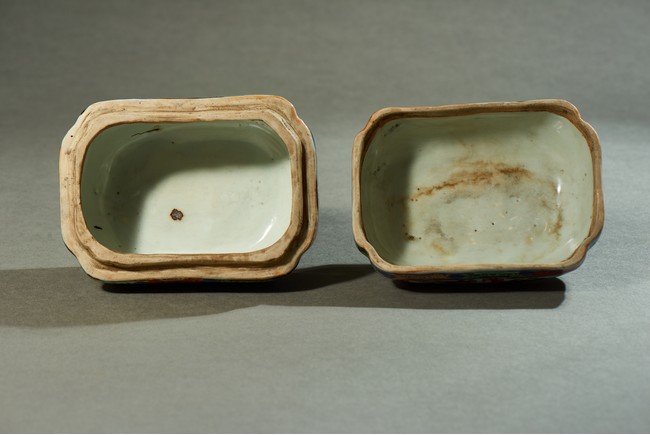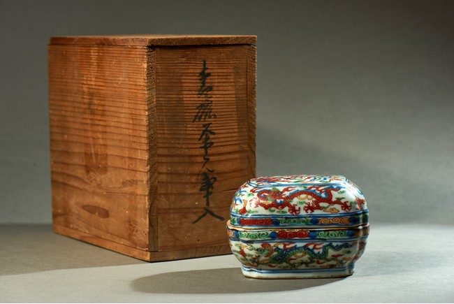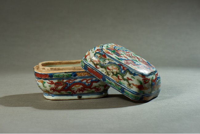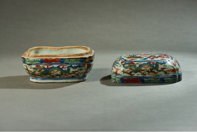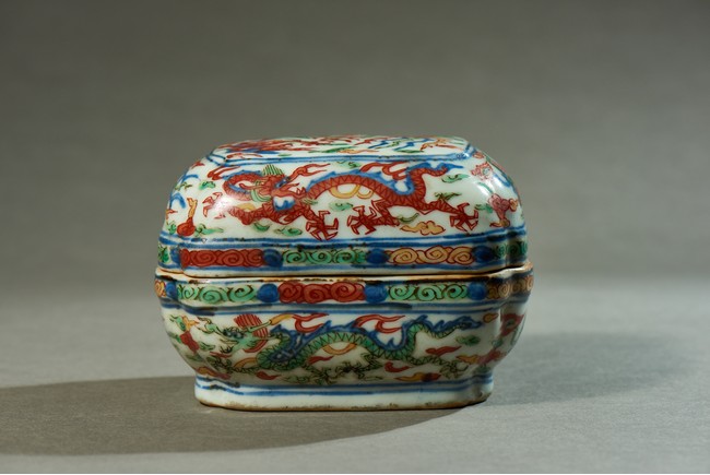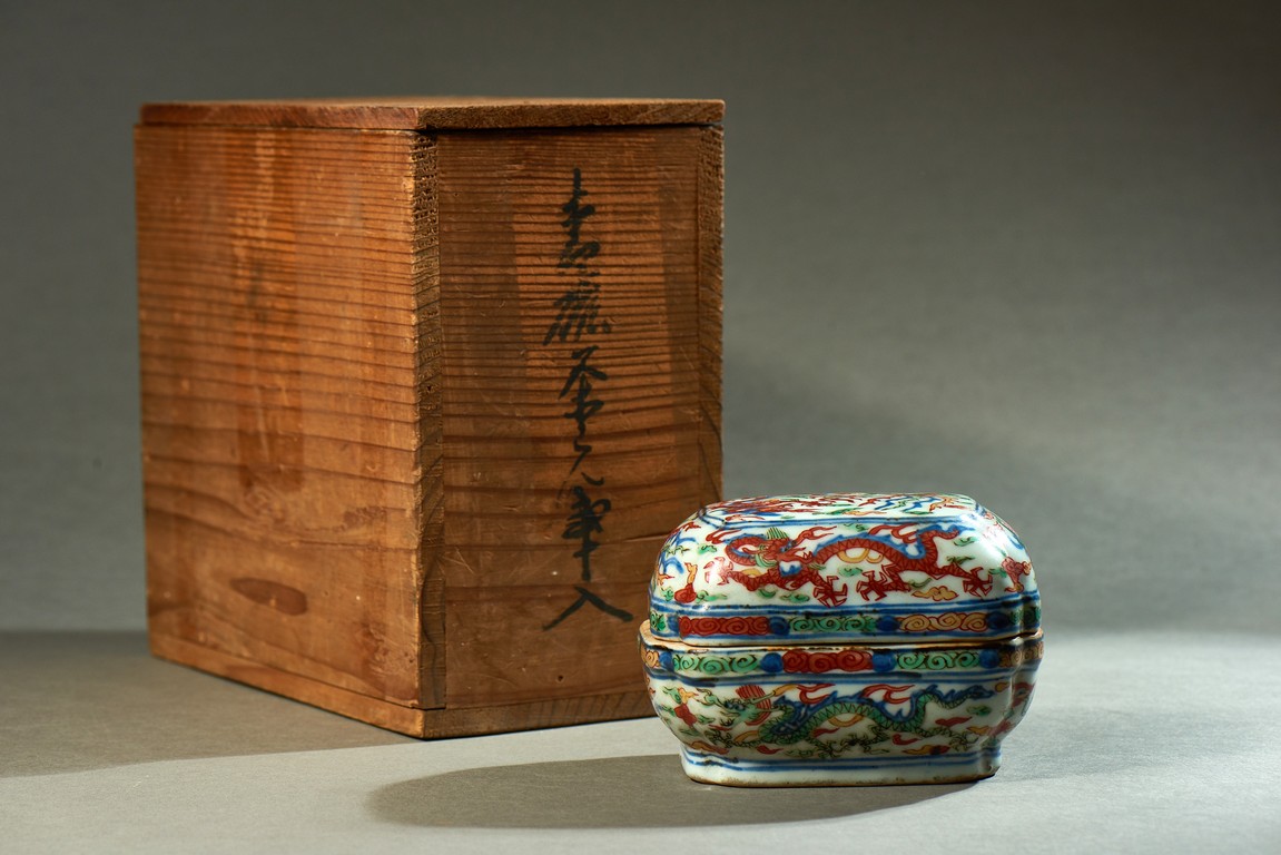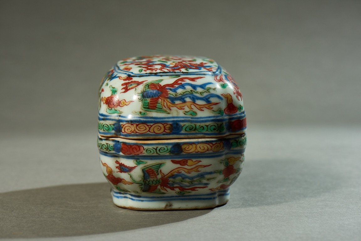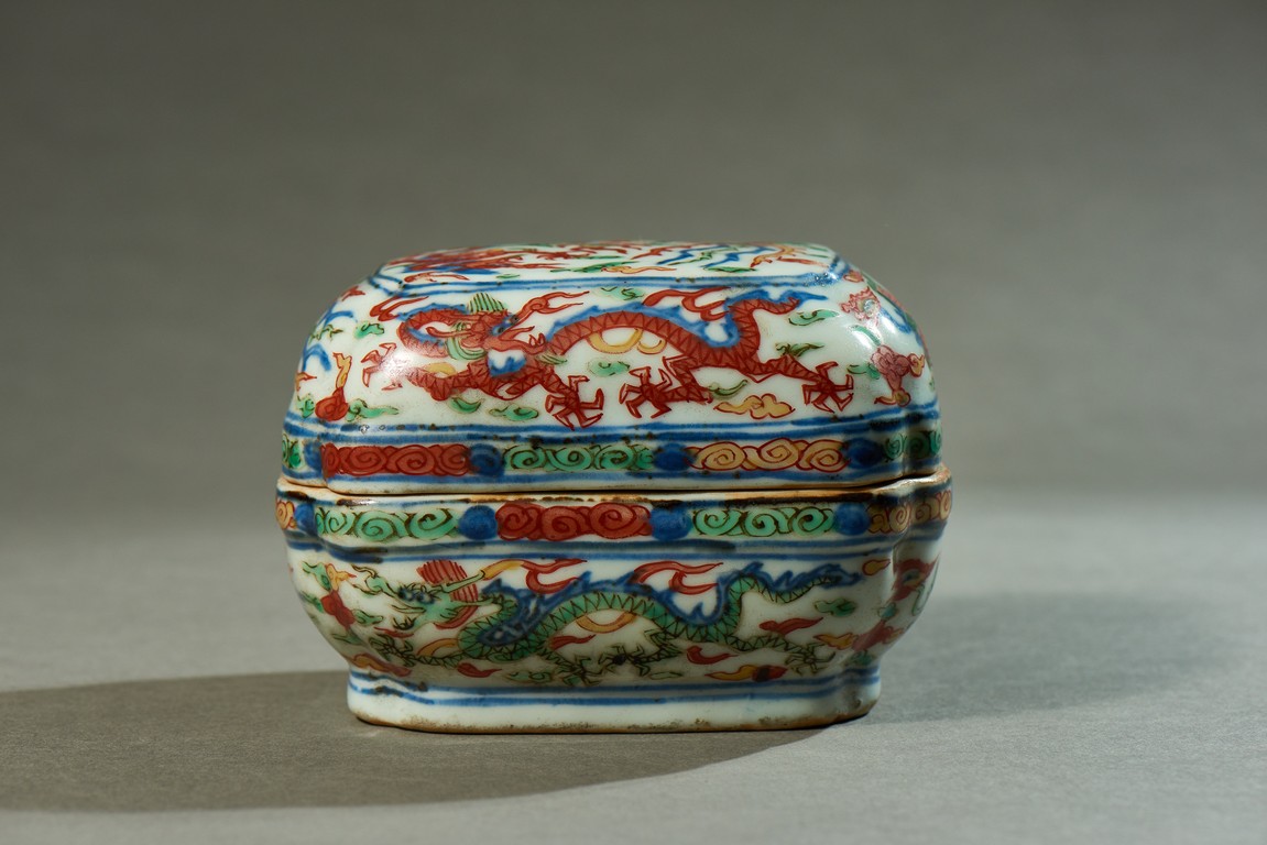 嘉靖彩瓷冠絶一時,其彩畫之詭奇,繪事之偉麗,稱勝於明、清兩代,後世無人可及。蓋盒長方倭角形制,子母口,上下結合緊密,胎體敦實厚重,釉質亮白如玉,釉面肥潤,胎體製作精細,造型端莊秀美。通體以青花五彩為飾,蓋盒繪龍鳳戲珠紋,龍鳳騰躍於祥雲瑞靄之間,所繪龍紋嘴張開,龍發上揚,身形細長,鳳首狀如雞頭而有羽冠,鳳頸細長,鳳尾、翅處理精緻,以多變的色彩使鳳顯得高貴典雅。青花色調深沉藍艷,深入胎骨,為典型高級鈷料之特徵。施彩風格豪邁,繁縟華麗,色澤濃妍,變化豐富,紅彩蒼雅深沉,一如棗皮之色,為典型的嘉靖特徵。 “大明嘉靖年制”款識。