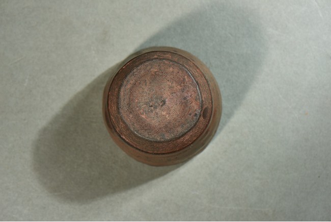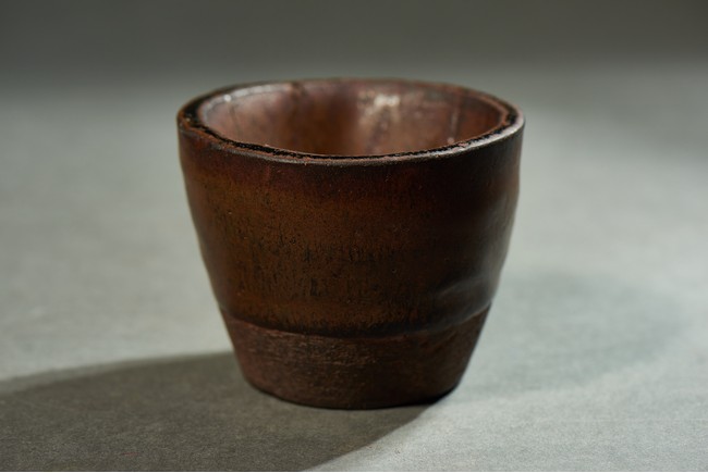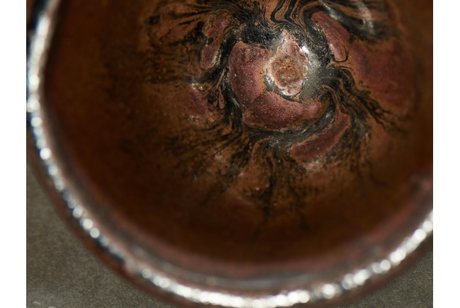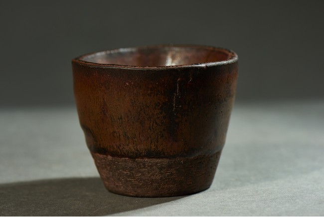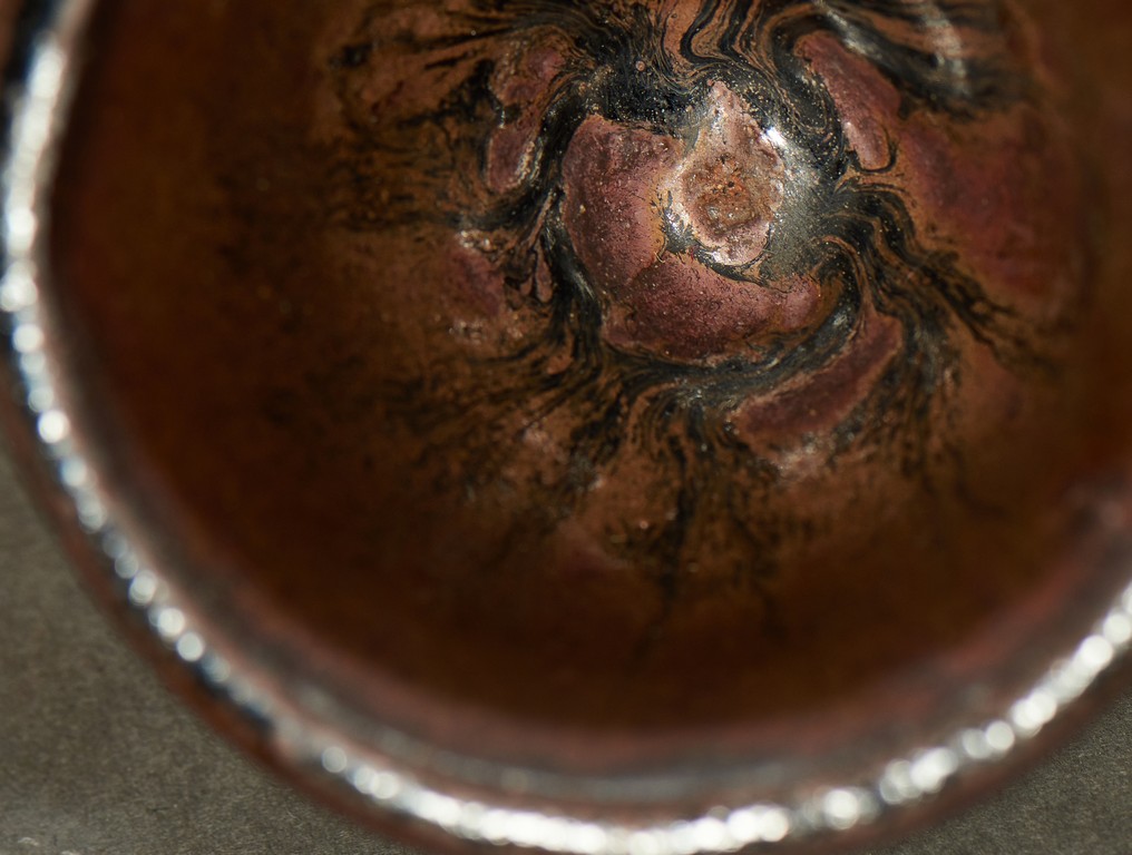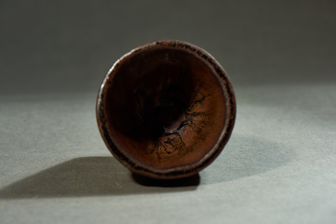 Exterior applied with brown glaze thinning at the rim, the interior and exterior accentuated with short black streaks, the glaze falling short of the foot to reveal the brown stoneware body.