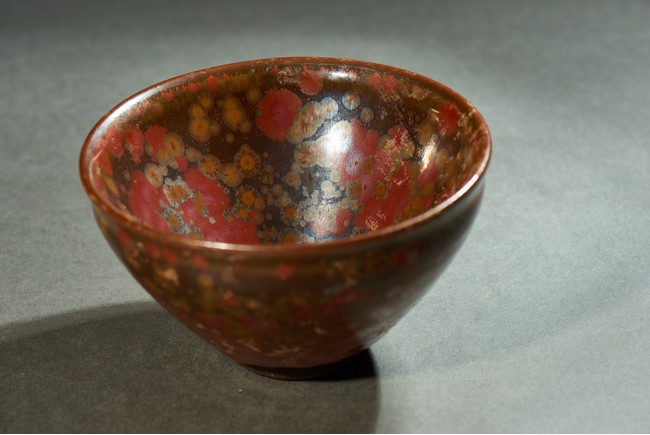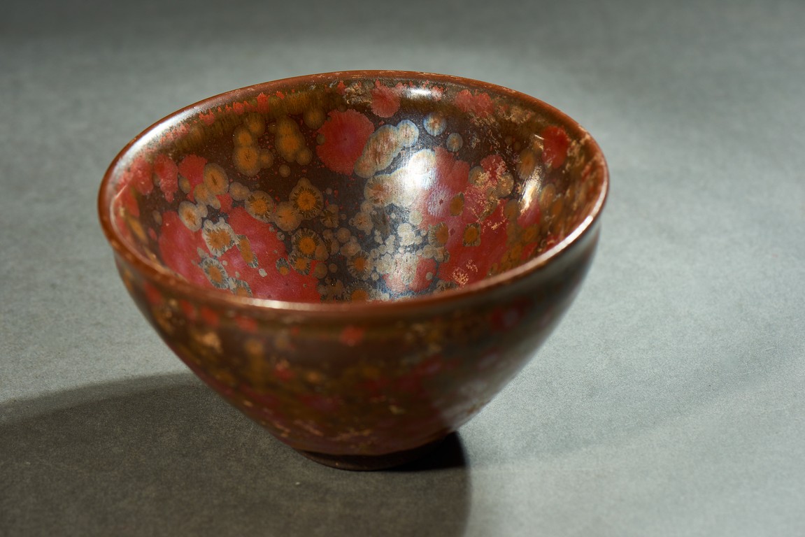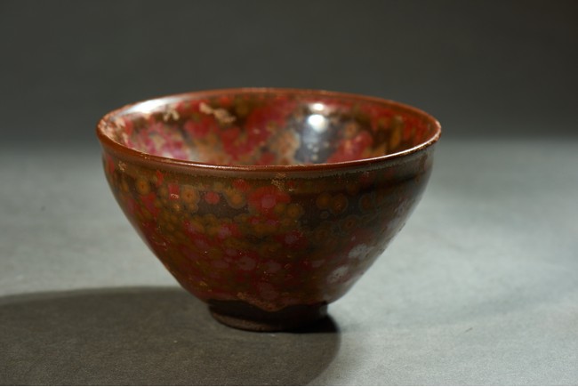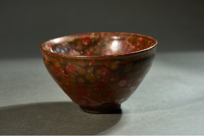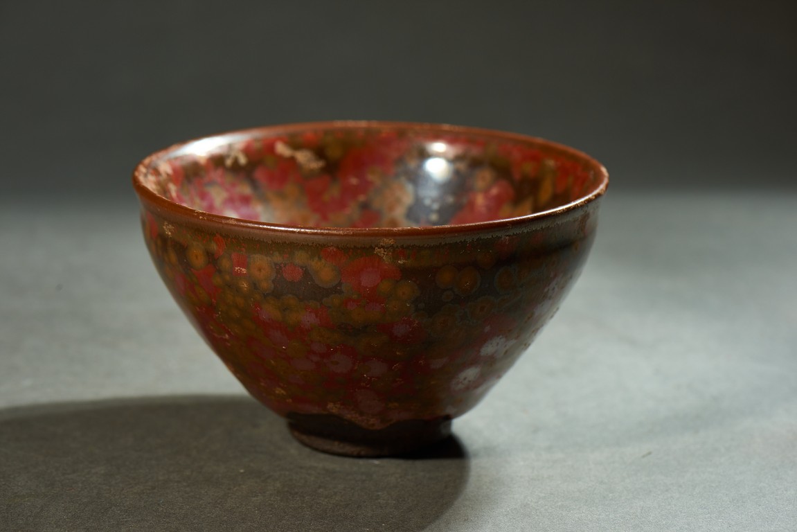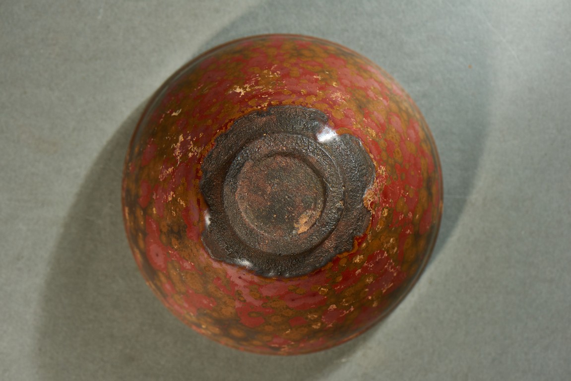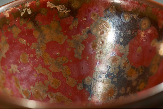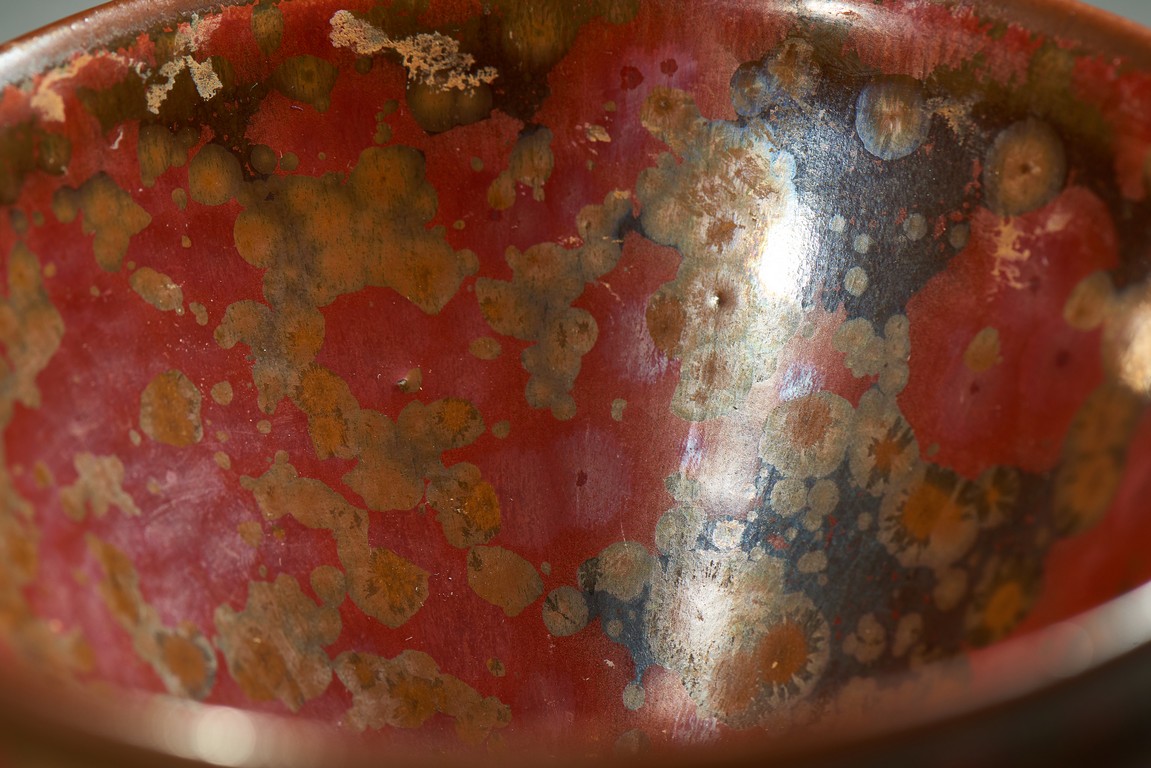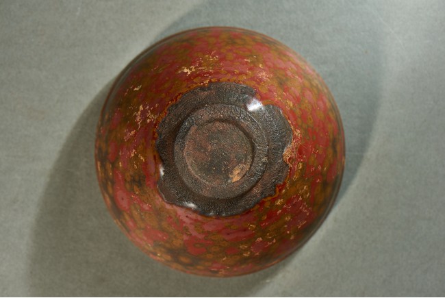 Potted with a narrow groove encircling the exterior below the rim, covered overall in russet glaze and scattered with red and yellow spots.