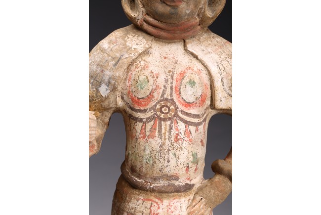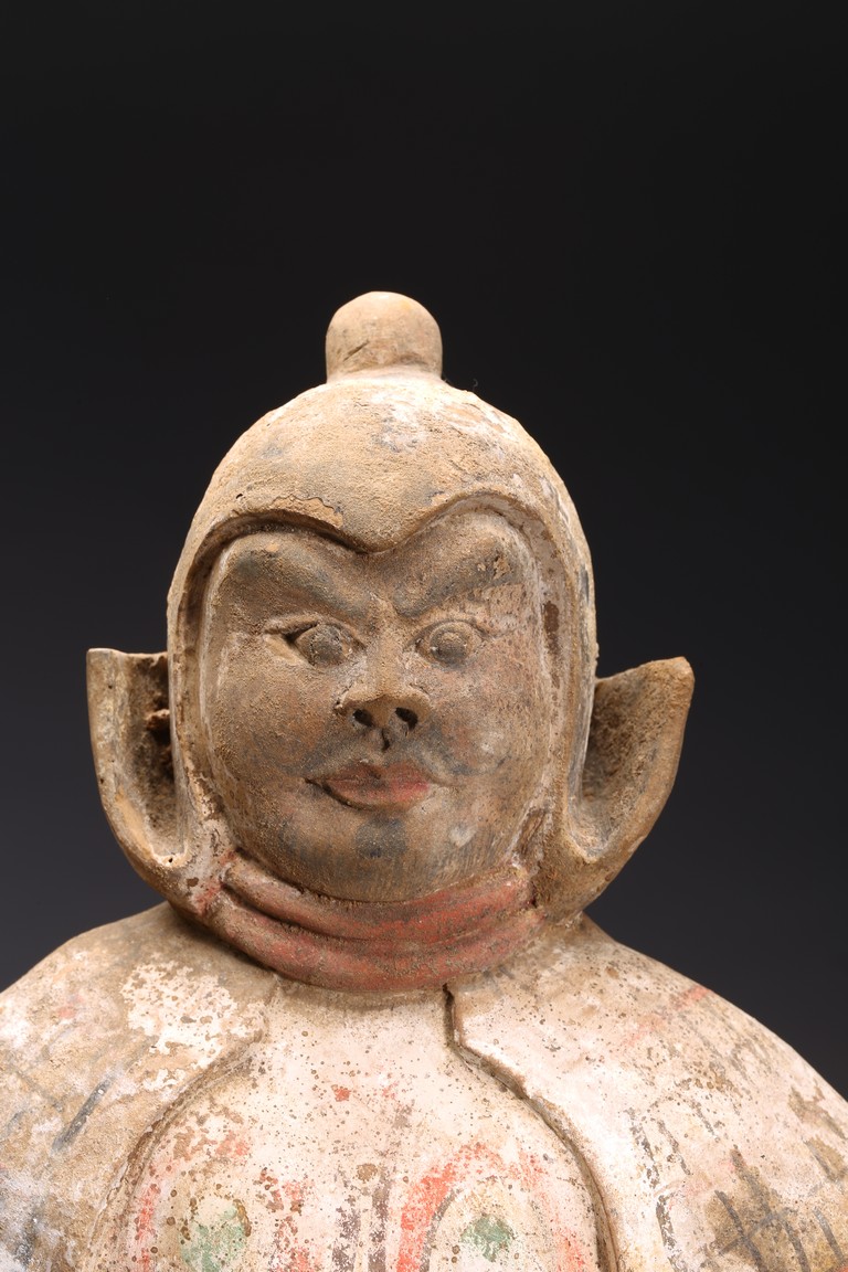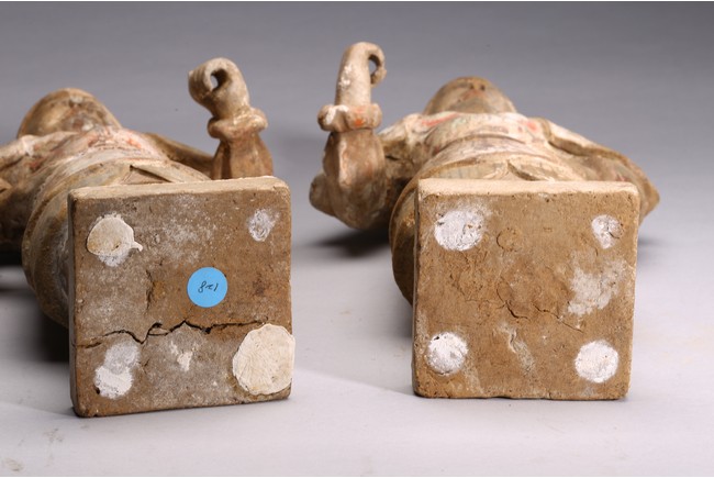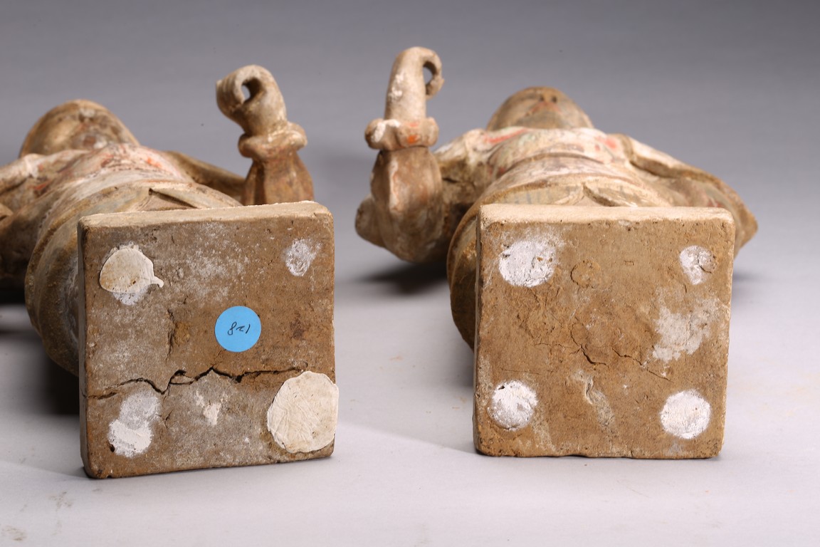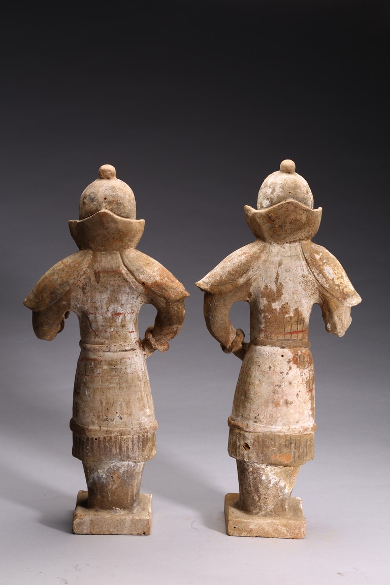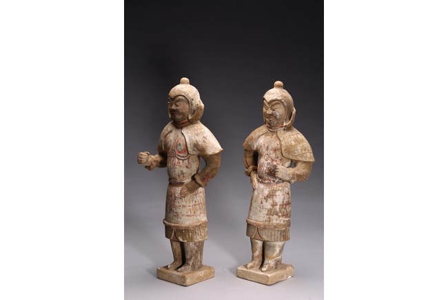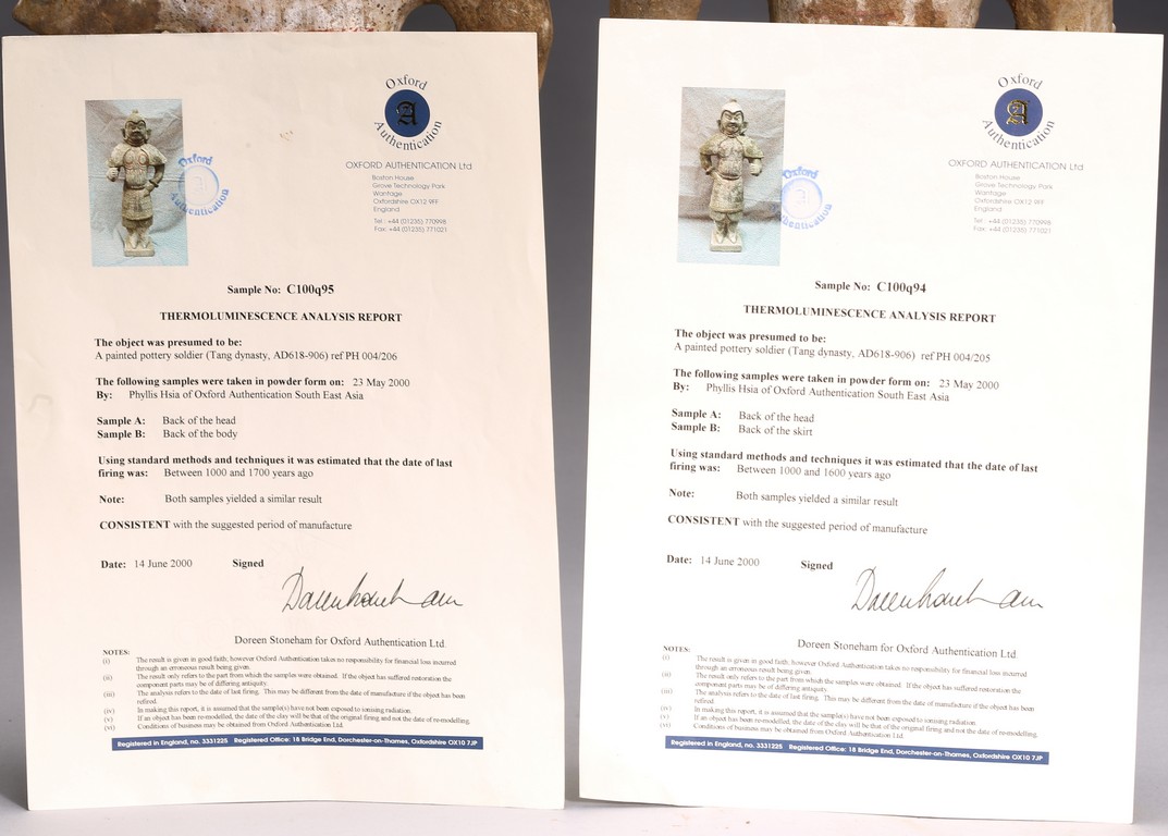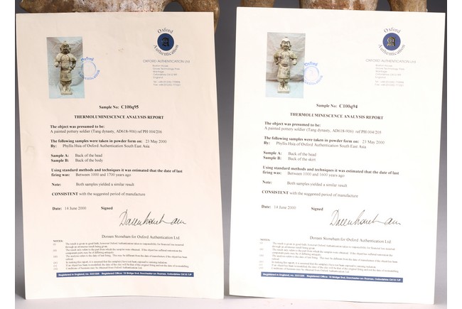Each modelled with fierce expression framed by helmet, wearing armor bearing traces of paint, one hand on the hip and the other hand as if holding halberd, with traces of orangy-red, green pigment, black pigments. Accompanied with 2000 Oxford Thermoluminence Analysis Report Tang Dynasty period.