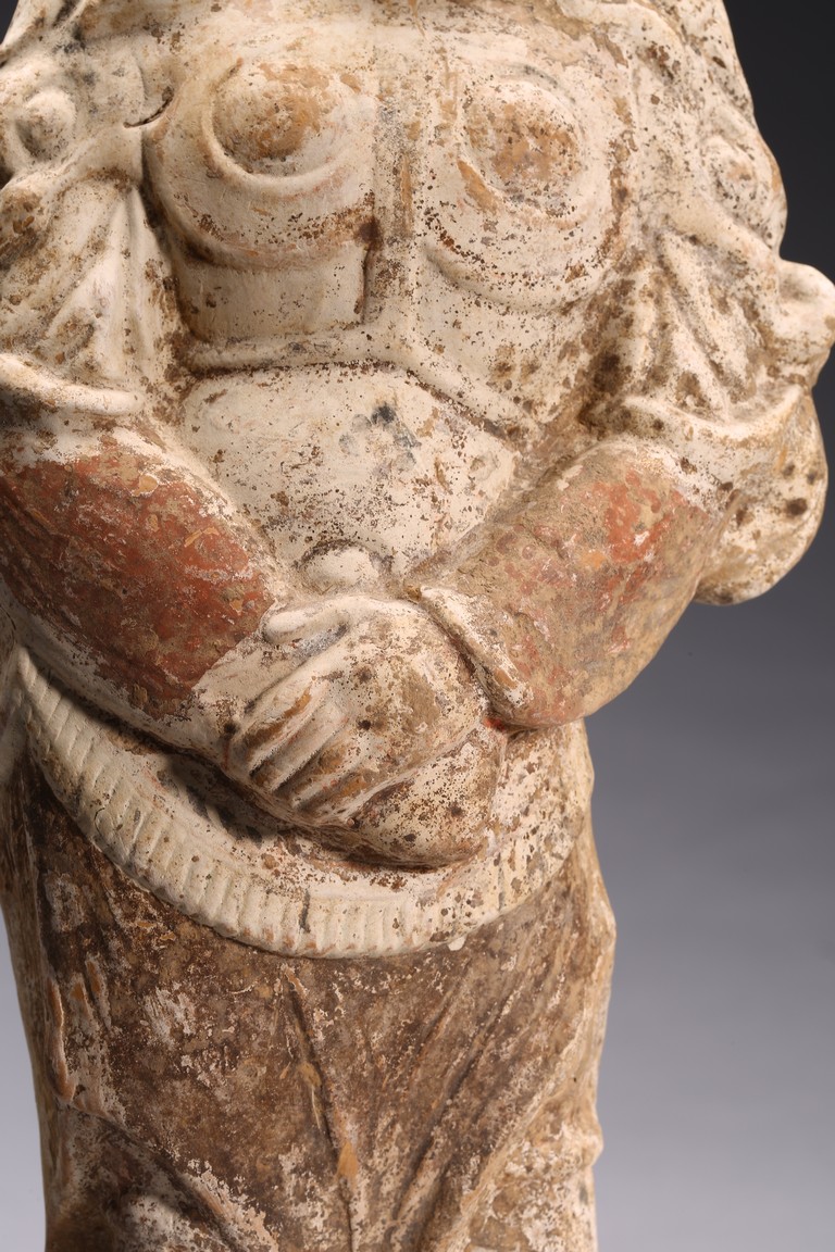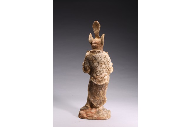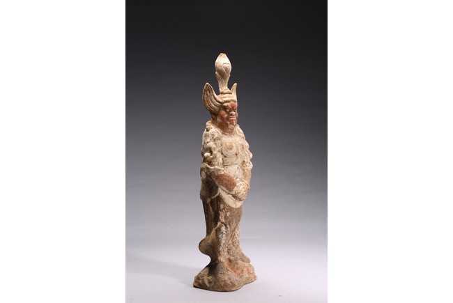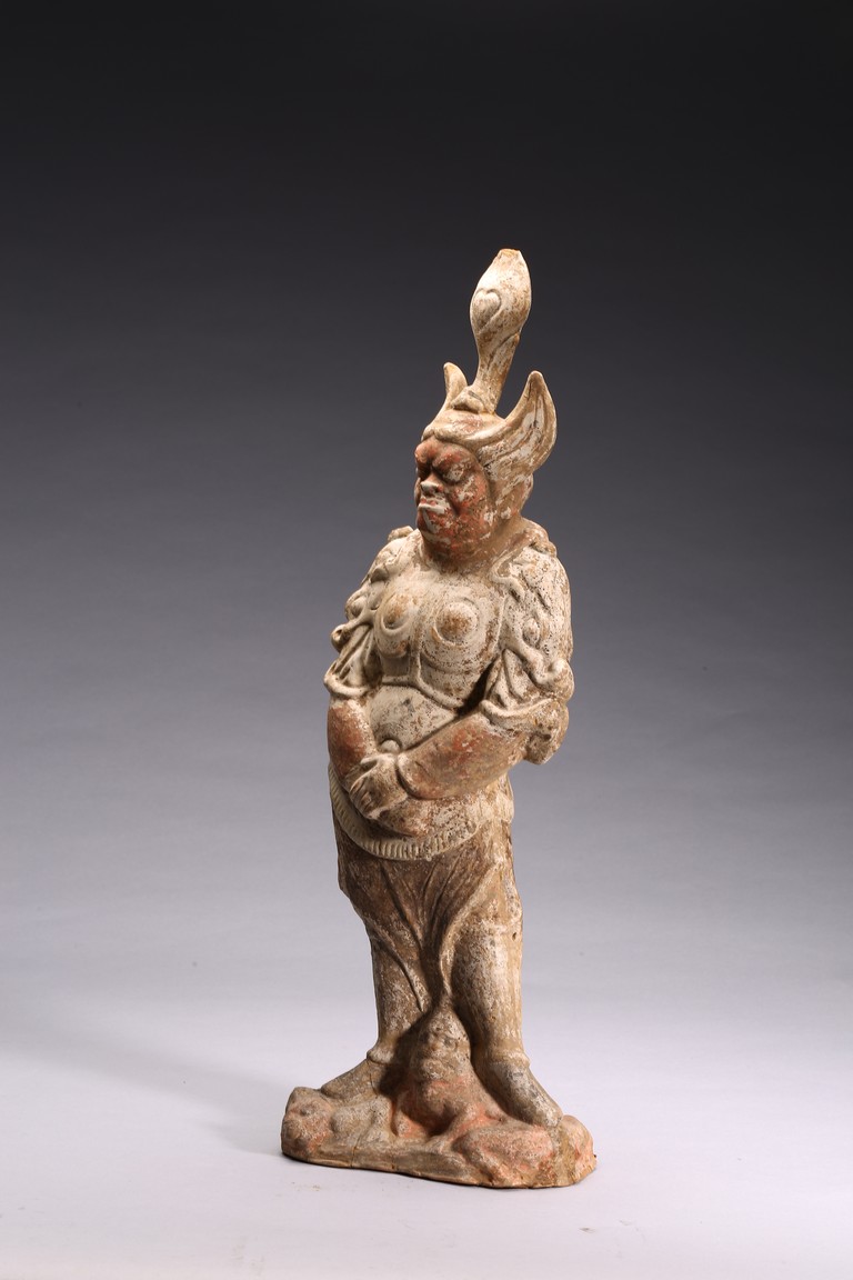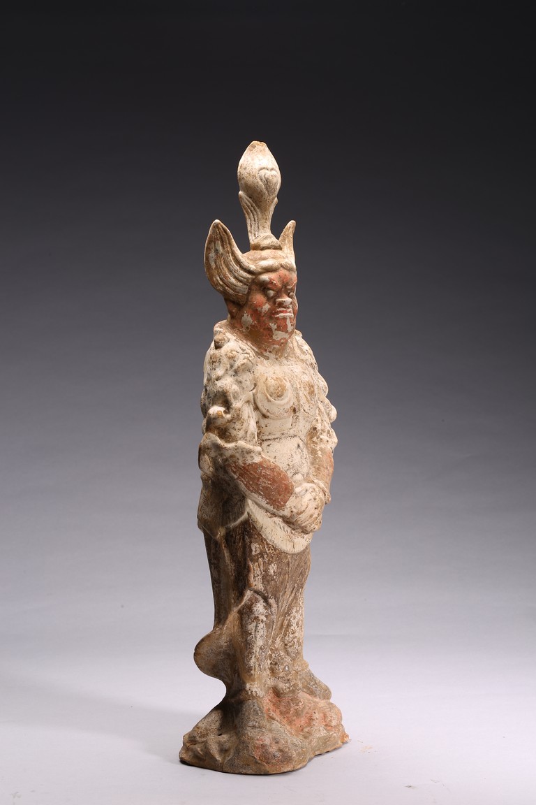 The guardian king is shown standing wearing full armor, both hands held together in front, the head vigorously modeled with bulbous eyes, flared nostrils, thick, framed by tall phoenix helmet. Accompanied with 2000 Oxford Thermoluminence Analysis Report. Tang Dynasty period.