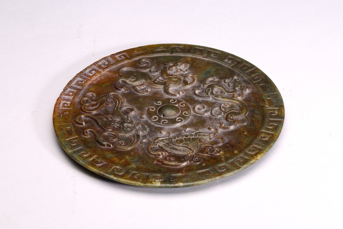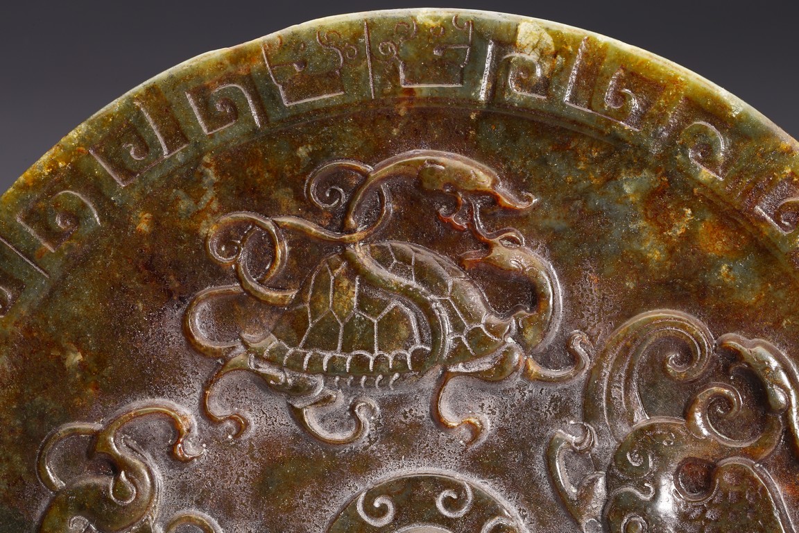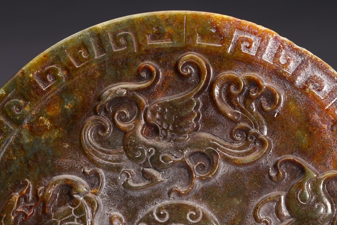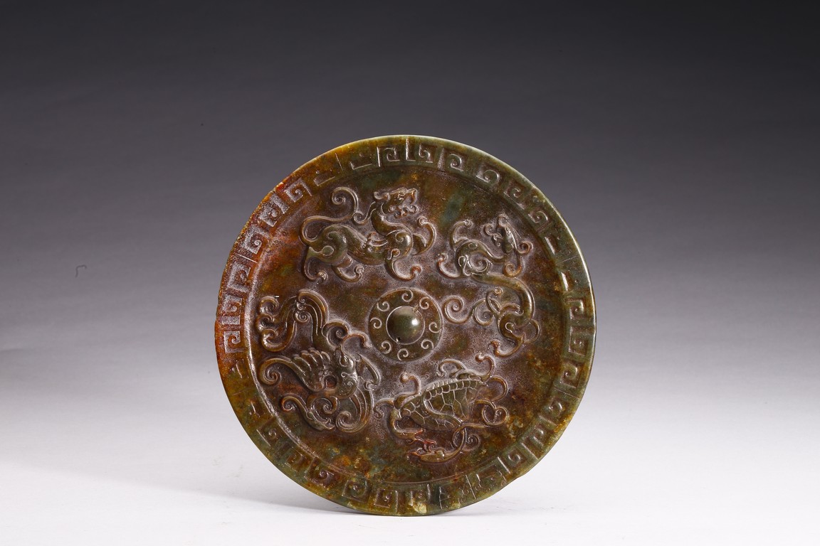 Of circular form, carved with four mythical beasts 'turtle, tiger, dragon, and phoenix ' around the central knob. The stone is of green tone with russet inclusions.