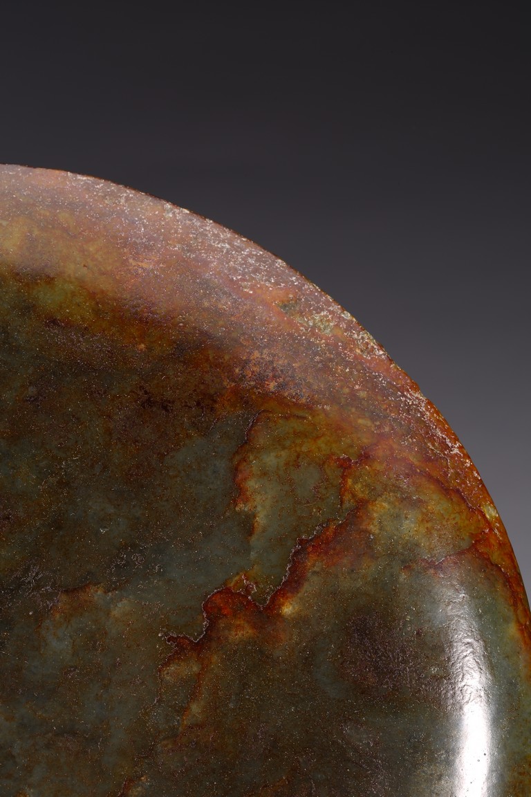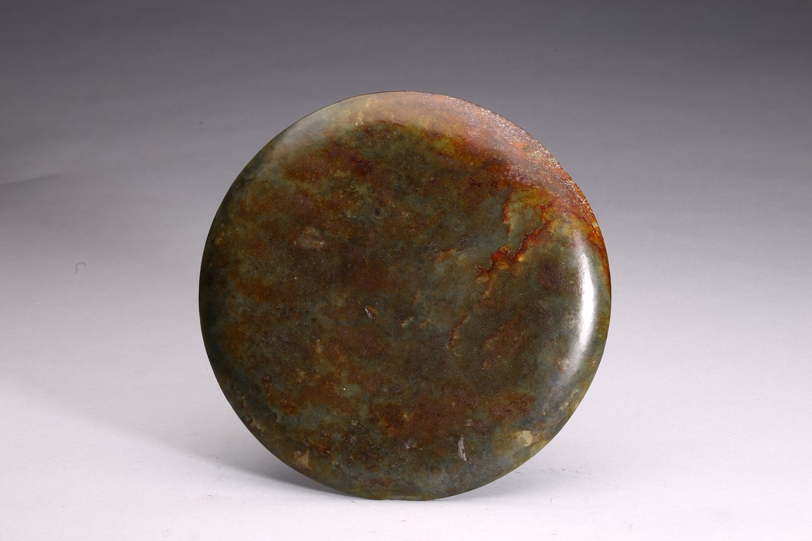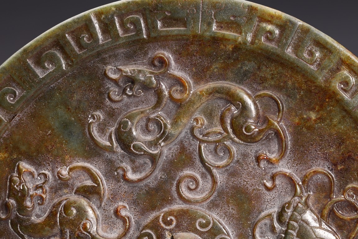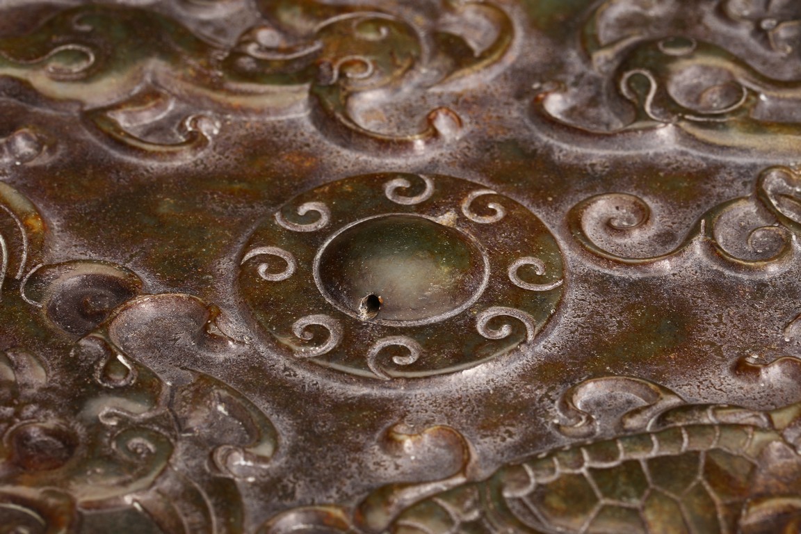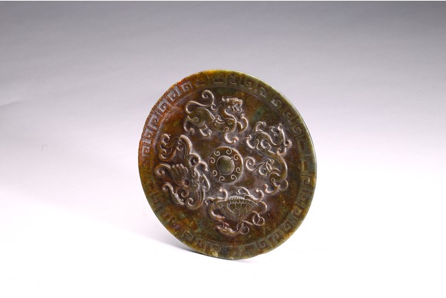 Of circular form, carved with four mythical beasts 'turtle, tiger, dragon, and phoenix ' around the central knob. The stone is of green tone with russet inclusions.