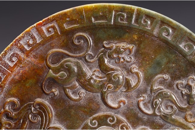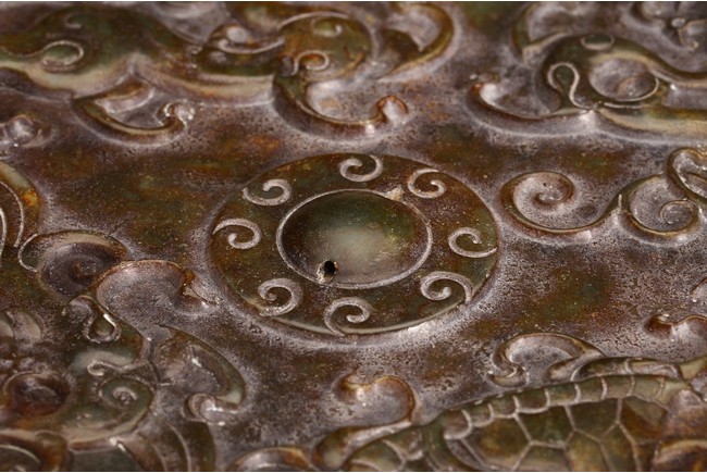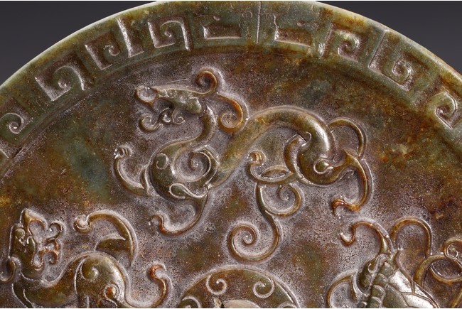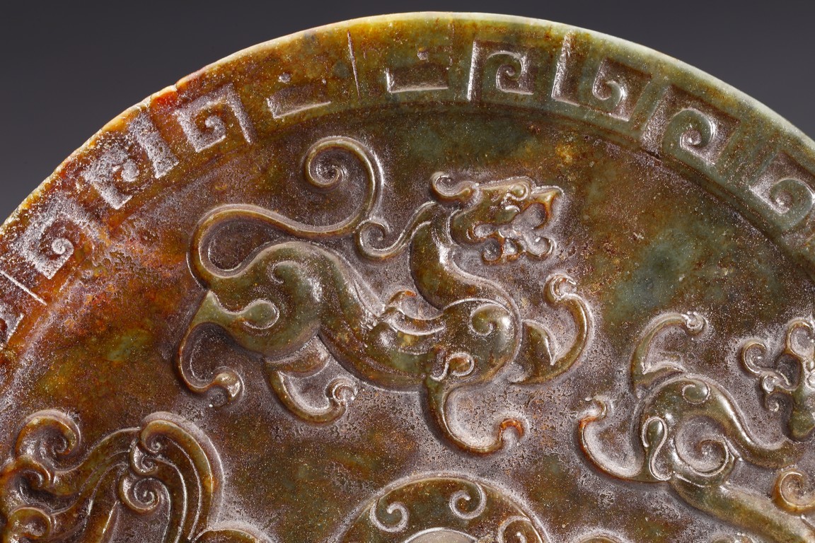 此器物為玉雕鏡子,上刻中國古代四大神獸。青龍、白虎、朱雀、玄武,這四大神獸都有祛邪、避災、祈福的功效,且都有著特別吉祥的寓意。朱雀神鳥是祥瑞的象徵;龜和蛇壽命都很長,所以由它們組成的玄武便像徵長壽;青龍和白虎是門神,用於鎮守道觀,也就是道教常說的“左青龍,右白虎”。古代用玉雕刻鏡子實屬少有,且珍貴。