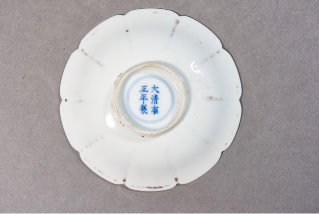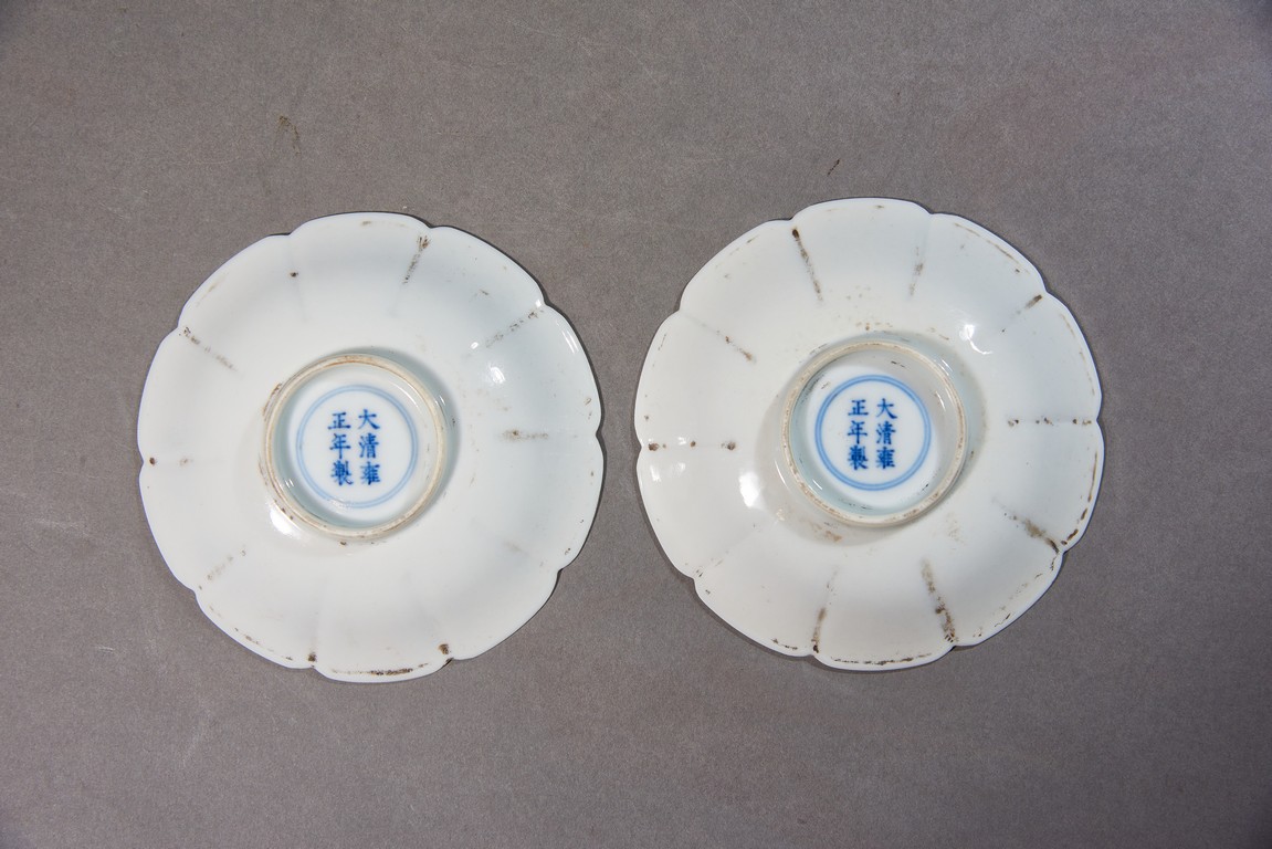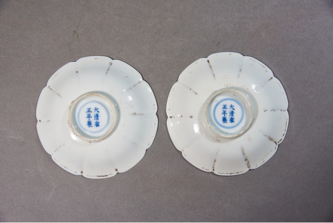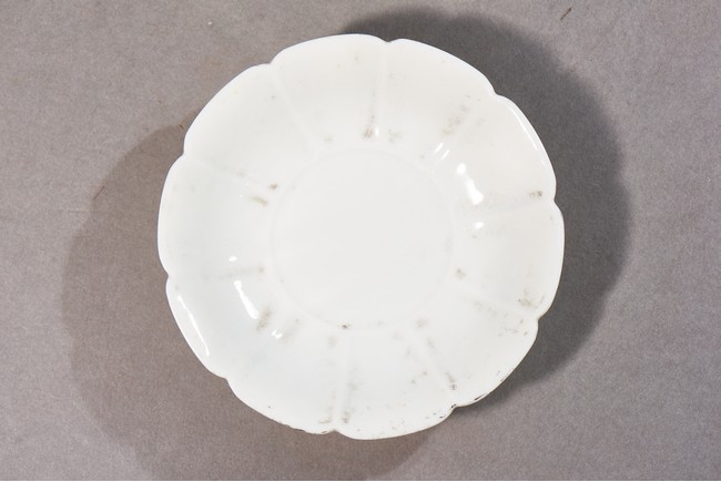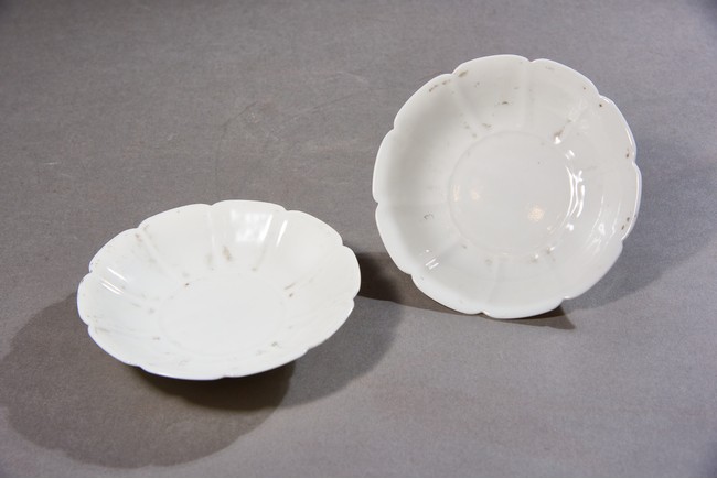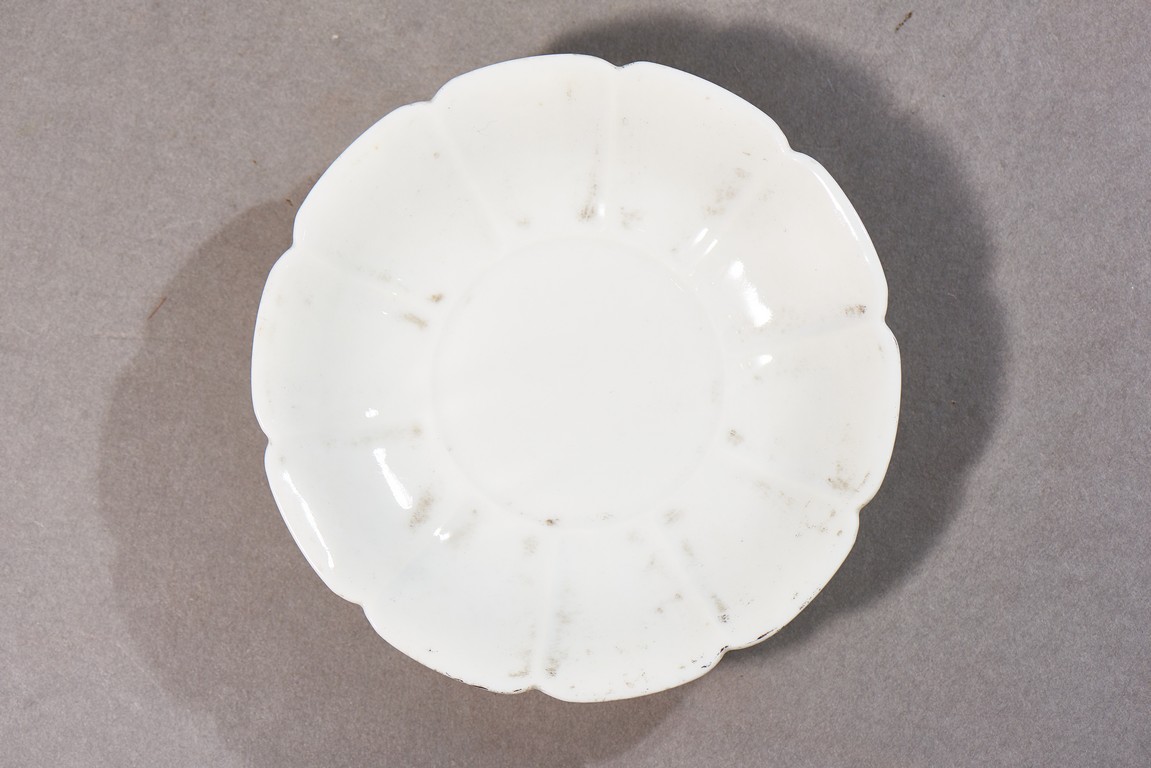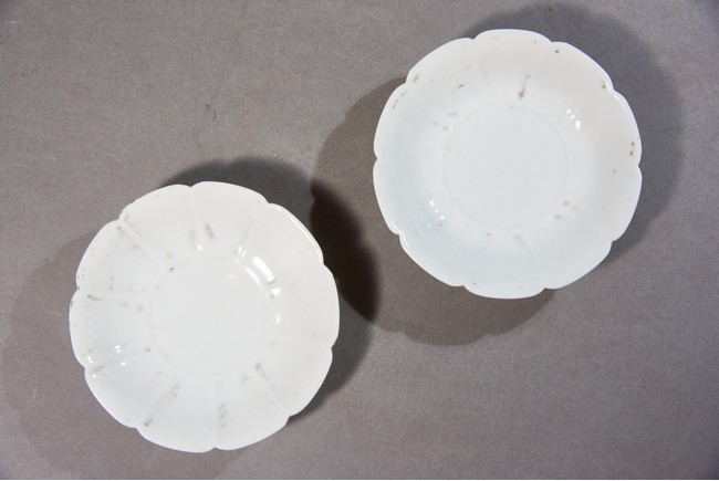 Each dish modelled in the form of chrysanthemum formed petals, the dish overall covered in white glaze, base inscribed with mark. Qing Dynasty period.