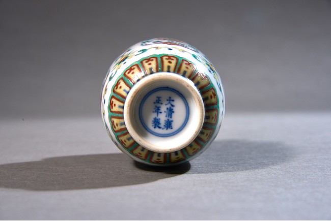 Of ovoid form, the exterior decorated with stylized lotus flower flanked by a pair of bats interspersed by floral scrolls, all between ruyi head border and upright lappet border, the base inscribed with six character Yongzheng mark. Qing Dynasty period.