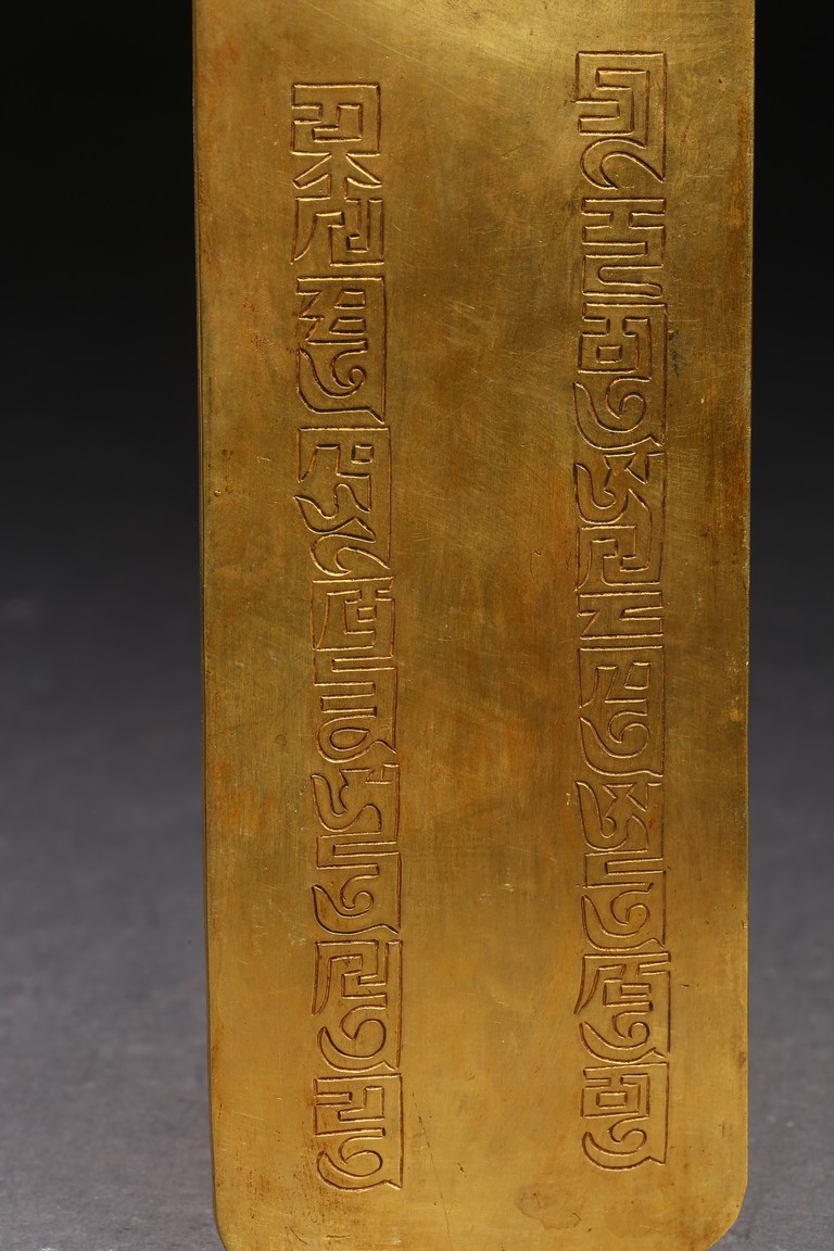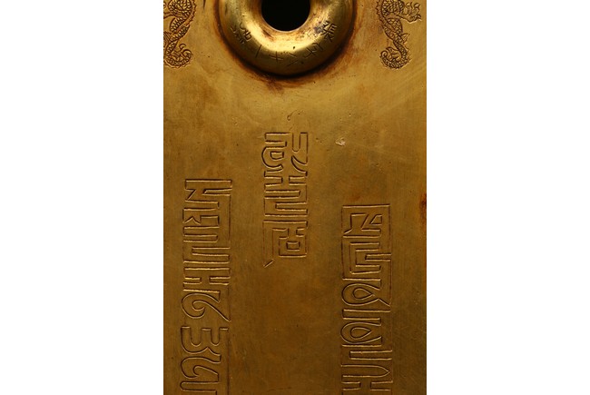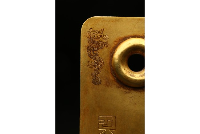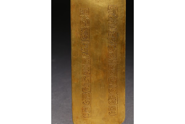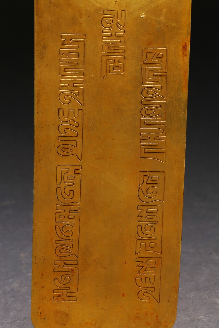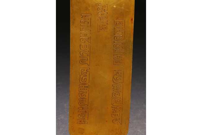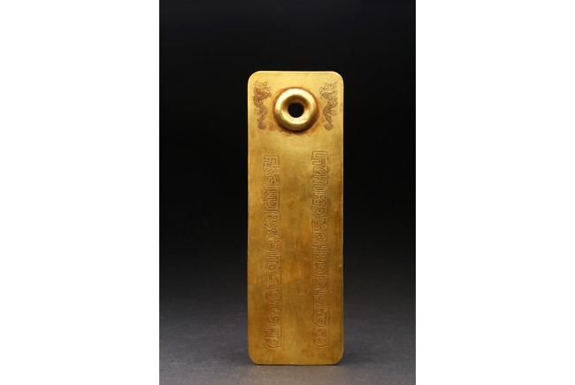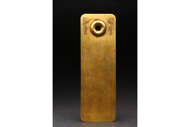 Of rounded rectangular form, the panel decorated with a pair of dragons flanking raised central aperture to one end, the lower part inscribed with three columns of Phags-pa script, the reverse similarly inscribed. Yuan Dynasty period.