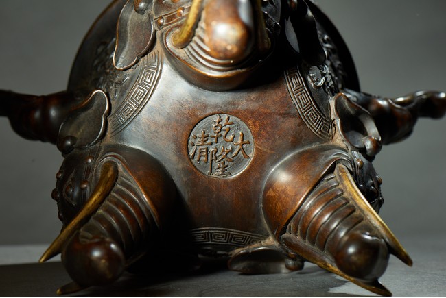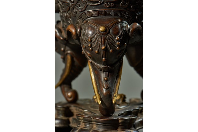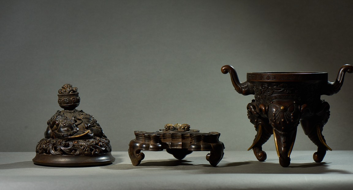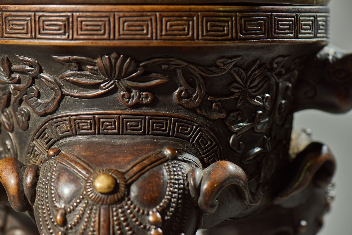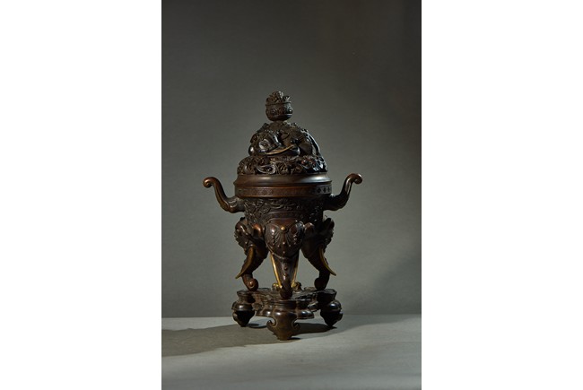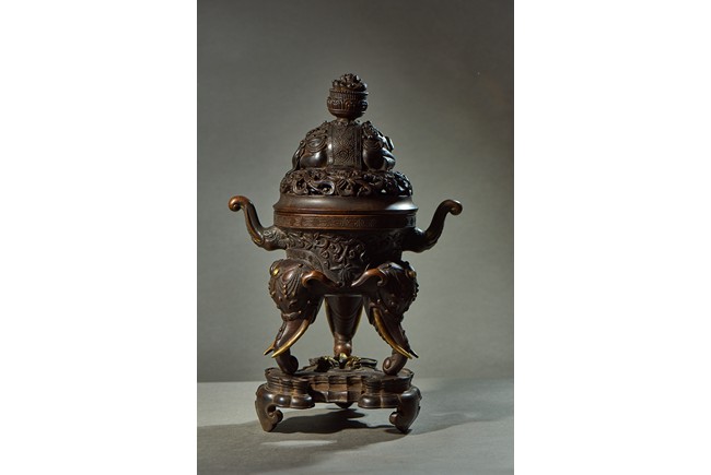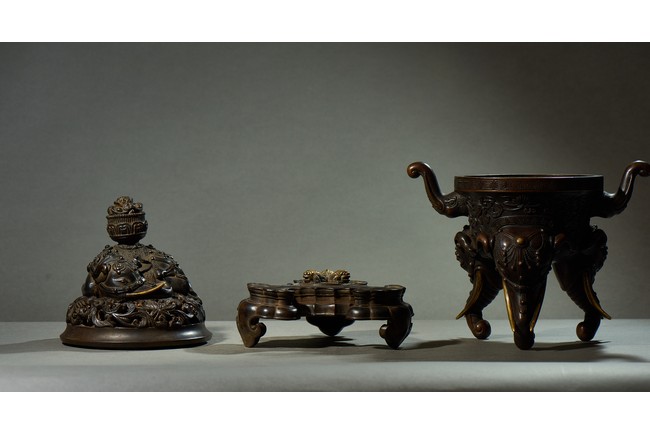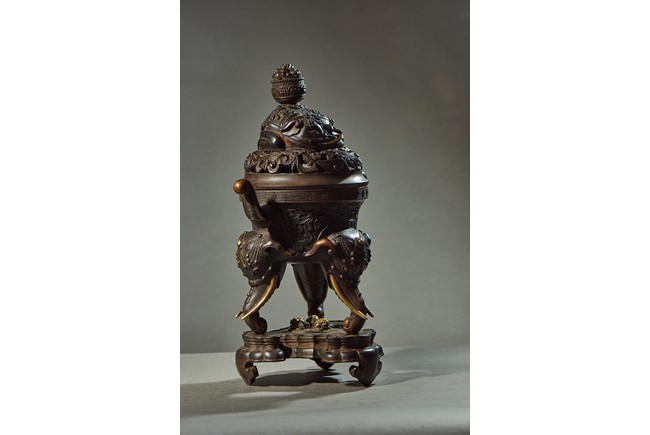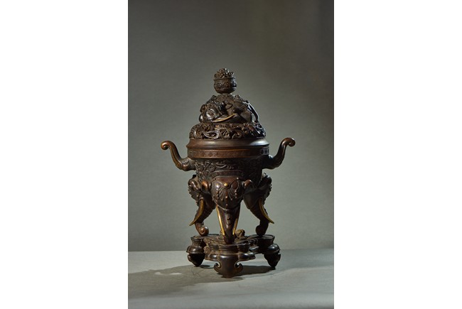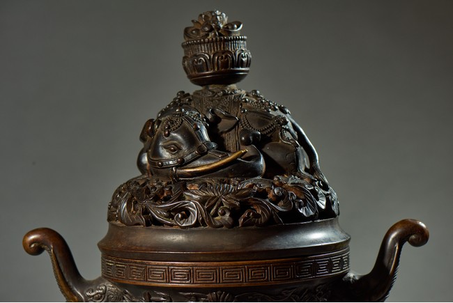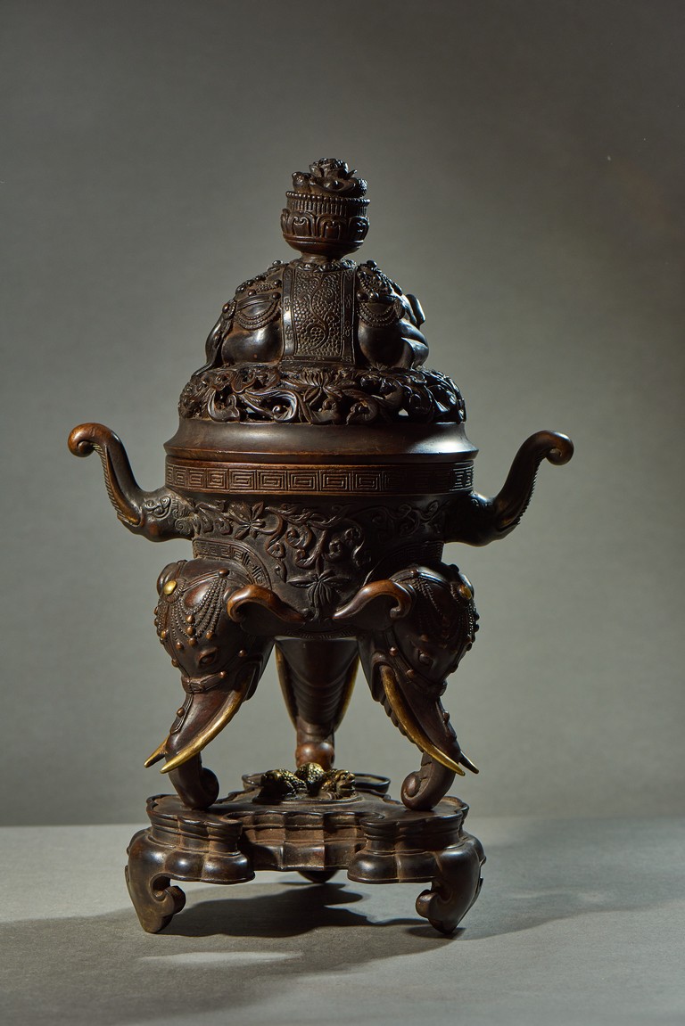 器仿周代青銅鼎造型,頂部臥像為鈕,上承寶盆,寓意「太平有像」,爐內子母口,口沿飾迴紋一週,兩側置像首立耳,像鼻高舉外卷,下承像首三足。 “大清乾隆”款識。配有座子。 「太平有像」為中國傳統吉祥紋樣,即天下太平、五穀豐登的意思,「像」象徵強壯、智慧、聰明以及永久的和諧,為中國器物常見的吉祥裝飾。此類器形陳於廳堂之中,或置於案台之上,以求「四海昇平、吉祥平安」之福瑞。