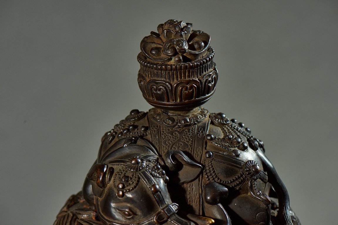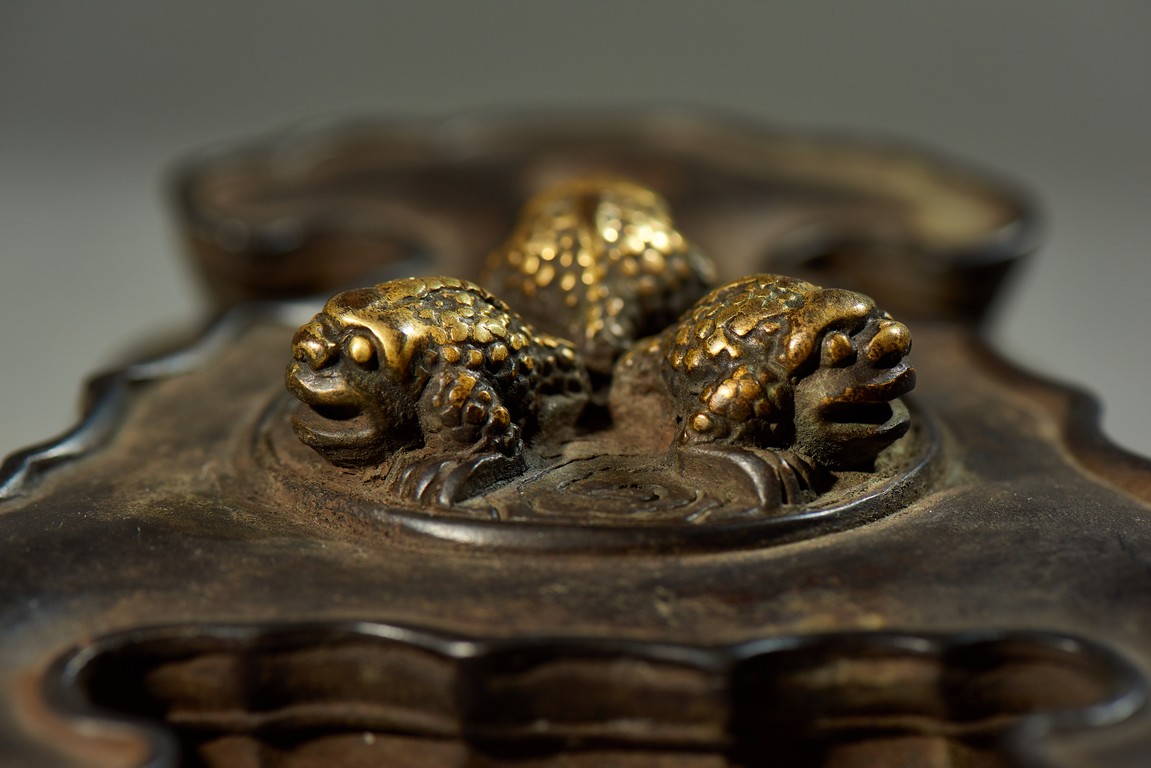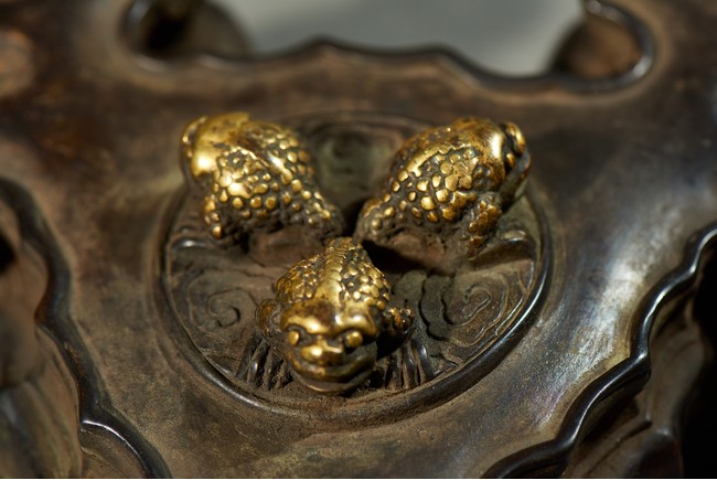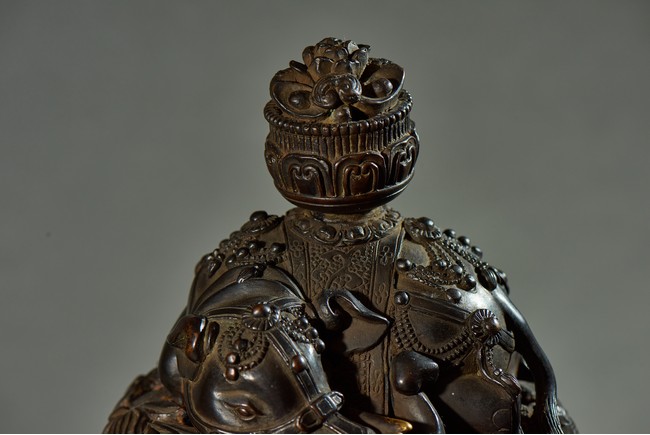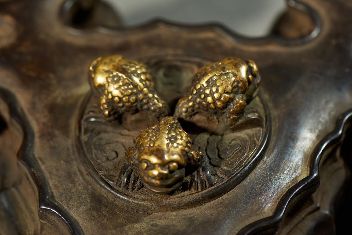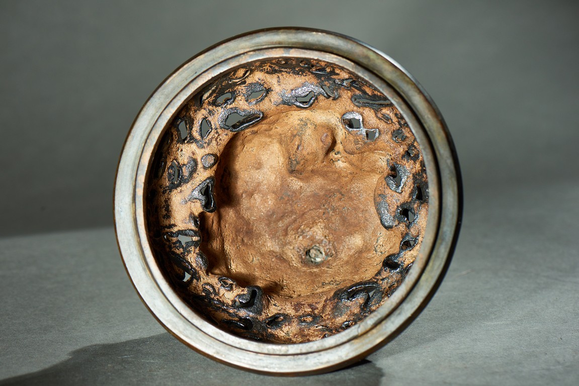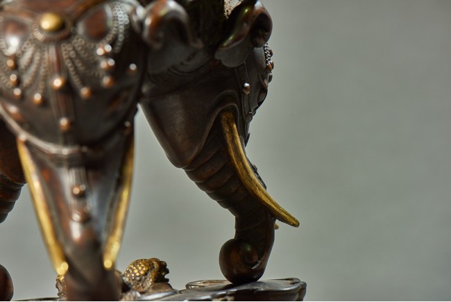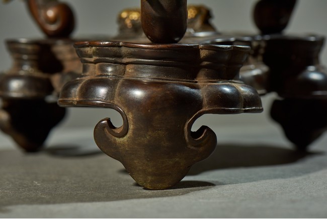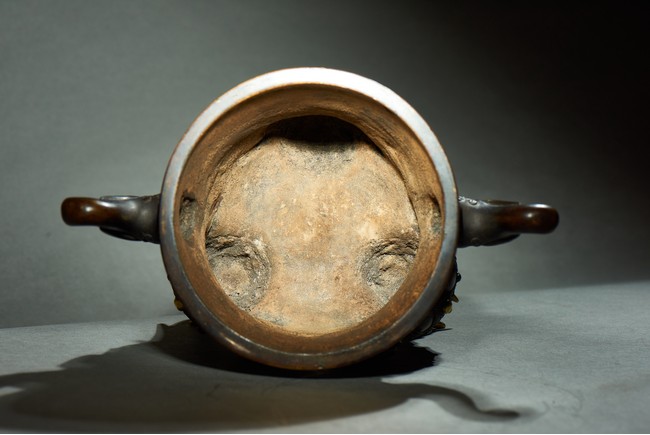 器仿周代青銅鼎造型,頂部臥像為鈕,上承寶盆,寓意「太平有像」,爐內子母口,口沿飾迴紋一週,兩側置像首立耳,像鼻高舉外卷,下承像首三足。 “大清乾隆”款識。配有座子。 「太平有像」為中國傳統吉祥紋樣,即天下太平、五穀豐登的意思,「像」象徵強壯、智慧、聰明以及永久的和諧,為中國器物常見的吉祥裝飾。此類器形陳於廳堂之中,或置於案台之上,以求「四海昇平、吉祥平安」之福瑞。