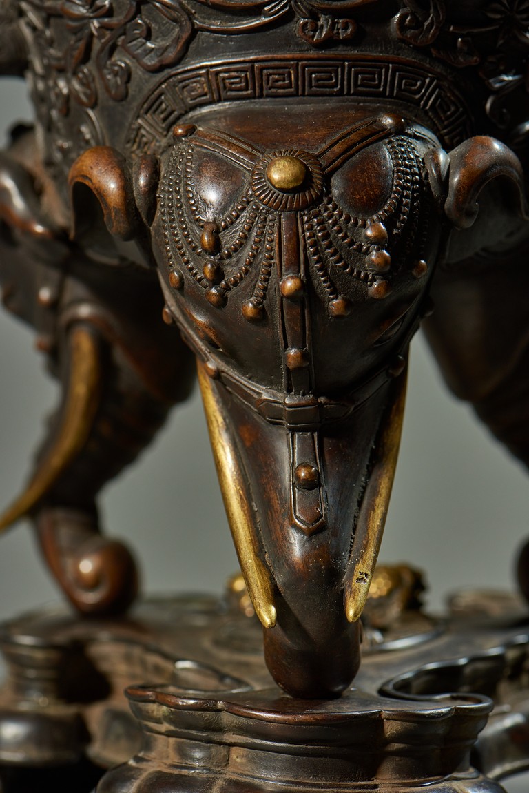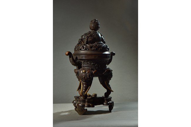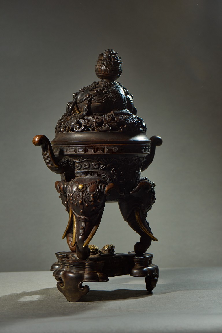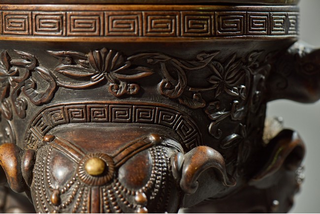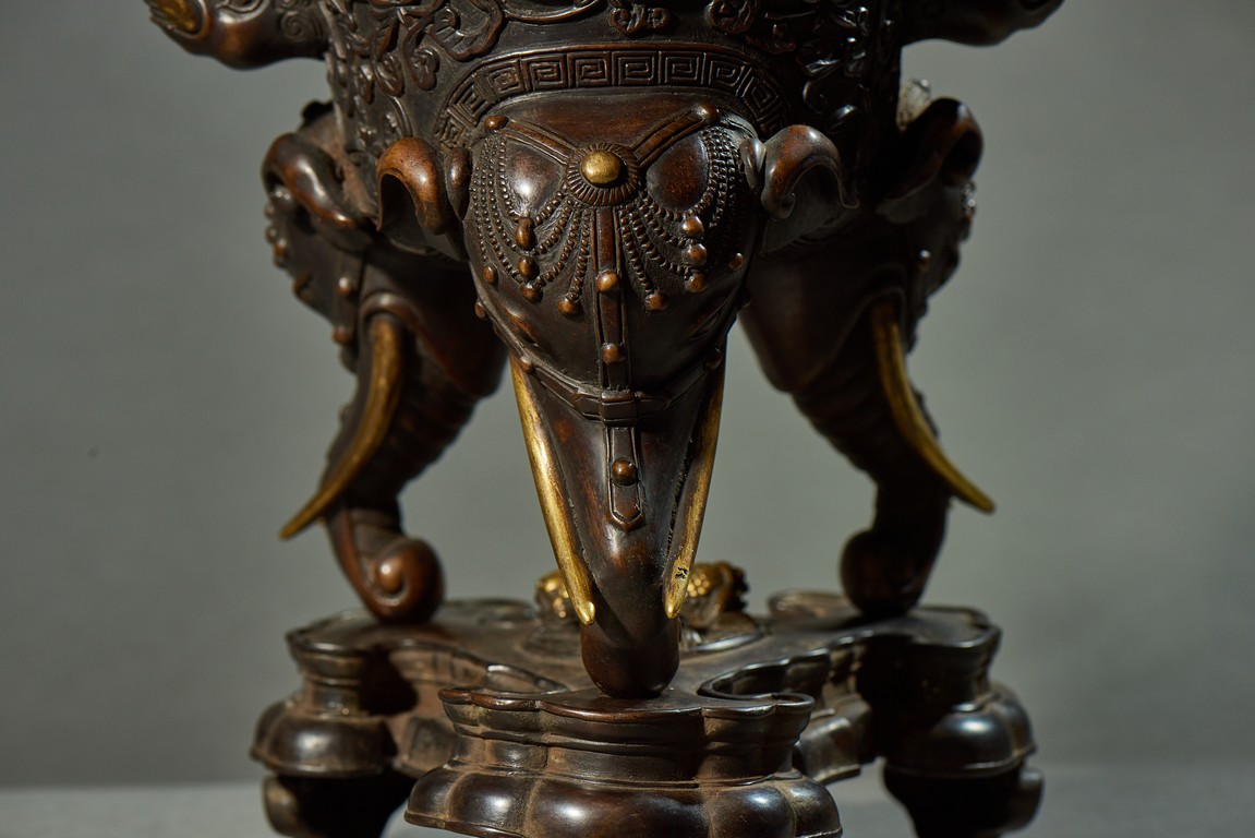 The body standing on three large elephant-head legs below relief-cast lotus meander and two elephant heads raised and trunks extended to form handles, the domed cover pierced with further lotus below a recumbent elephant, all supported on stand, base with four character mark. Qing Dynasty period.
