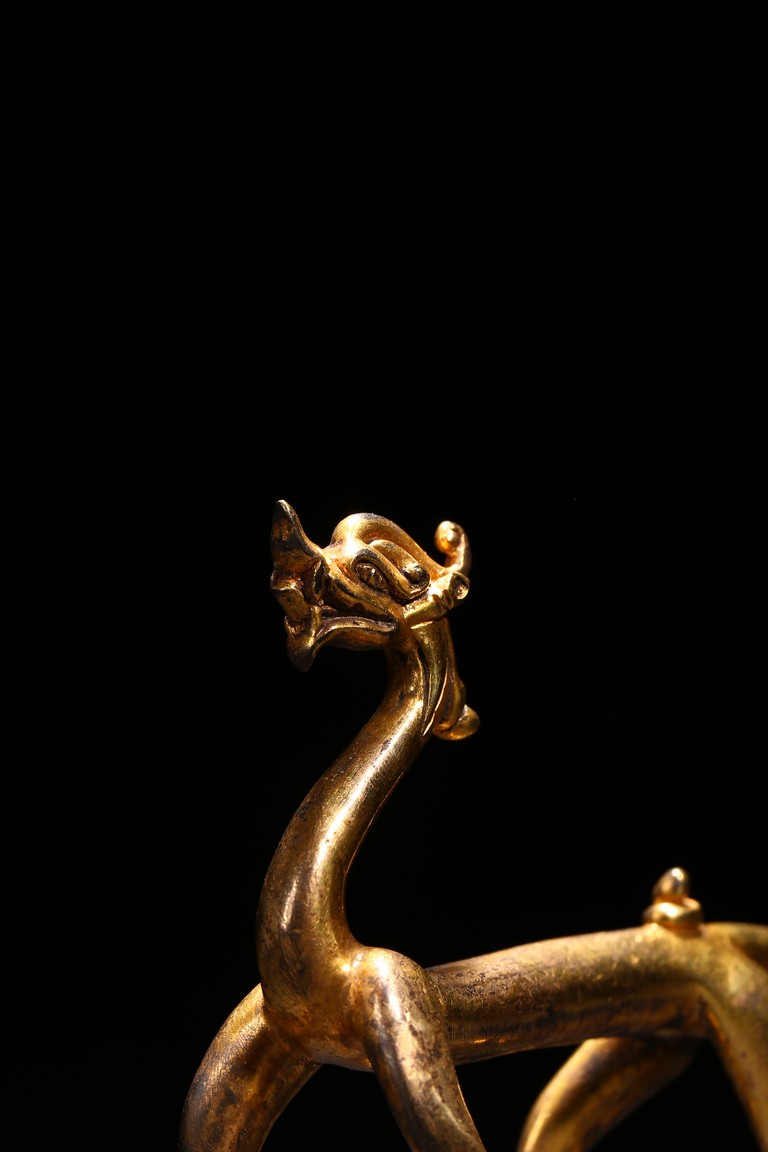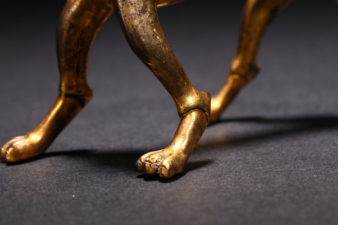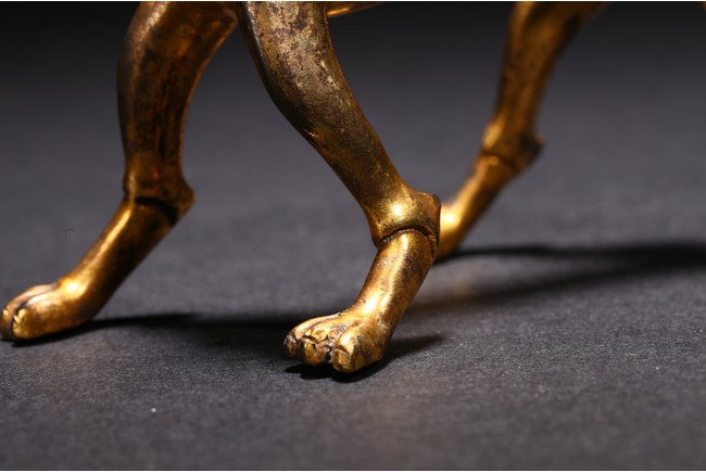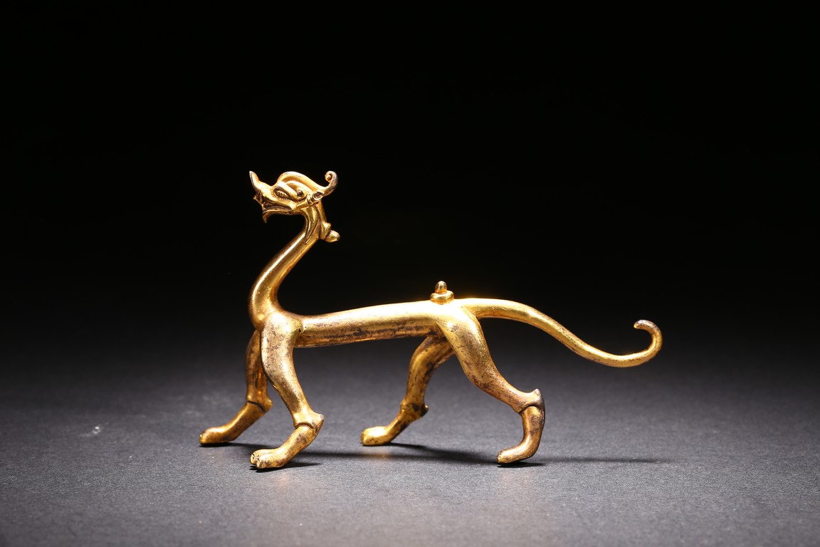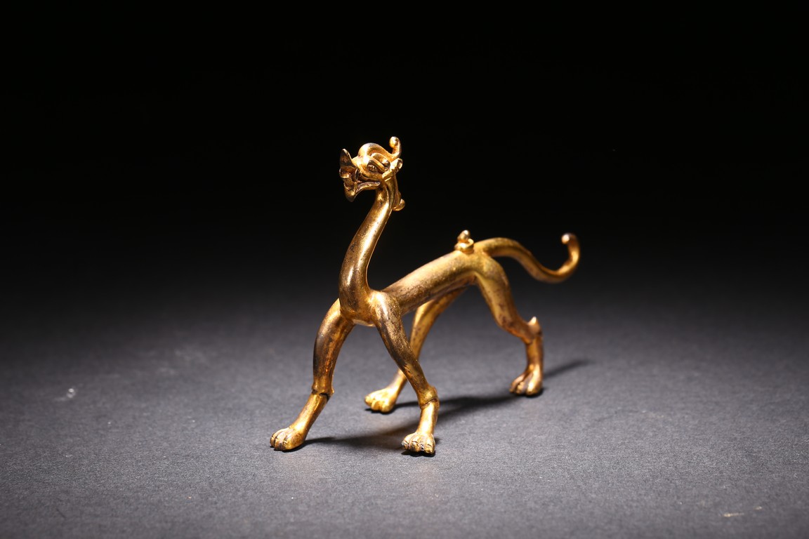 Finely cast in suspended movement, the sinuous body supported on four clawed feet, the head raised by curved neck, the face with upturned snout and mouth wide open revealing fangs, topped with a horn, the body detailed with incised lines. Six Dynasty period/Tang Dynasty period or later