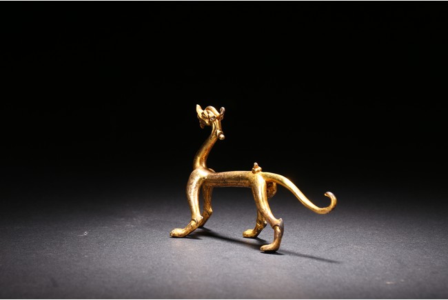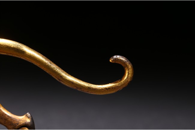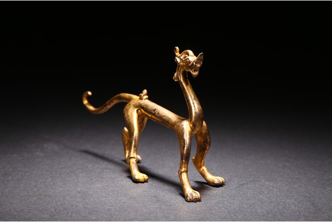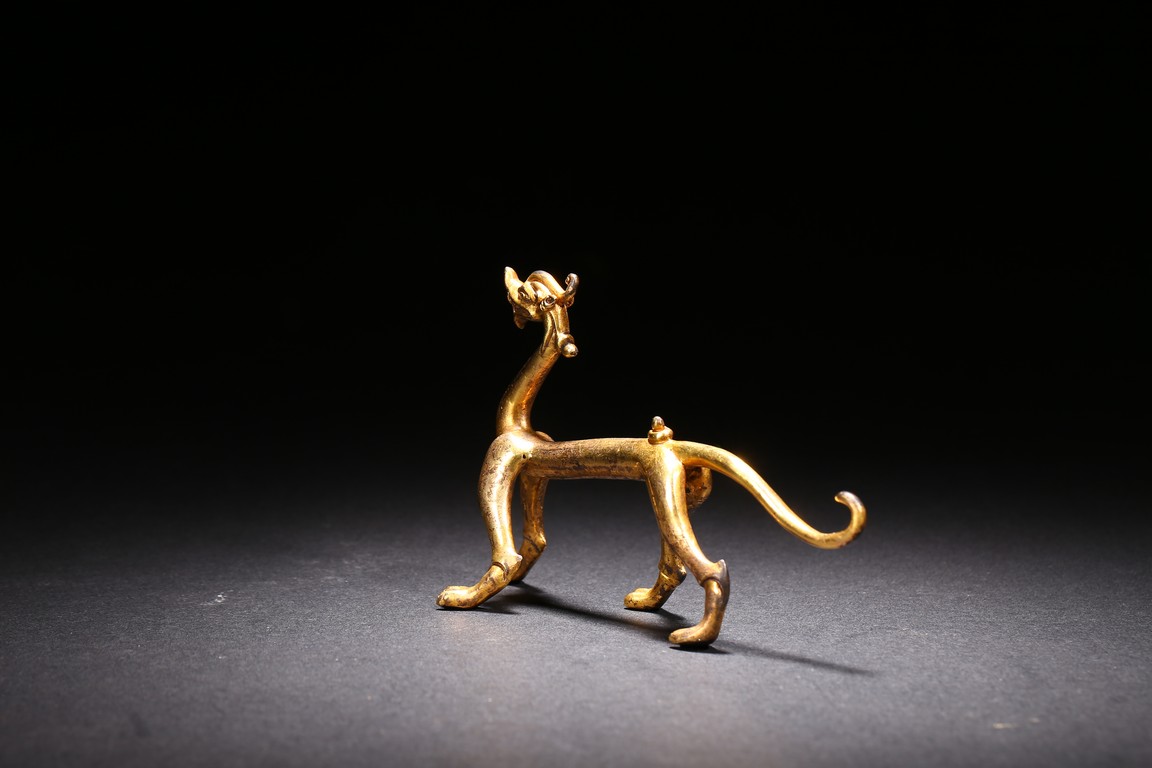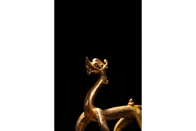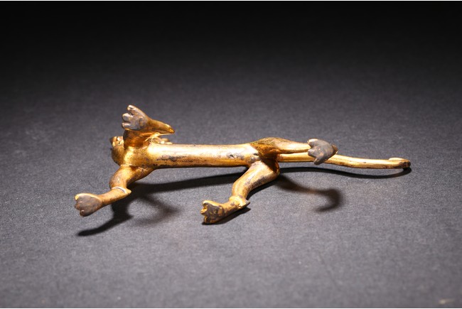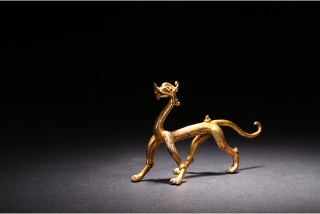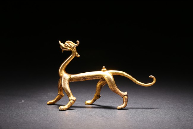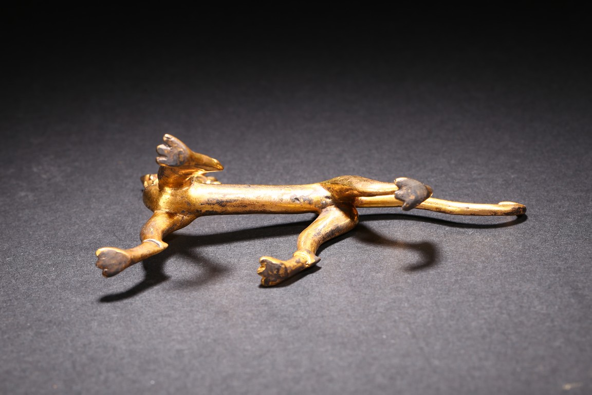 Finely cast in suspended movement, the sinuous body supported on four clawed feet, the head raised by curved neck, the face with upturned snout and mouth wide open revealing fangs, topped with a horn, the body detailed with incised lines. Six Dynasty period/Tang Dynasty period or later