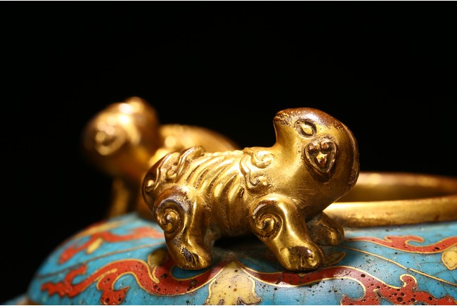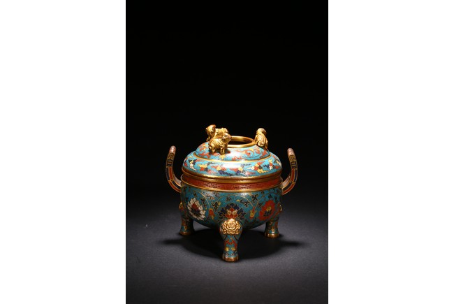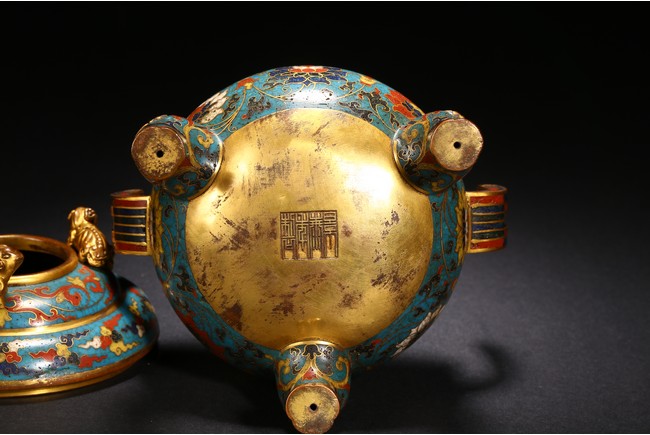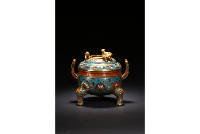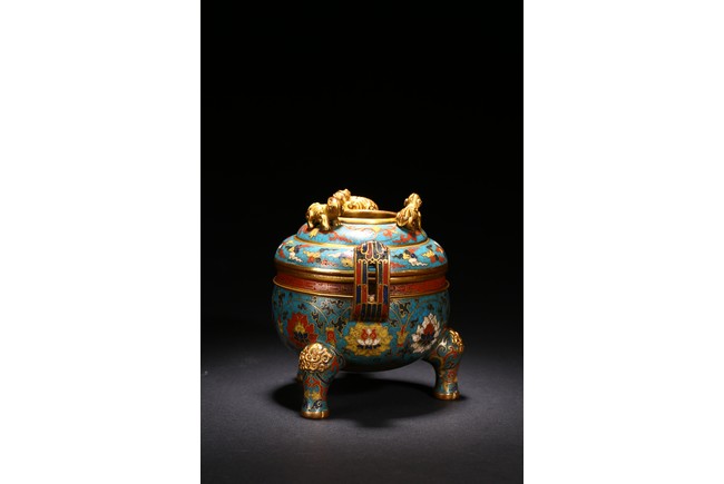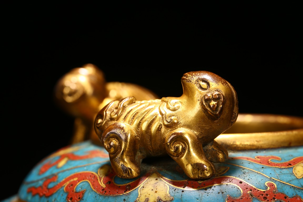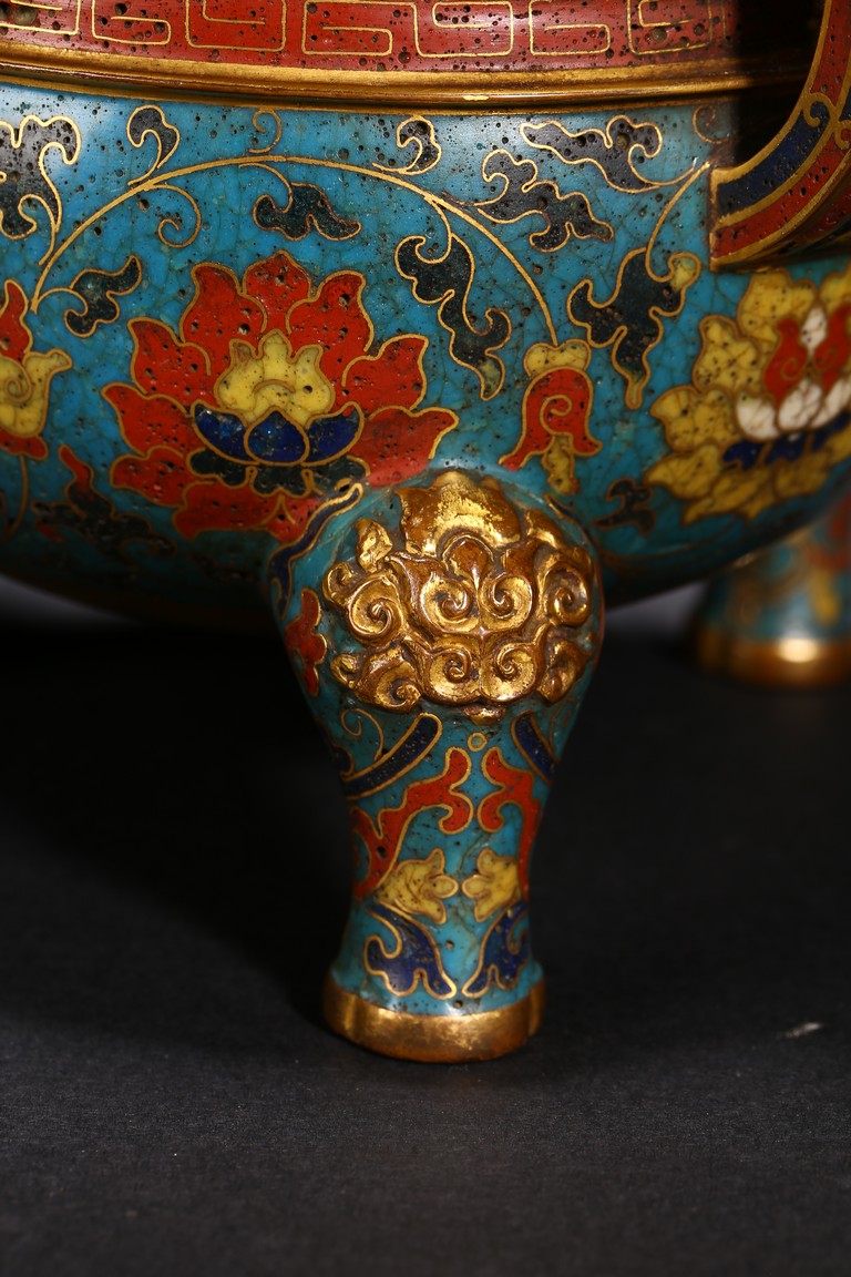 The compressed globular body raised on three legs, applied with a pair of upright handles, the body richly enameled with a continuous register of meandering lotus in blue, yellow, red, and white enamels against a turquoise-blue ground, with a key fret border around the rim, fitted with a cover decorated with auspicious clouds and surmounted with three small gilt bronze mythical animals around the cover mouth. The base cast with four character Jing Tai mark. Ming Dynasty period.