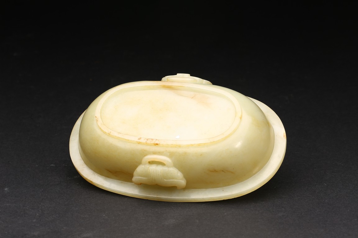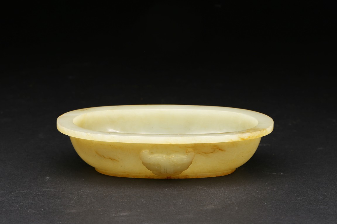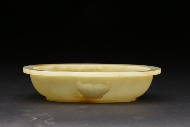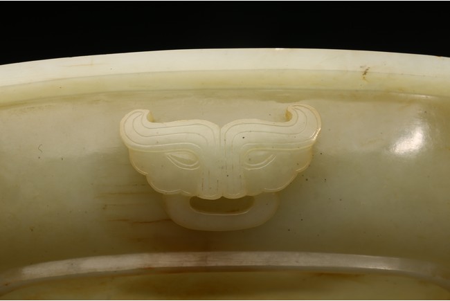 Of oval form, the washer interior carved with a pair of fish, the exterior carved in relief with a mythical beast mask on each side, the stone is of smooth polished white tone with minor russet inclusions. Qing Dynasty period.