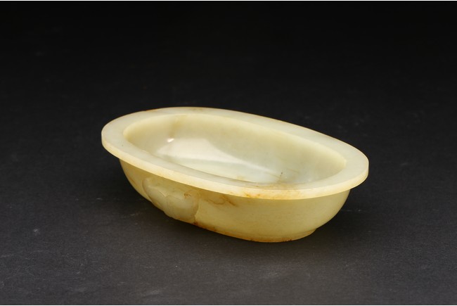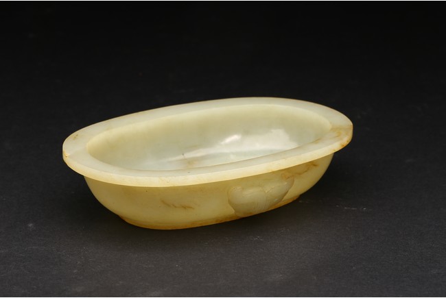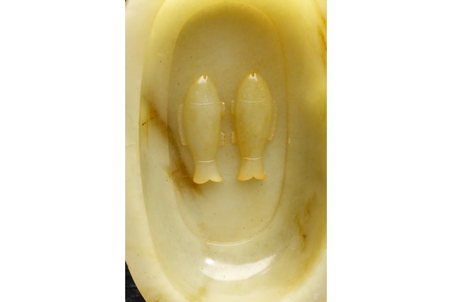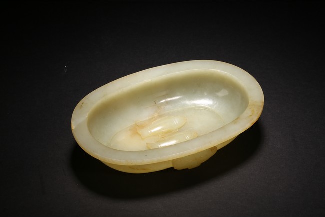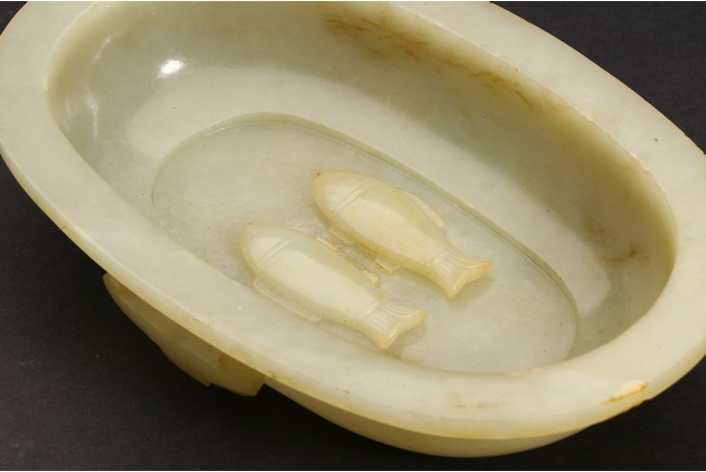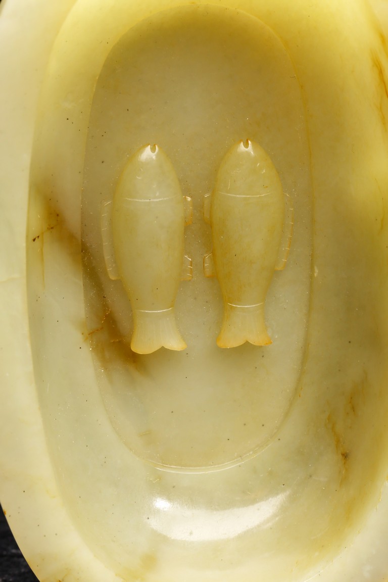 橢圓形,侈口,弧壁,折沿,型沉穩大氣,洗練簡潔。洗心浮雕飾“雙魚紋”,組成傳統的“雙魚呈祥”圖案,這類工整的雙魚紋,亦見於早期陶瓷,其靈感顯然來自雙魚紋青銅器。此件器物玉質溫潤細膩,無可挑剔,而且工藝考究,造型優美,紋飾仿古特殊,實為難得。