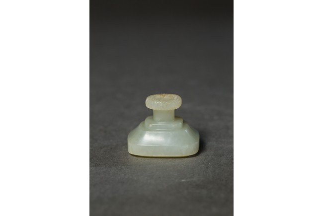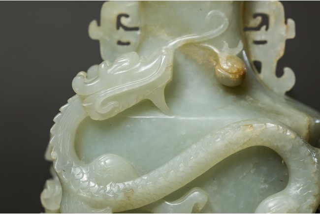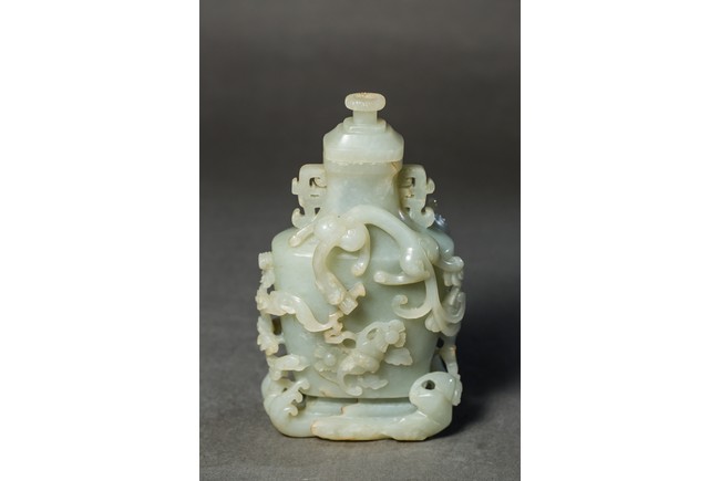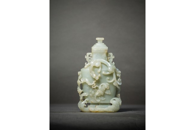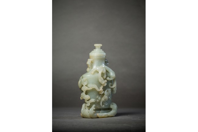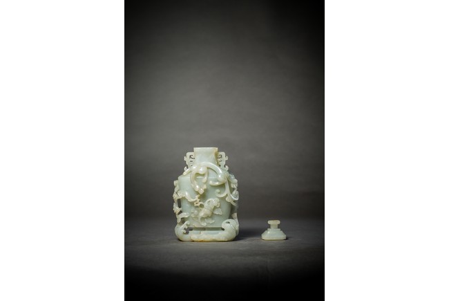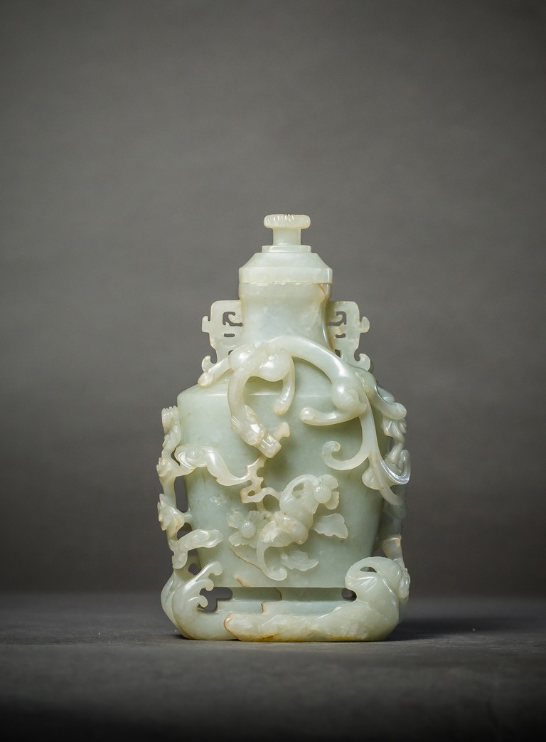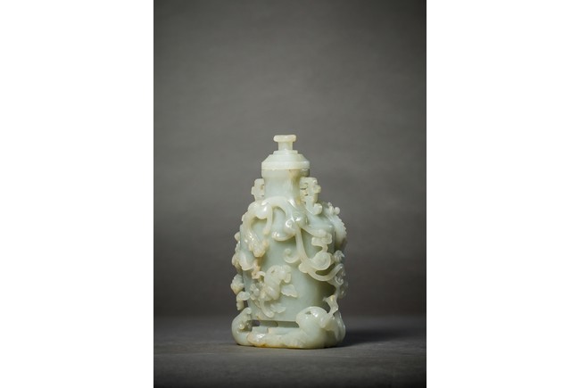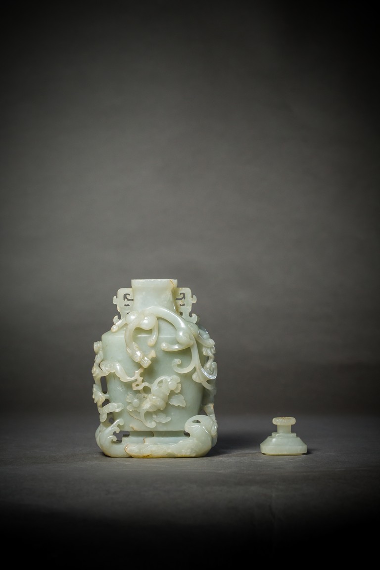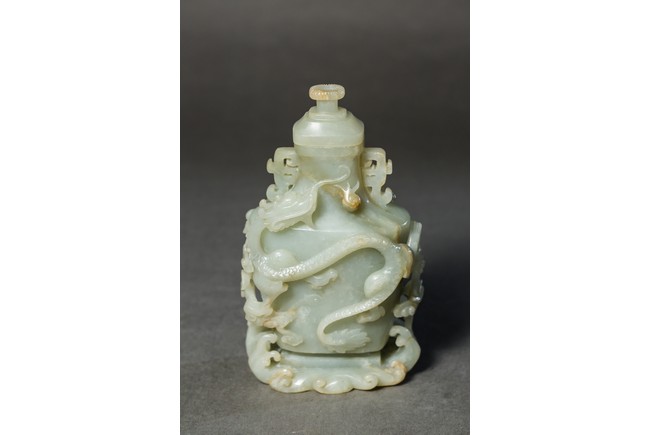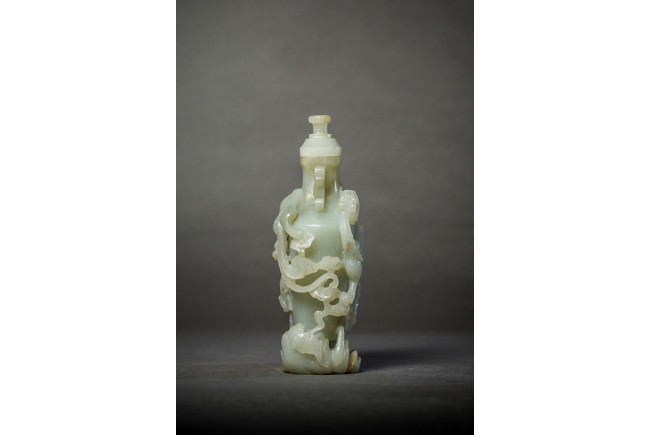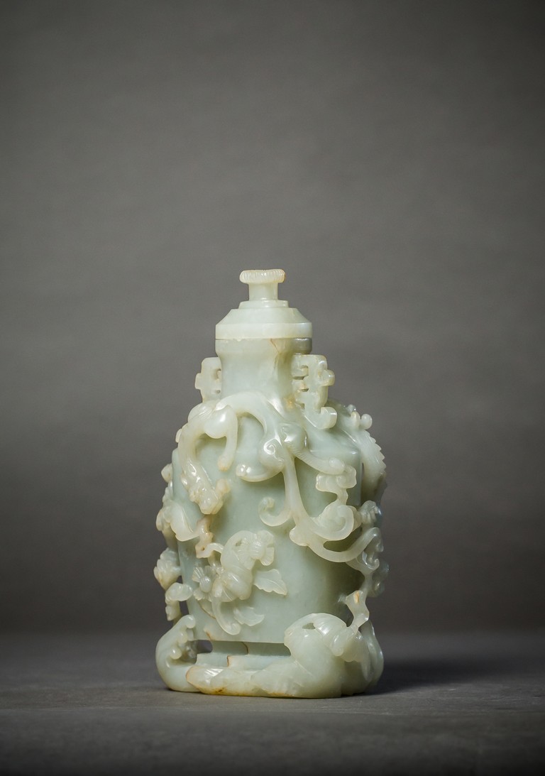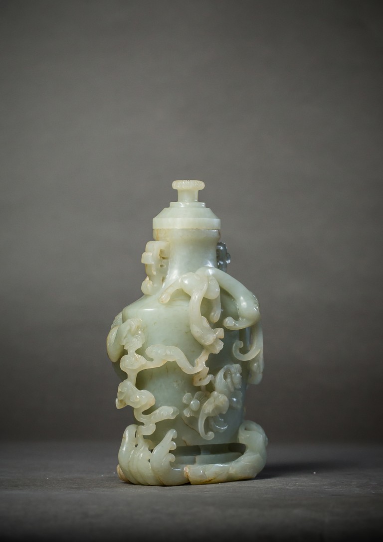 玉質溫潤,玉如凝脂,細膩瑩澤,寶光內斂。整體呈蓋瓶形,造型精巧雅緻,寶塔型蓋鈕,子母口,瓶內掏膛精細,打磨光滑,線條柔美,渾然大氣。正面一龍盤轉而上,流雲飛濺霞藹升騰,盤繞瓶身追逐寶珠,顯現蒼勁矯捷的氣勢,肌肉有力凸起,四肢健壯,龍紋雕琢精細,纖毫畢現;反面雕有一螭龍口銜花枝俯臥於瓶頸處,四足作攀爬狀,脊背隆起,動感十足,盡顯蟠曲之姿;四周又有蝙蝠飛舞在卷雲、花朵之中,寓意極其美好。本件器物利用高浮雕、透雕等技法,不僅難度大而且極其費材,展現了乾隆一朝宮廷制玉的風範。整體器型厚實圓潤,高雅古樸,造型別緻,線條舒展流暢,刀法細勁遒婉,工藝極為精湛,匠心獨運,秀逸深藴,清雅可玩,雍容華貴,令人賞心悅目,實乃難得的宮廷陳設器物。