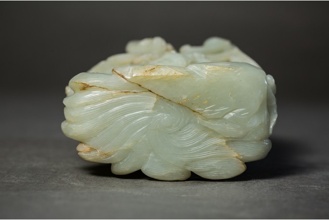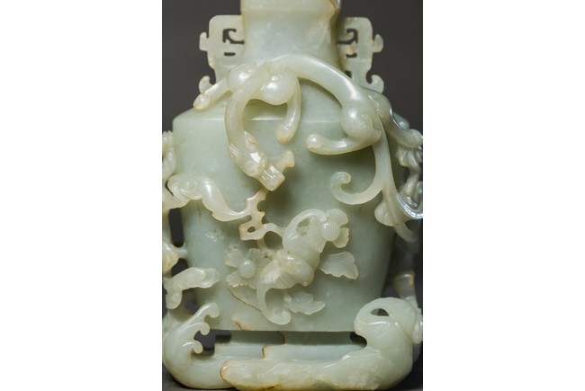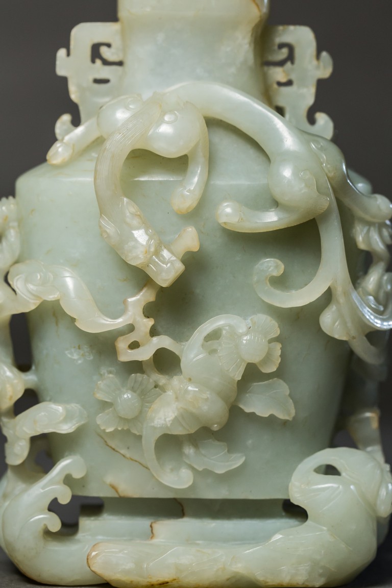 The vase modelled in baluster form and worked in high-relief and openwork to the exterior with two scaly dragons on both sides, leaping from a bed of swirling waves forming the base, the cover surmounted by an oval knop, the stone of a white celadon tone with patches of russet. Qing Dynasty period.
