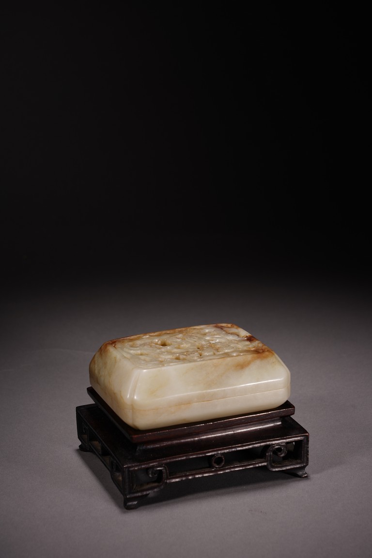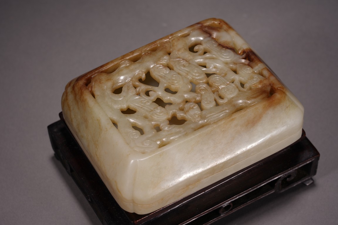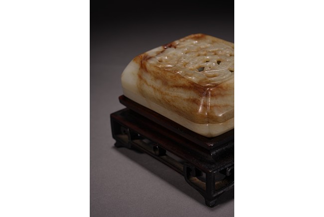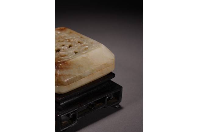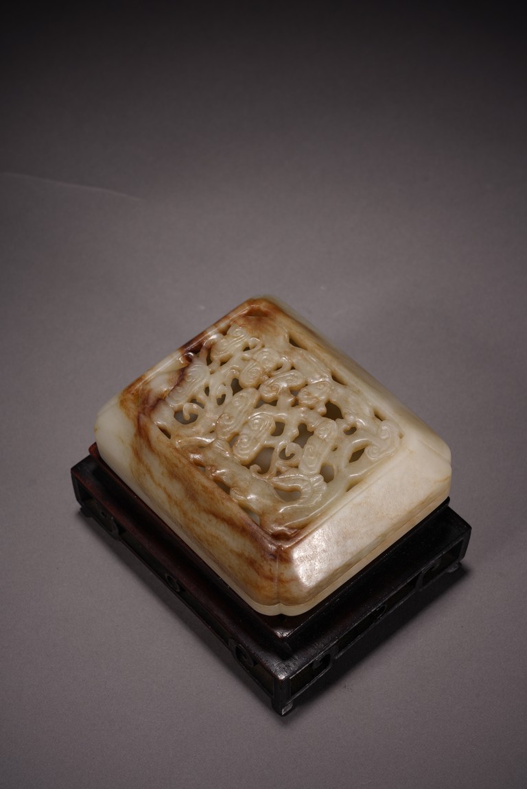 以和田玉為材,精製四方倭角蓋盒,盒底素面無紋,盒蓋鏤空雕纏枝如意紋飾,剔刻犀利,線條流暢,寓意吉祥。玉質溫潤帶糖色,增添許多自然俏皮之韻,難得之佳器。