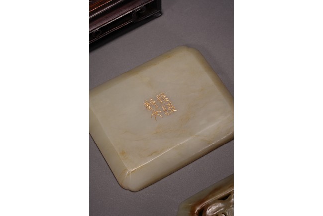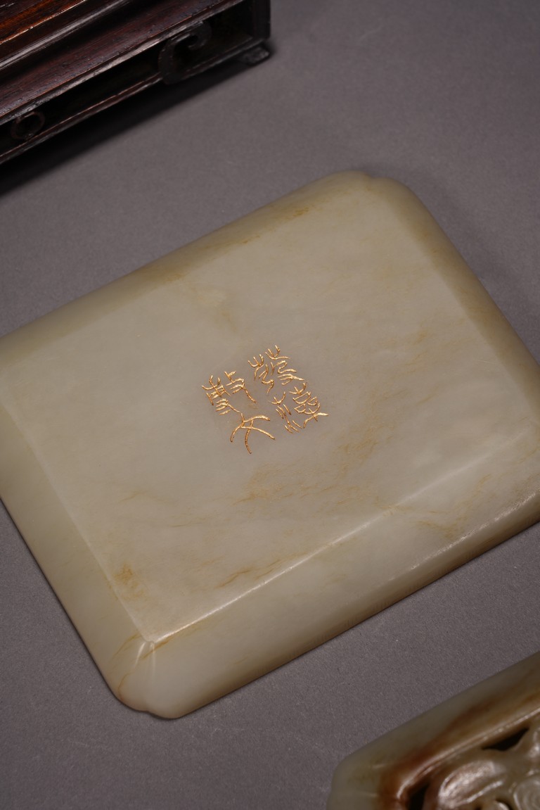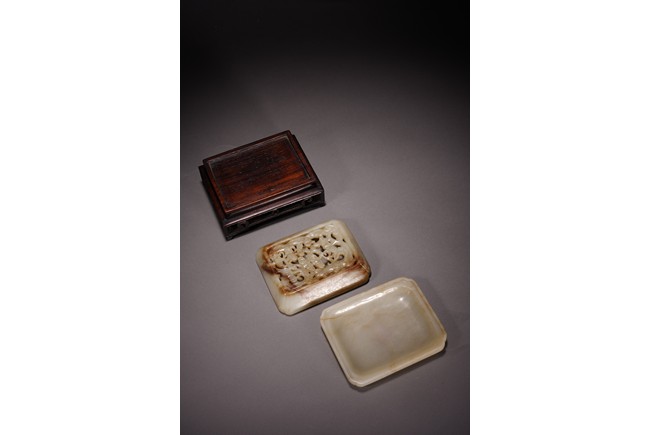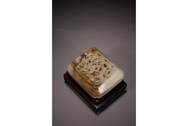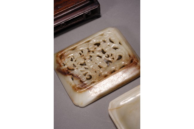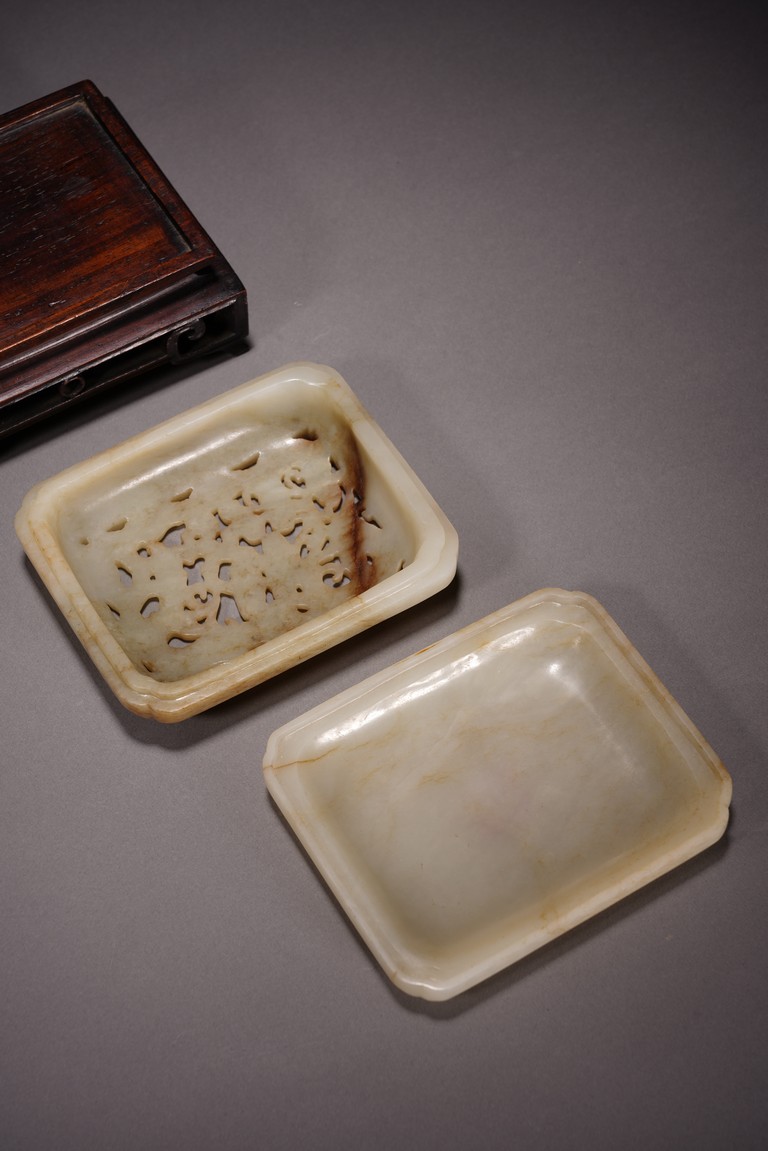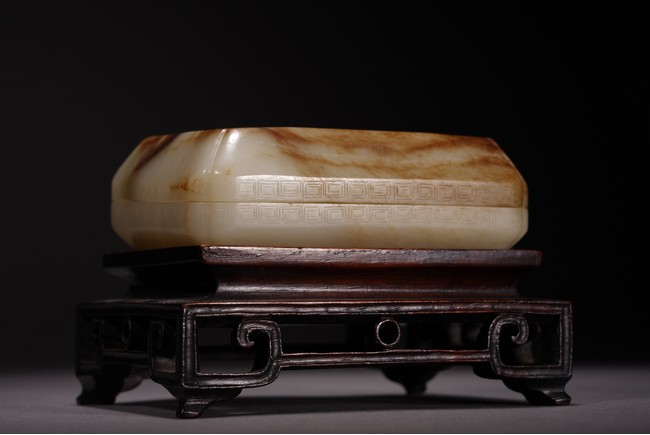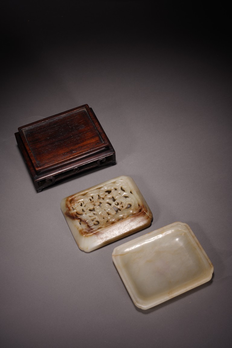 以和田玉為材,精製四方倭角蓋盒,盒底素面無紋,盒蓋鏤空雕纏枝如意紋飾,剔刻犀利,線條流暢,寓意吉祥。玉質溫潤帶糖色,增添許多自然俏皮之韻,難得之佳器。