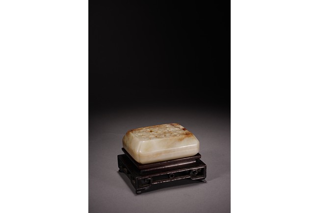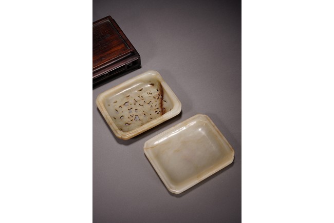 Of rectangular form, the cover top carved and pierced to depict lingzhi ruyi heads, the stone is of polished white tone with russet inclusions. Qing Dynasty period.