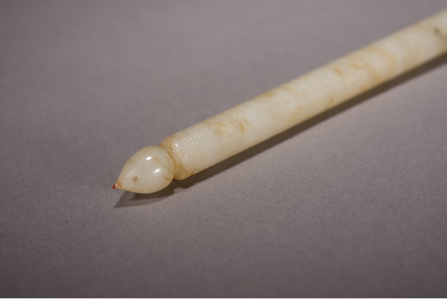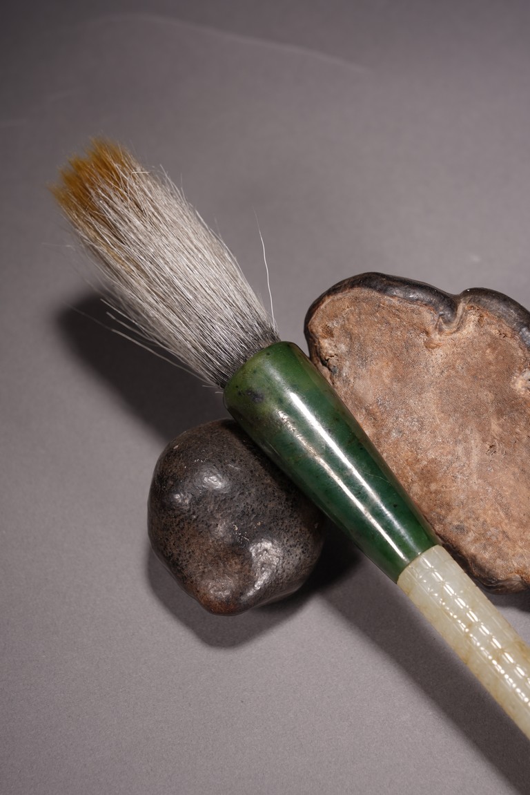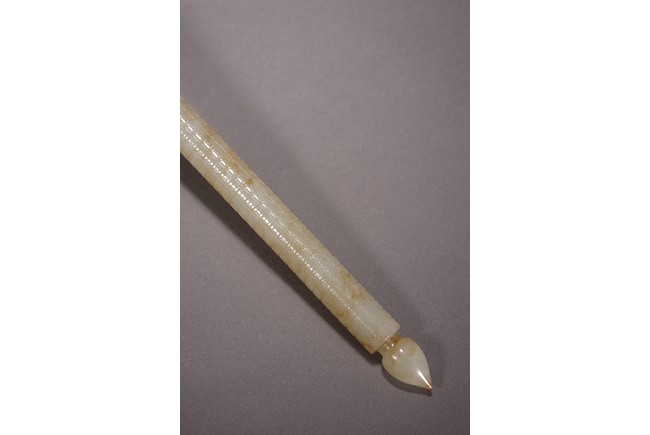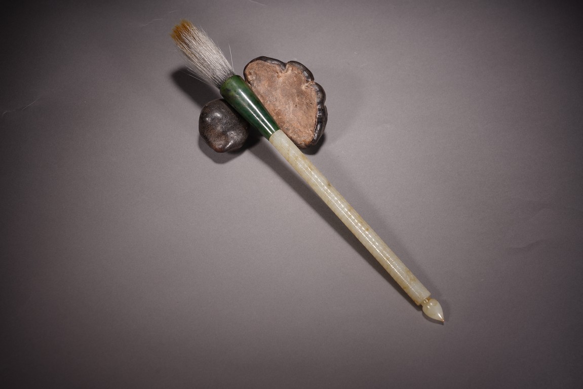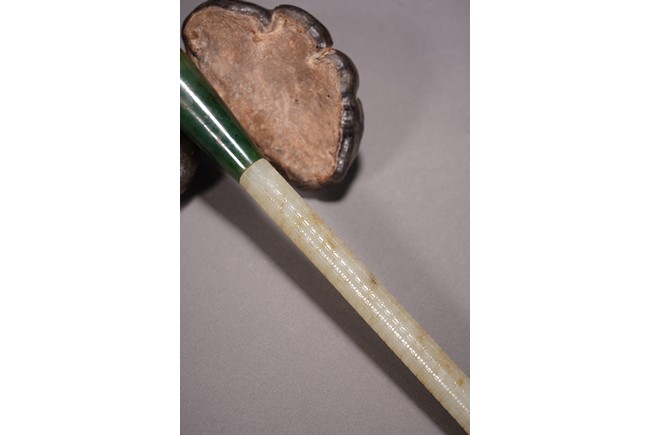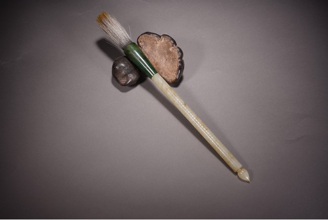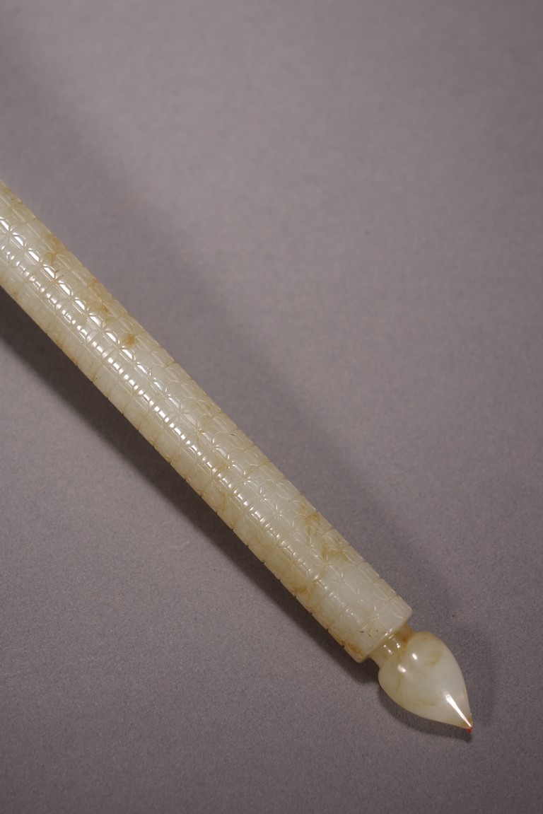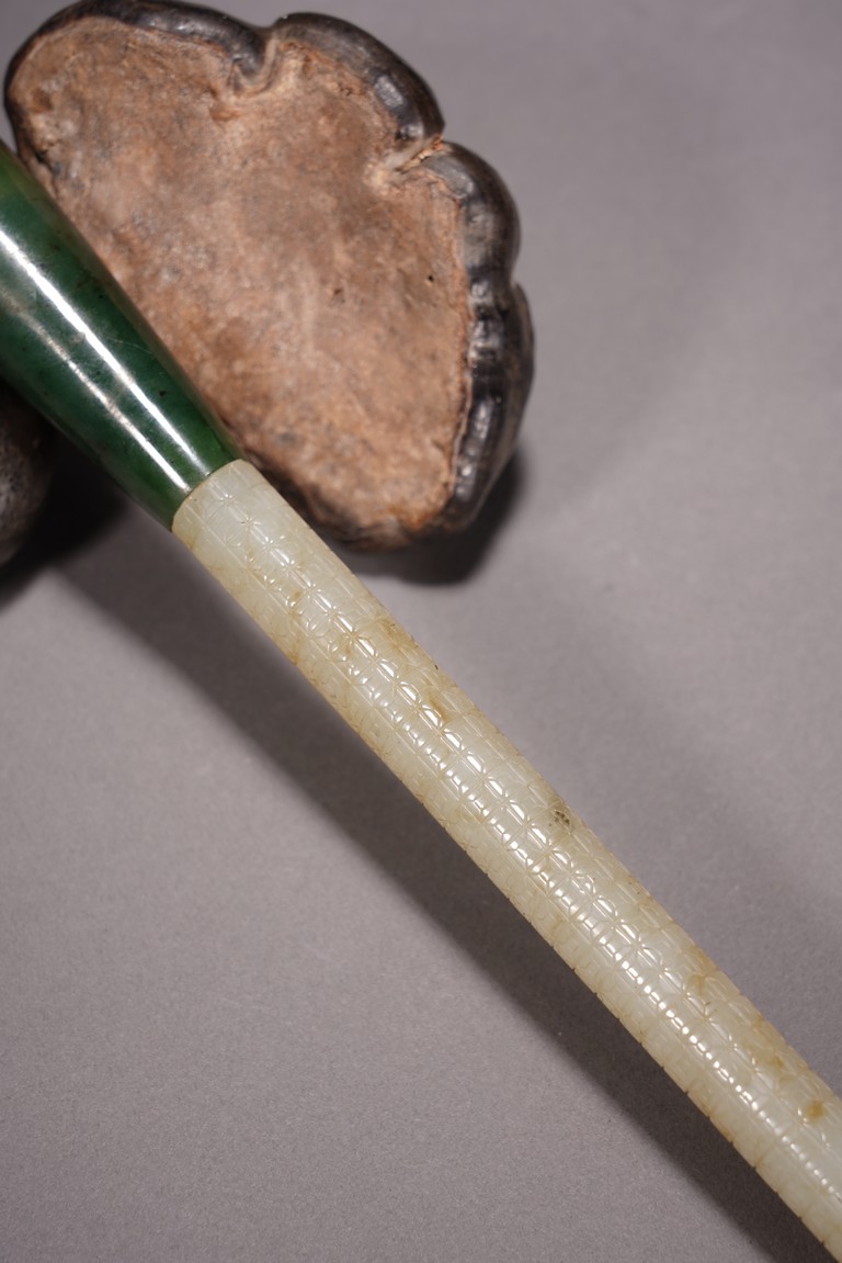 The white jade cylinder handle carved with repeated pattern, with bulbous spinach-green jade brush socket, the opposite end with white jade carved 'bud' finial. Qing Dynasty period.