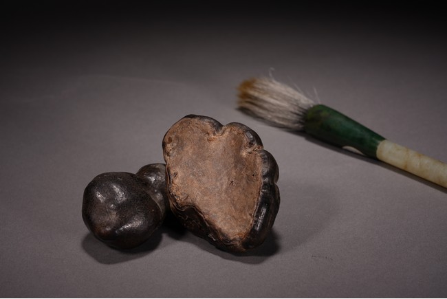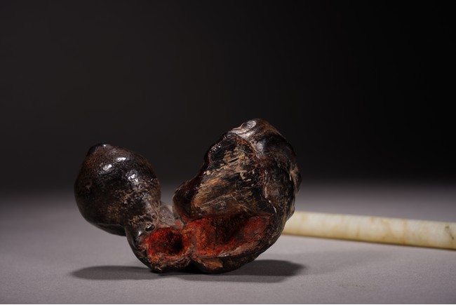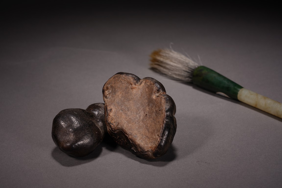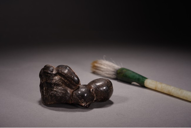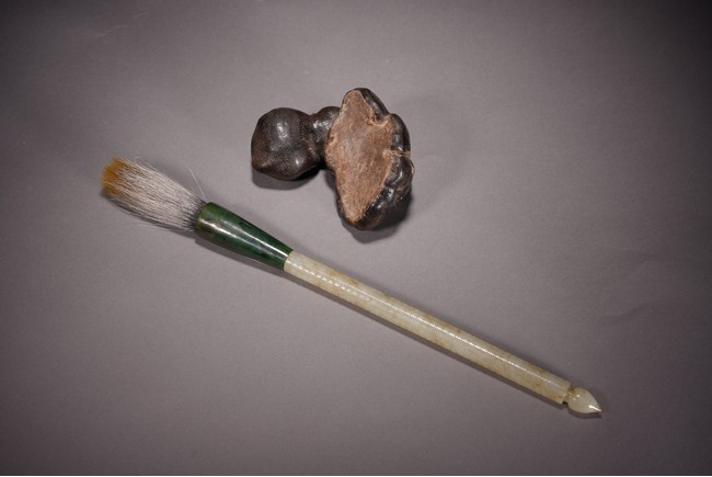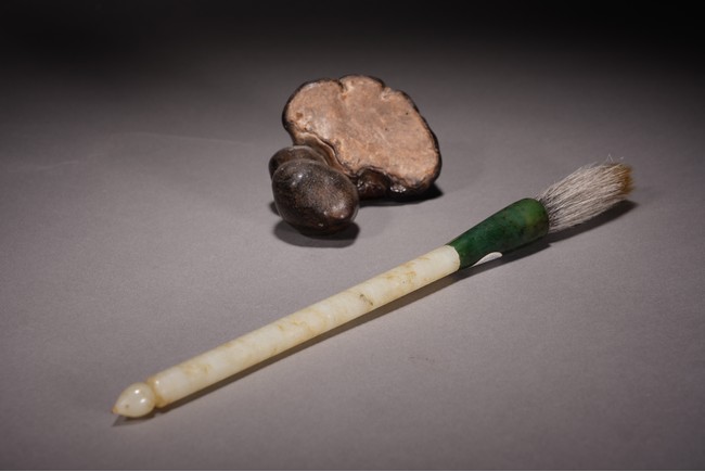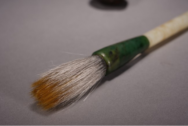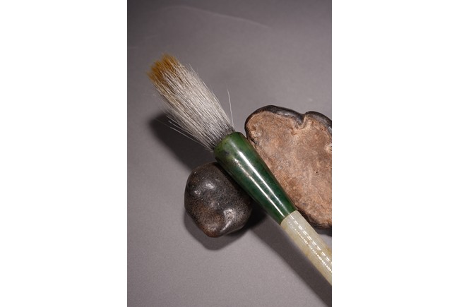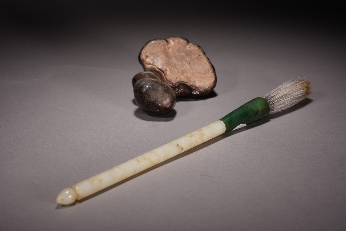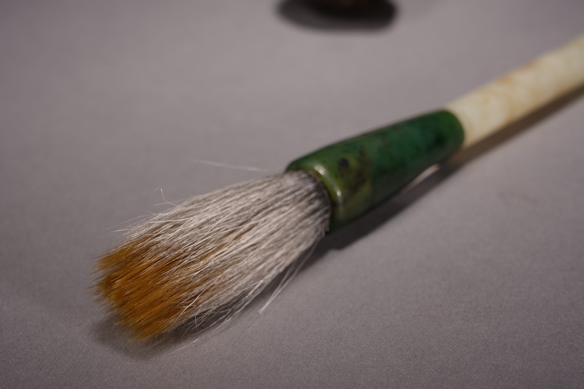 此筆筆管為白玉材質,筆管滿雕十字花紋飾,碧玉筆鬥,長鋒羊毫。整體形制規整,推配獨特又不失大氣,雕刻線條流暢,非一般人所為。毫毛粗健,修削整齊,乃為清代提筆的典型樣式。