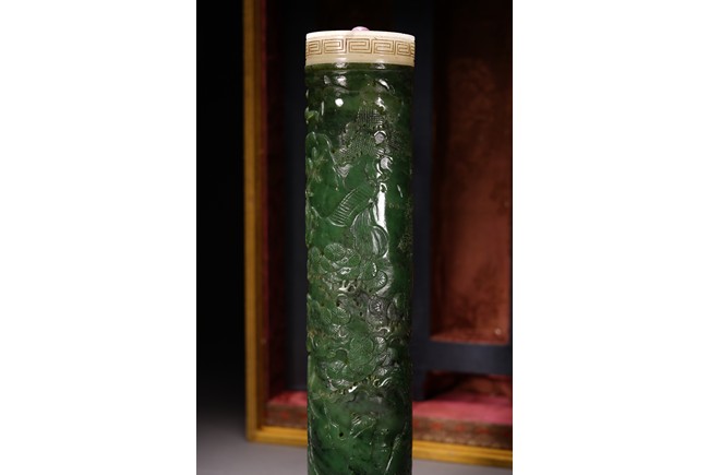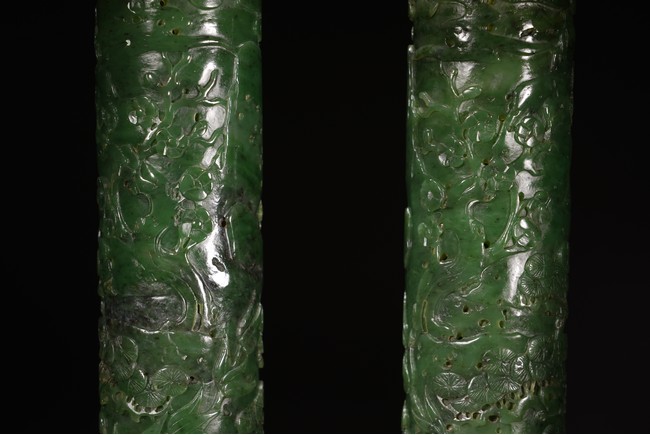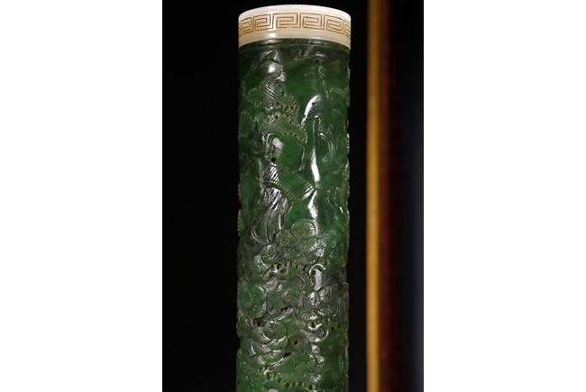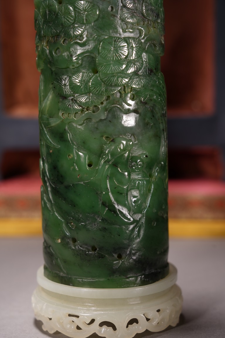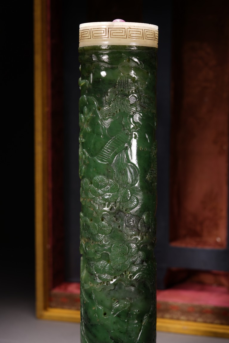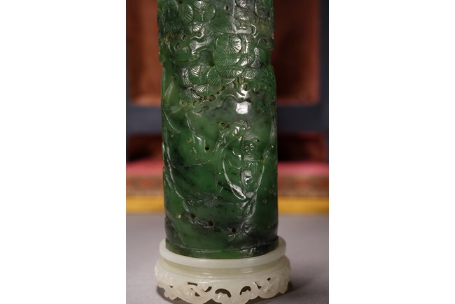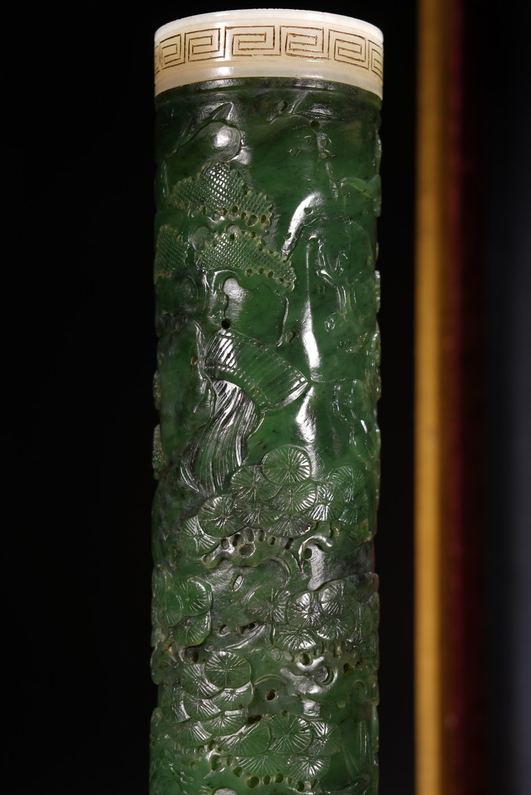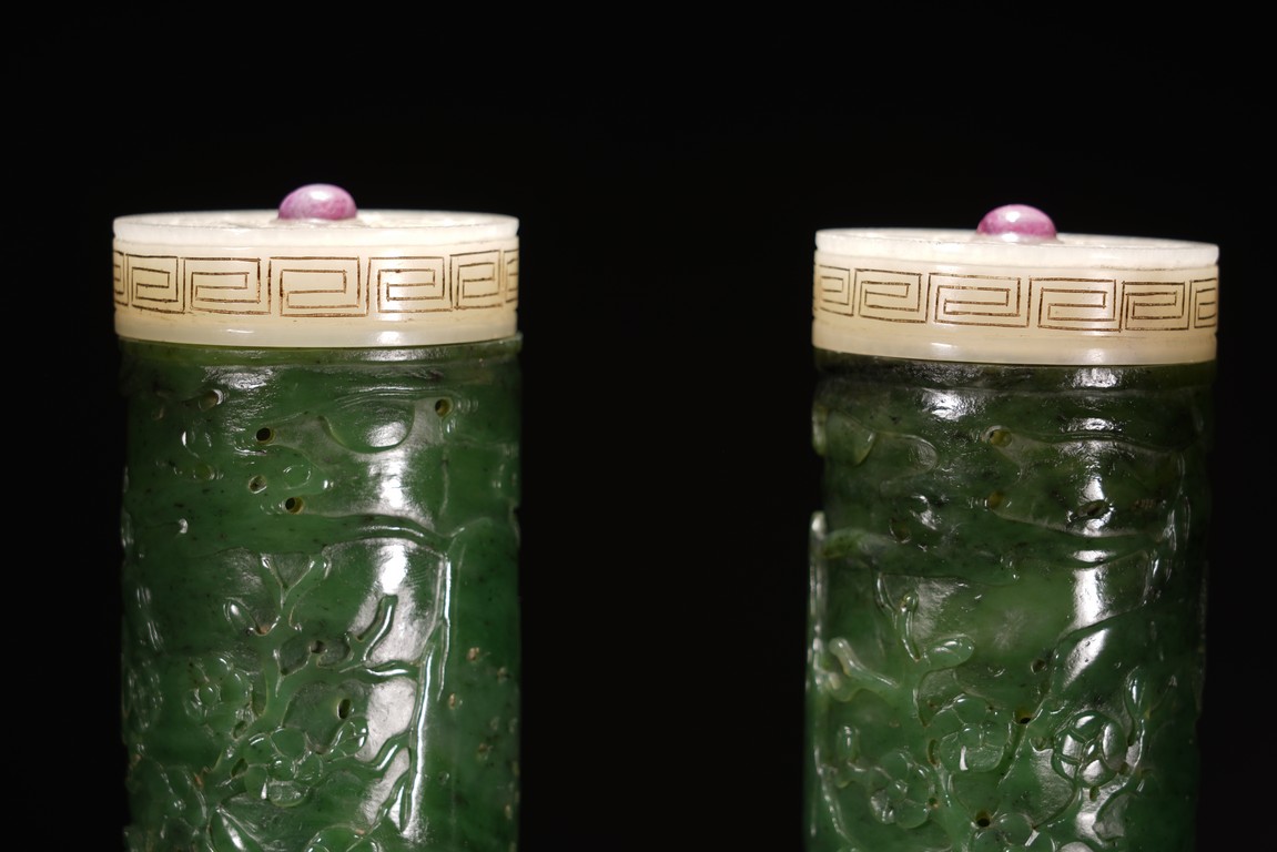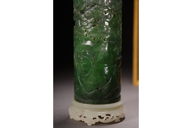 此香筒筒身為碧玉,上下白玉扣,蓋鈕為紅寶石。香筒採用鏤雕工藝,琢就山水人物圖。層巒疊嶂,古松蜿蜒,山石深處,曲廊幽徑,婉轉而出,若隱若現,意境幽遠。此器佈局精巧,疏密有致,運刀流暢,頗見功力,是一對難得的佳品。