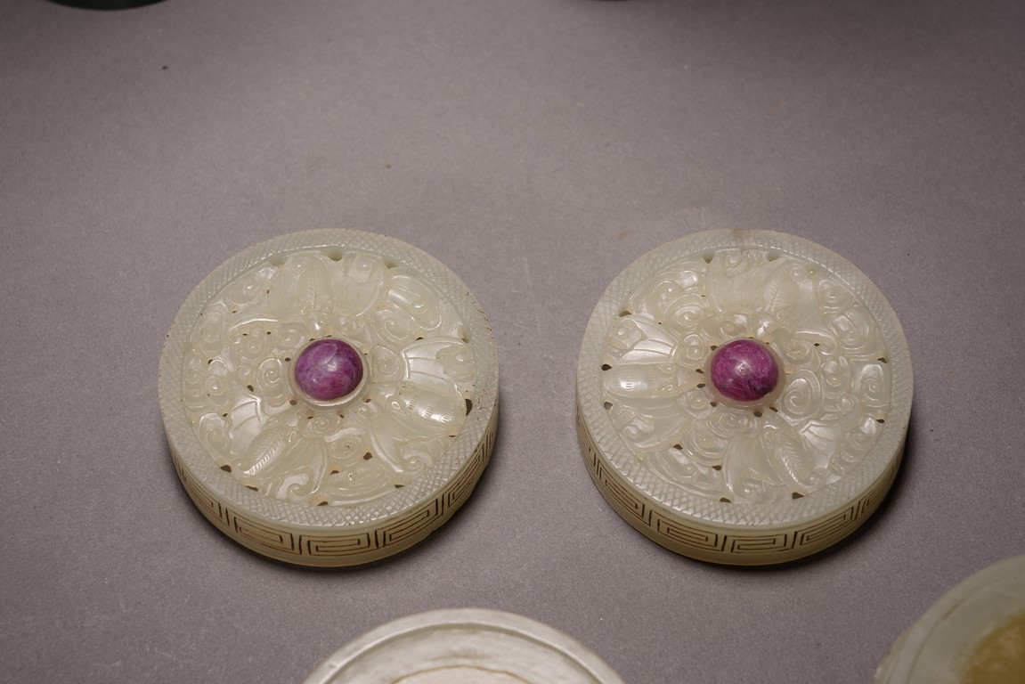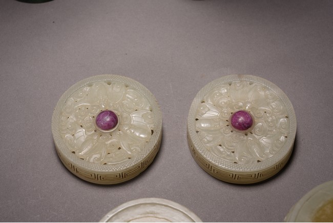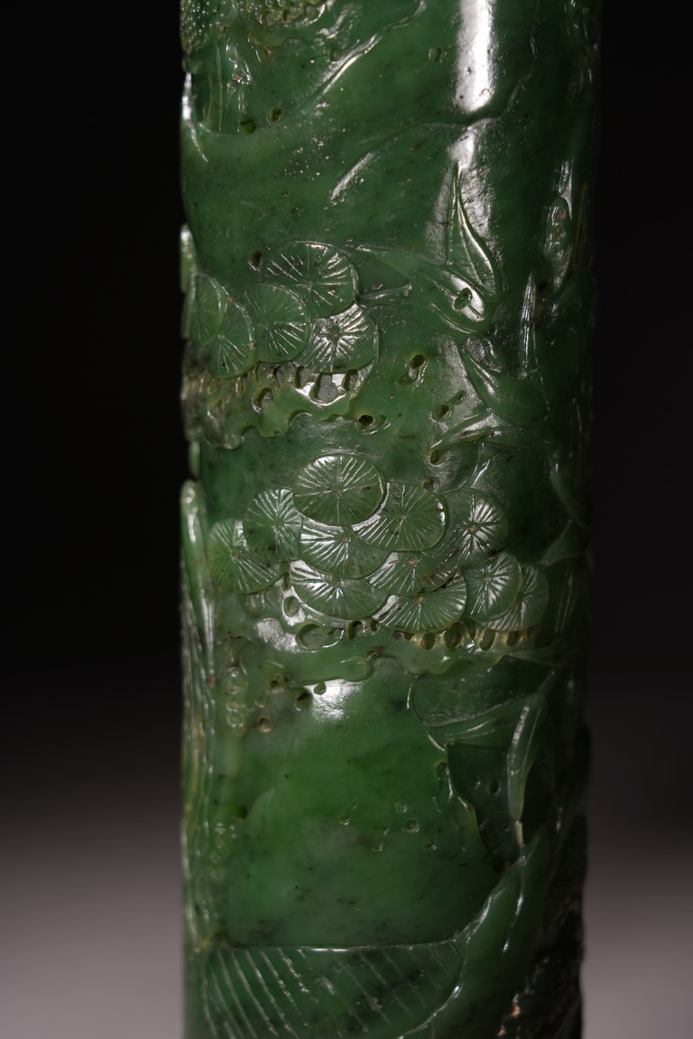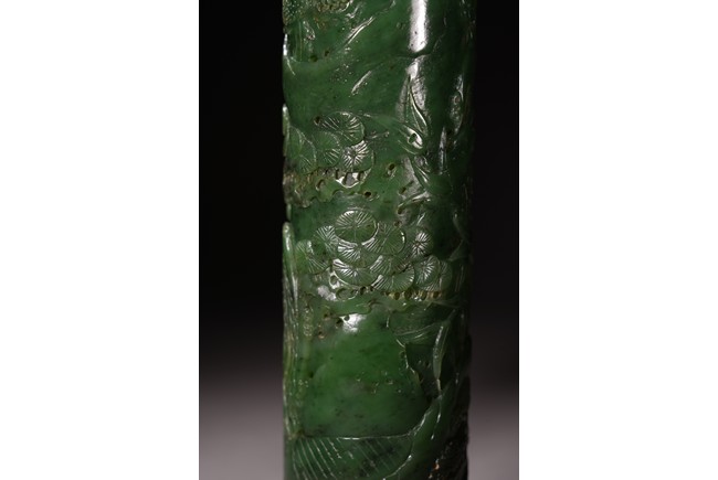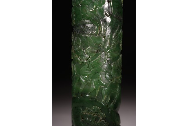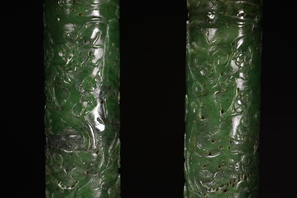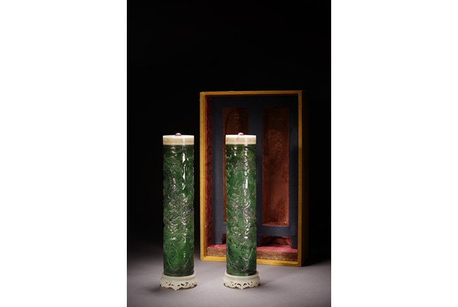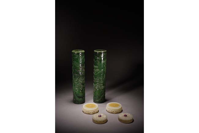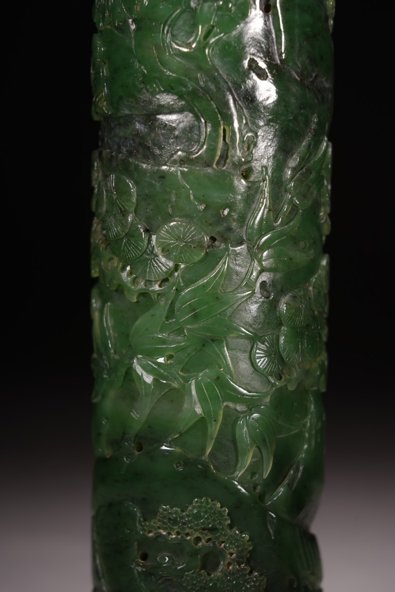 此香筒筒身為碧玉,上下白玉扣,蓋鈕為紅寶石。香筒採用鏤雕工藝,琢就山水人物圖。層巒疊嶂,古松蜿蜒,山石深處,曲廊幽徑,婉轉而出,若隱若現,意境幽遠。此器佈局精巧,疏密有致,運刀流暢,頗見功力,是一對難得的佳品。