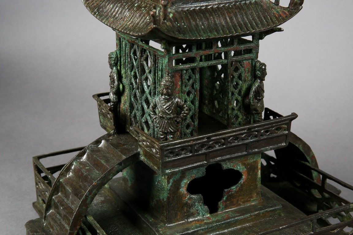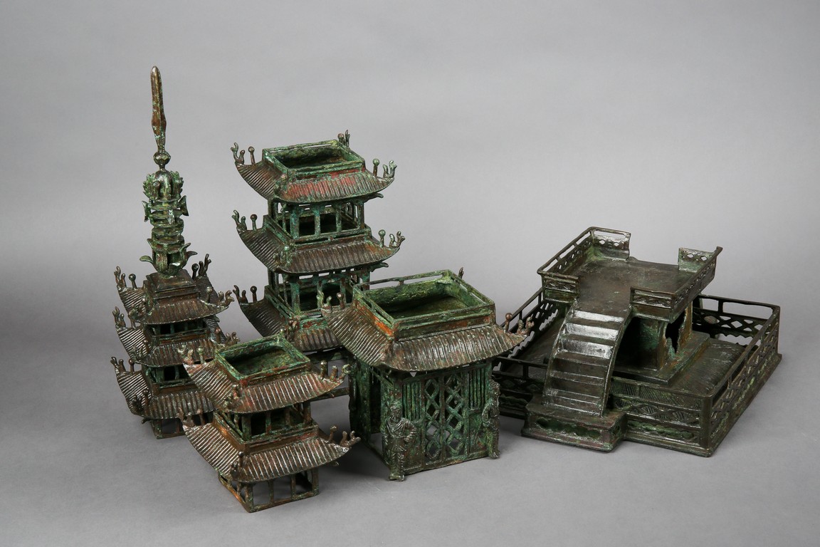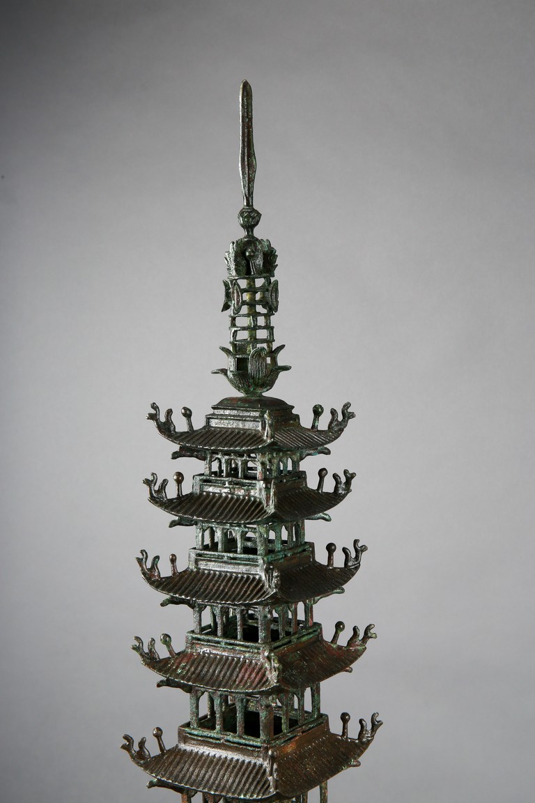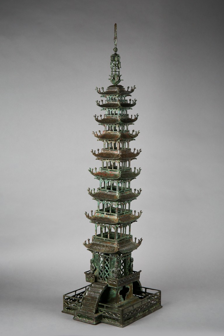 The nine-story pagoda set on a square base with an arched stair leading to the entrance door guarded by four buddhist warriors at each corner; each tier graduate in size and with protruding and curving roof, the uppermost roof surmounted with finial. Possibly Northern Song Dynasty period.