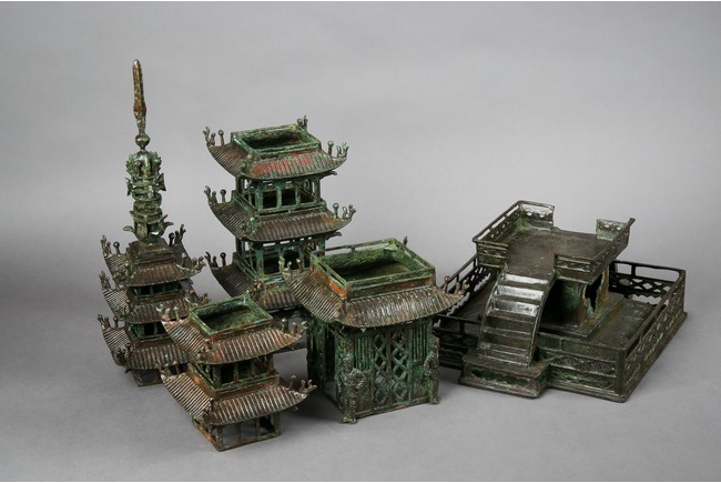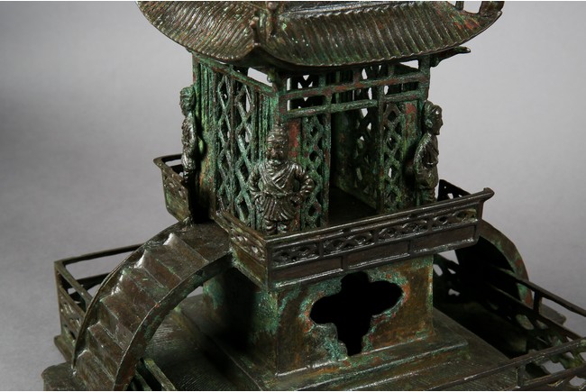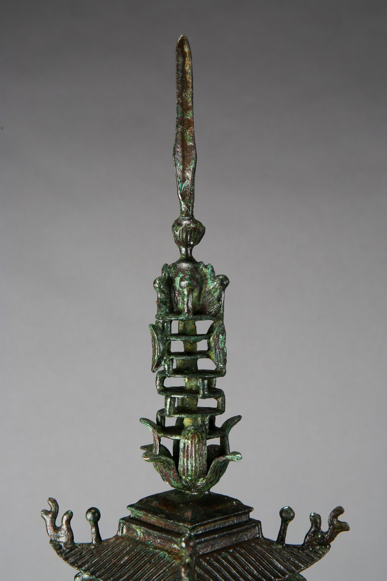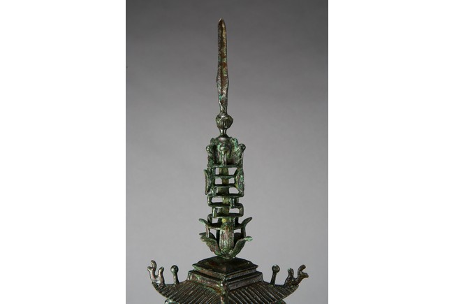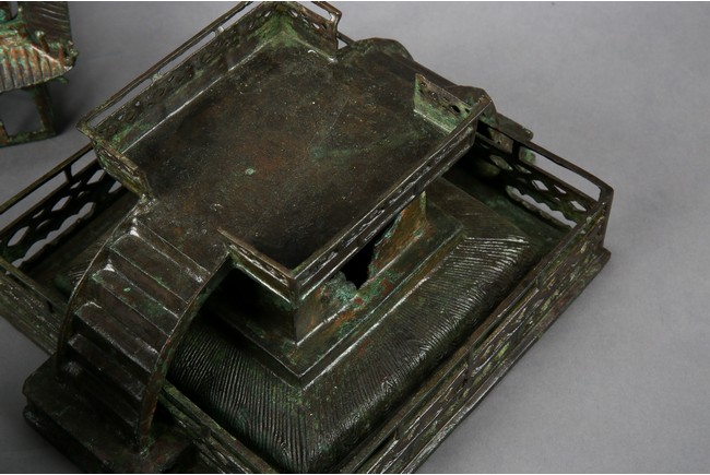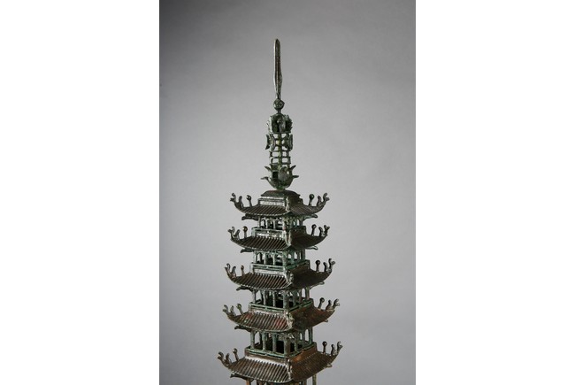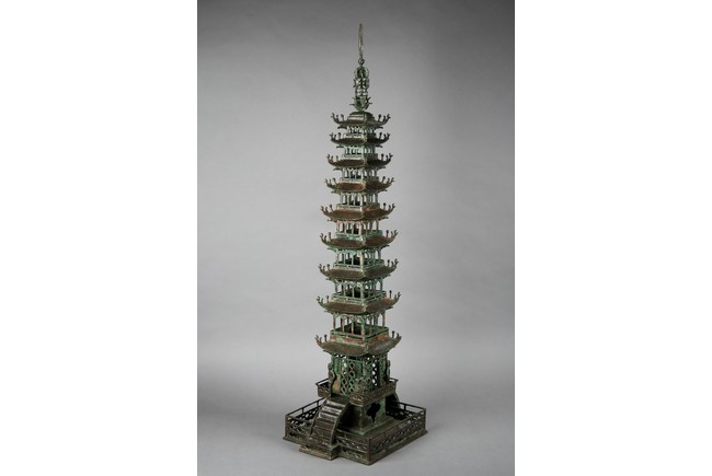 用青銅製成,完全按照中國古建築營造法式小型塔,樓閣式塔,塔身呈四方型,塔基之上有九層,塔身自下往上依次向內收分,上小下大。一層至九層,每層塔檐向外挑出,飛簷翹角;塔基有樓梯、圍欄,整體保存完好,實屬不易。