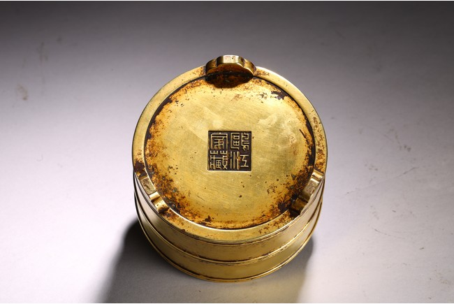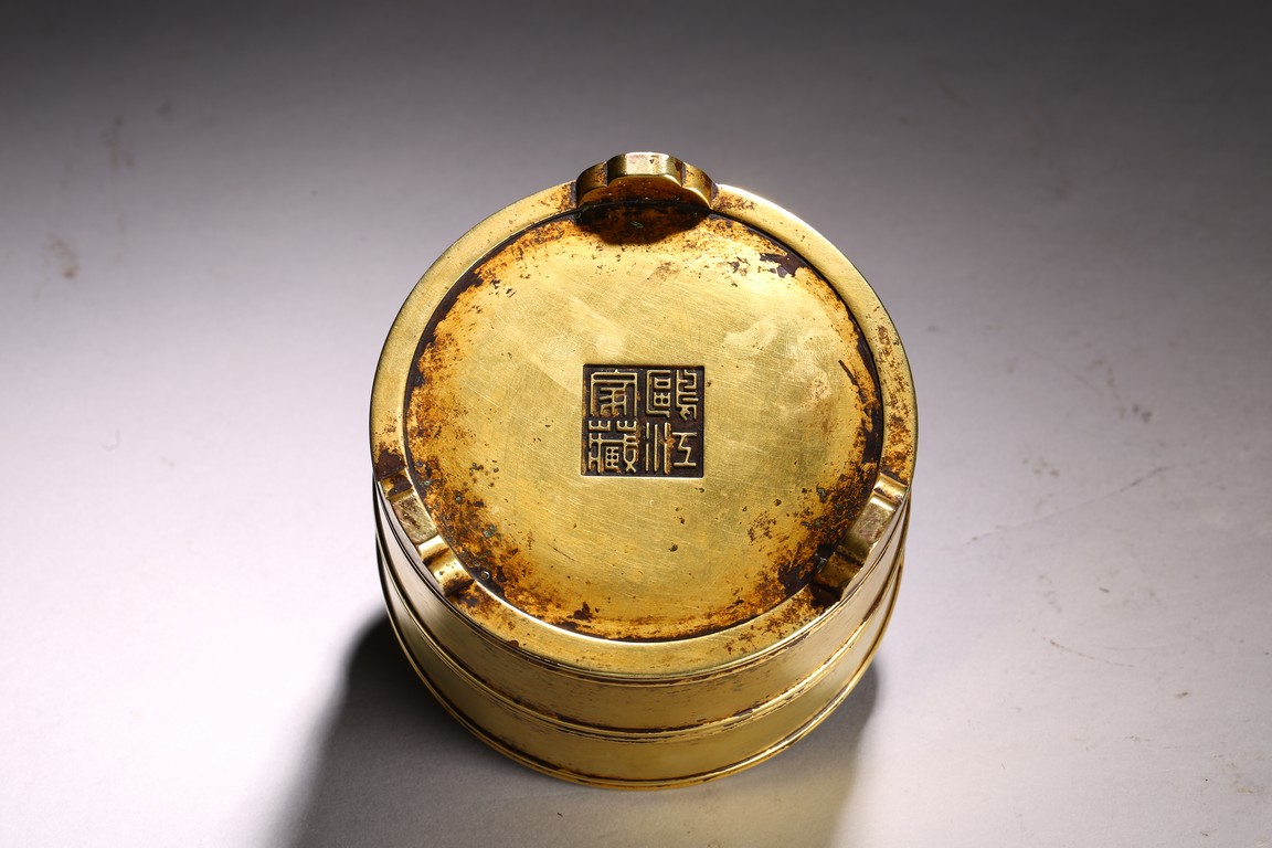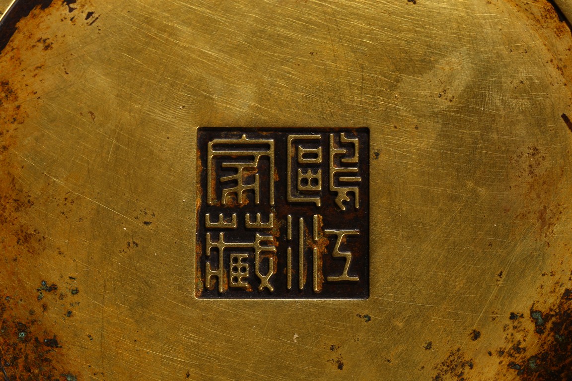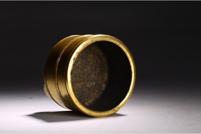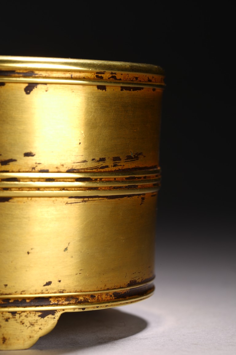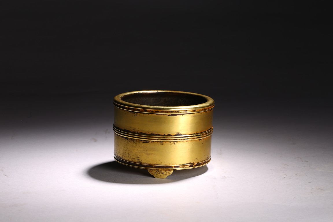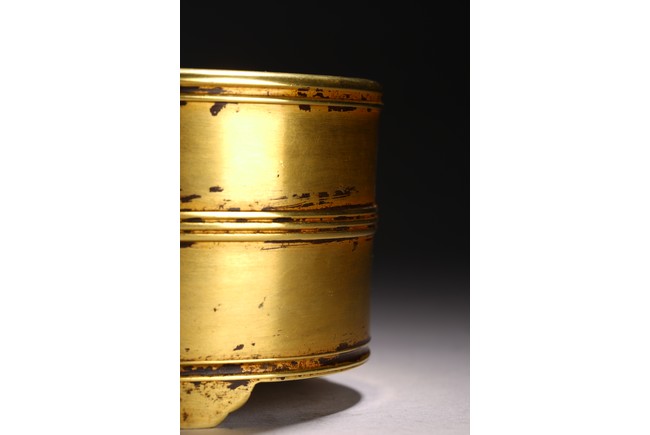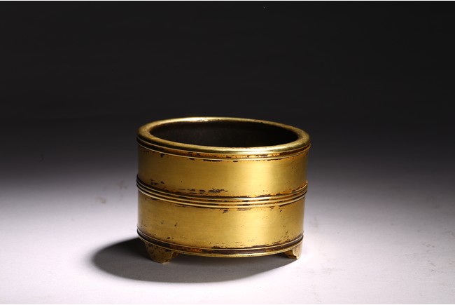 Of cylindrical form, supported on three shaped short stubs, exterior encircled with raised bands, base with four character mark.