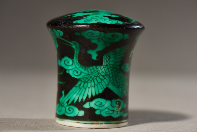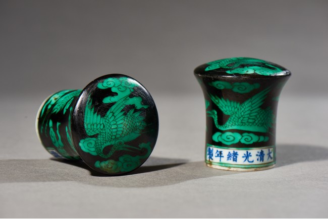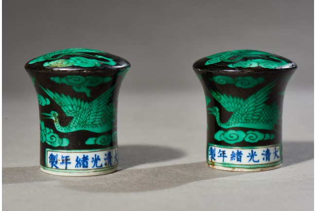 施黑彩為地,黑亮而勻淨,上用綠彩繪“仙鶴雲紋”,橫向以白釉為地,釉質瑩潤如玉,用青花書寫“大清光緒年制”款識,字體工整秀雅,成對保存完好。