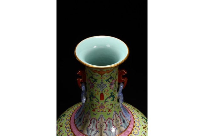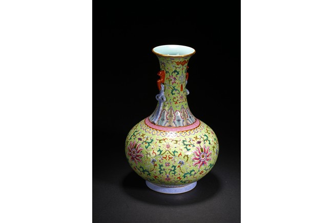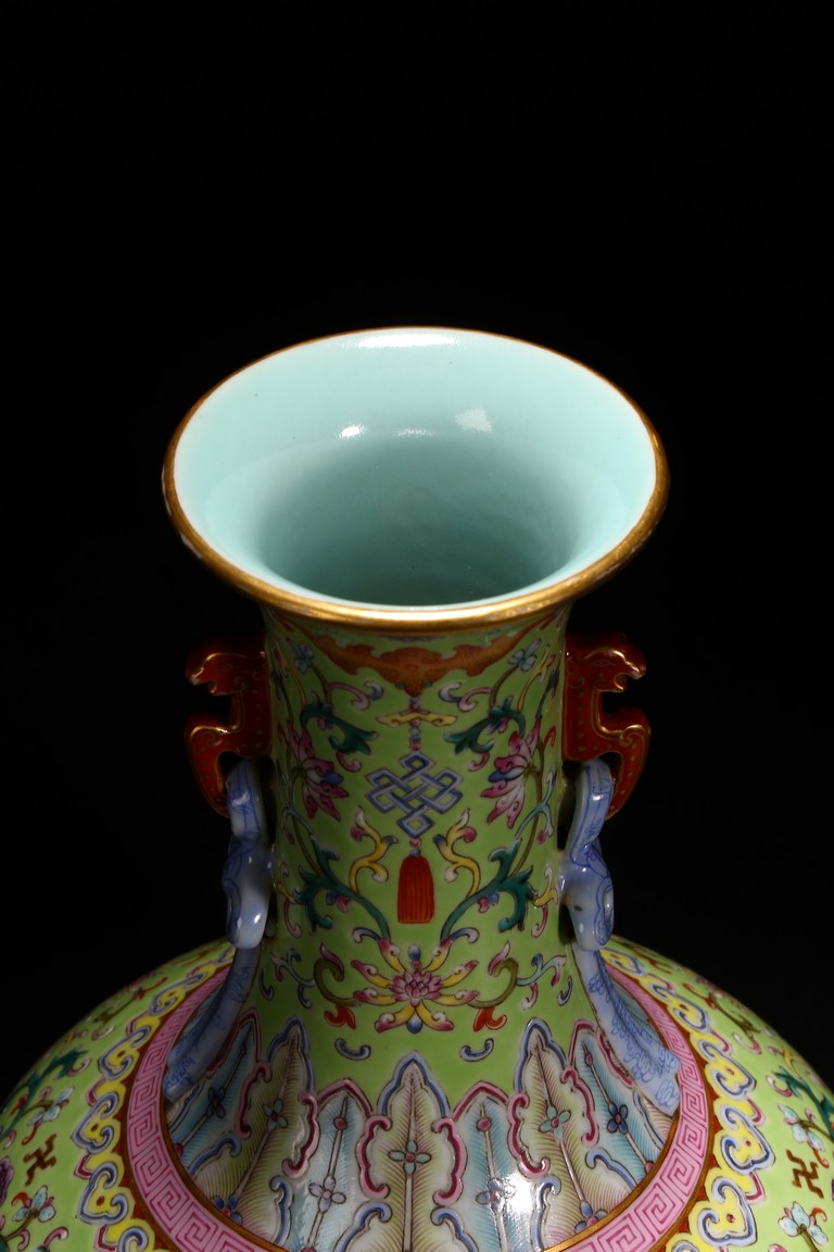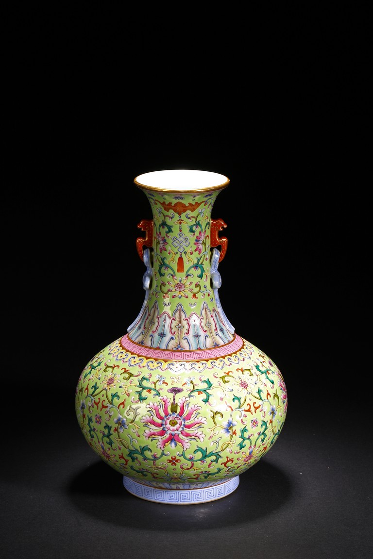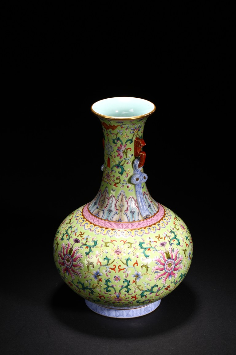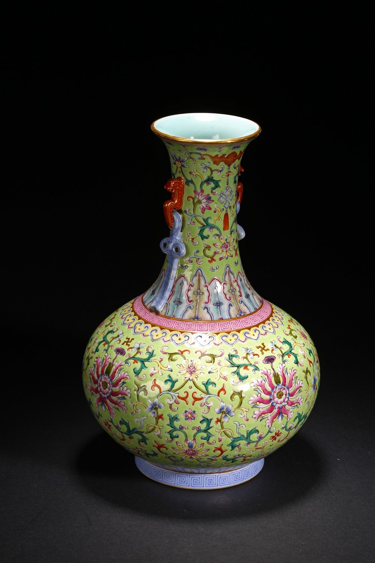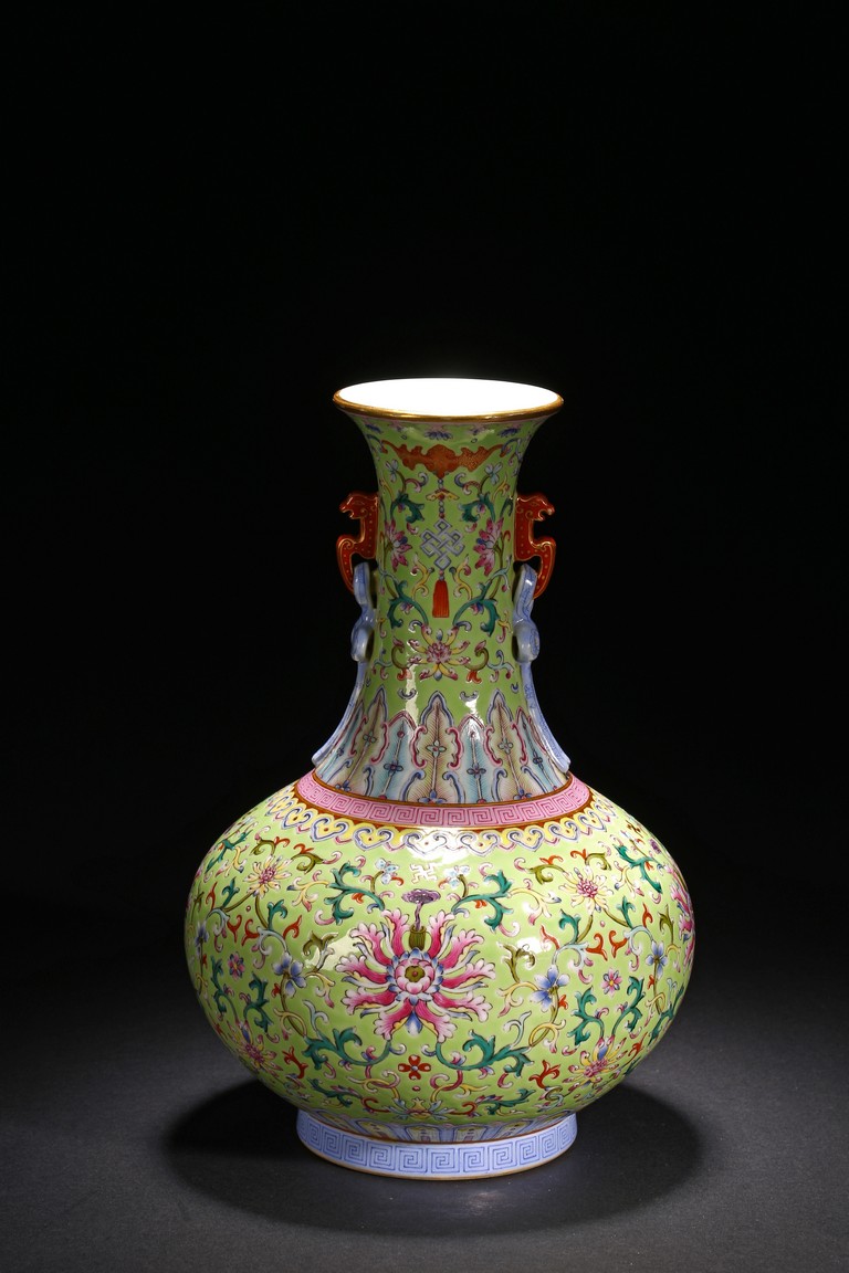 The compressed globular body rising from a splayed foot to a long slender neck and slightly flared rim, brightly painted around the exterior with stylized scrolling lotus below lingzhi and wan motif all against the lime green ground, flanked between a band of key-fret pattern around the neck and upright lappet around the foot, the waisted neck flanked by two moulded stylized dragon handles in iron-red with details in gilt, dividing on each side a floral scroll encircling a pendant hung from a bat, the interior covered in turquoise green glaze, the base inscribed with six character Qianlong mark. Qing Dynasty Qianlong period.