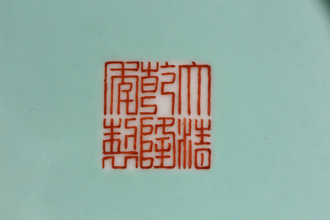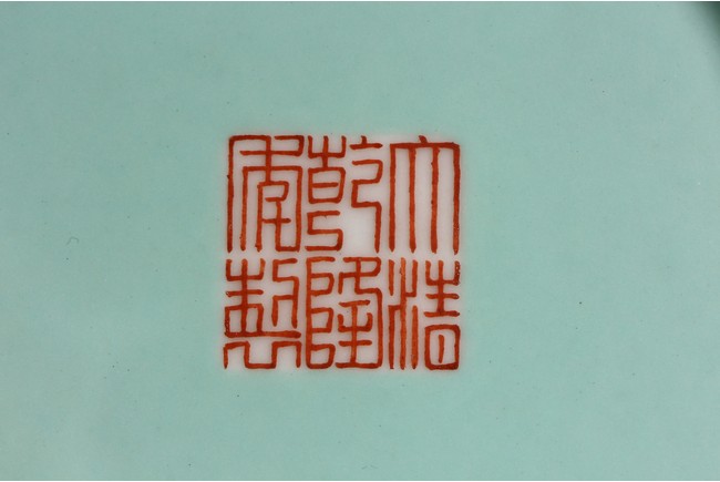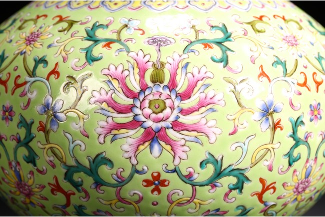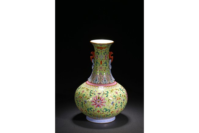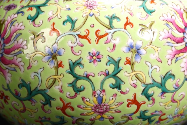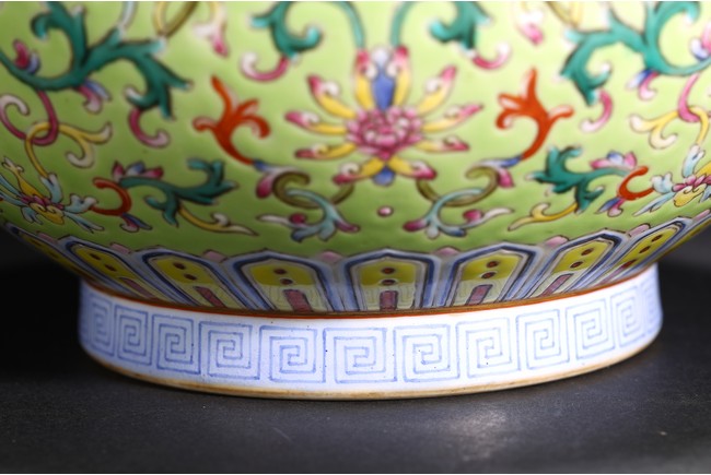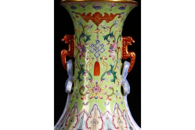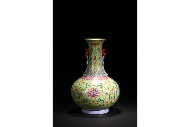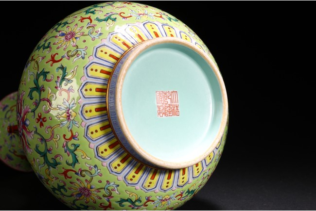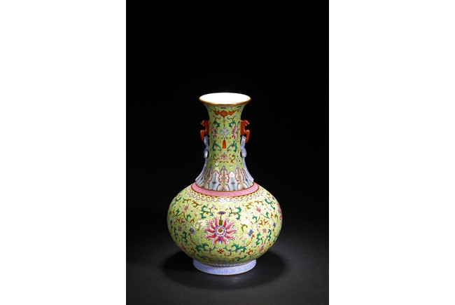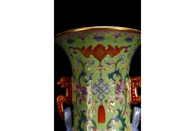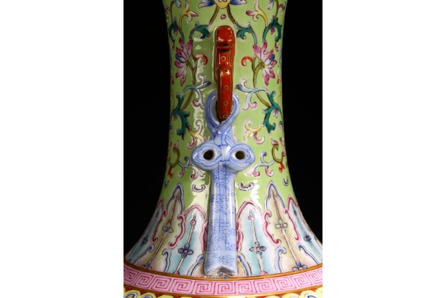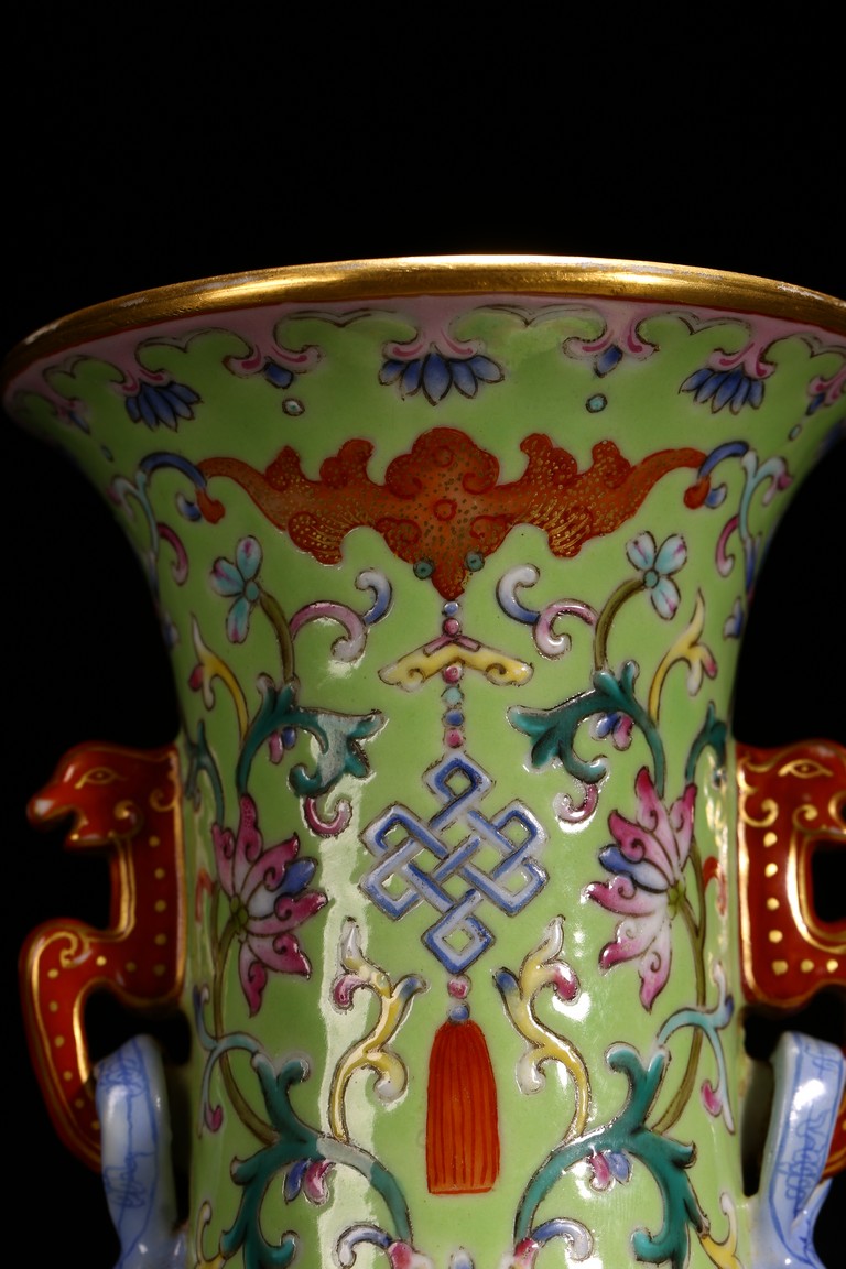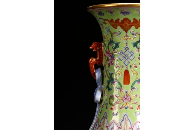 The compressed globular body rising from a splayed foot to a long slender neck and slightly flared rim, brightly painted around the exterior with stylized scrolling lotus below lingzhi and wan motif all against the lime green ground, flanked between a band of key-fret pattern around the neck and upright lappet around the foot, the waisted neck flanked by two moulded stylized dragon handles in iron-red with details in gilt, dividing on each side a floral scroll encircling a pendant hung from a bat, the interior covered in turquoise green glaze, the base inscribed with six character Qianlong mark. Qing Dynasty Qianlong period.