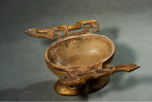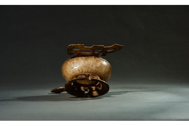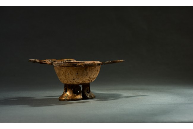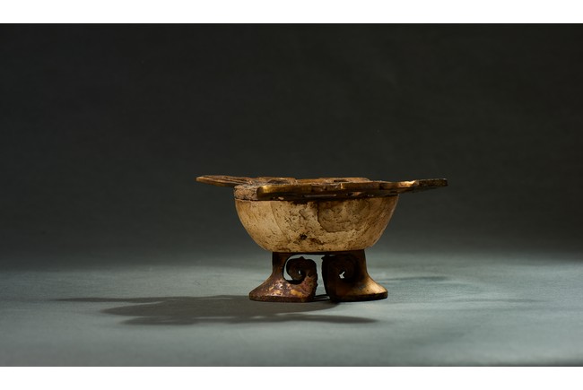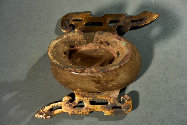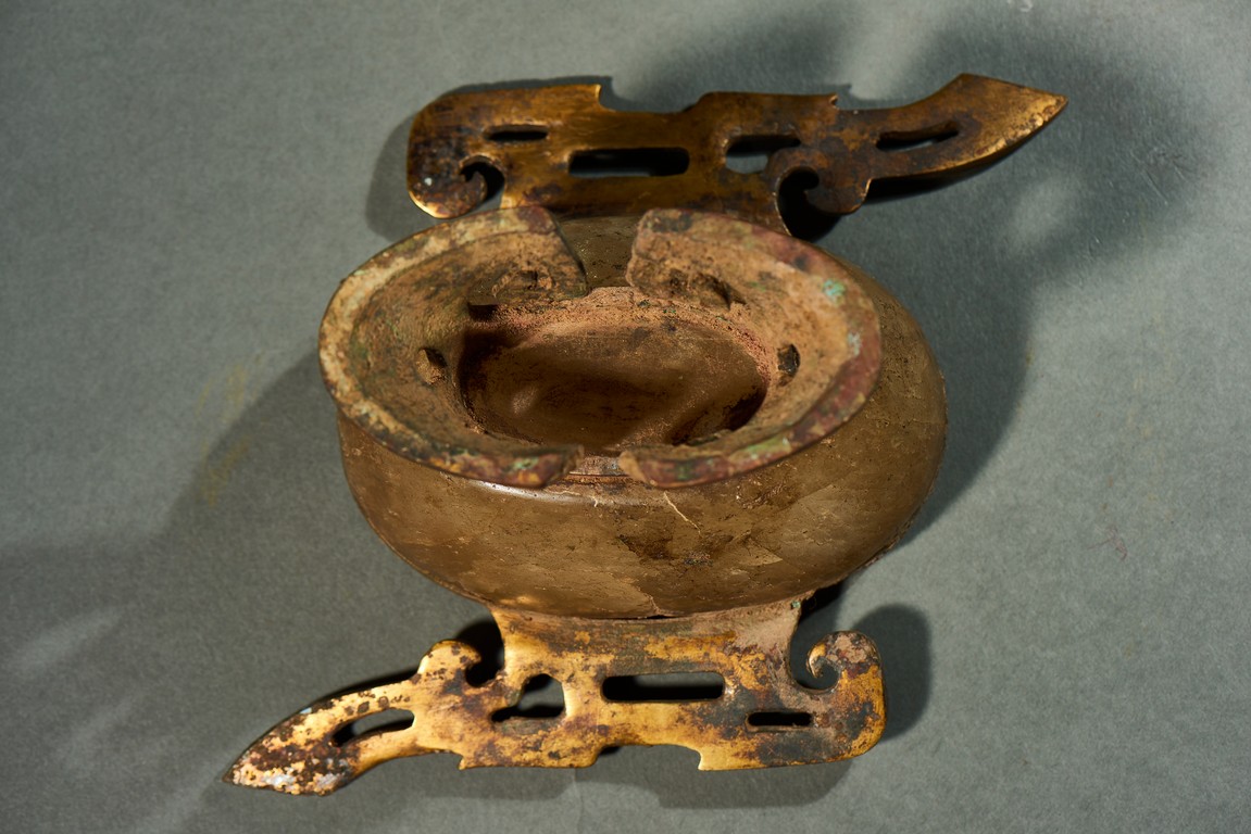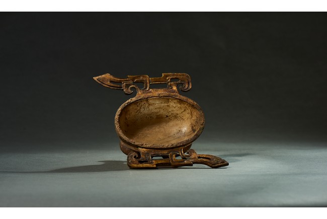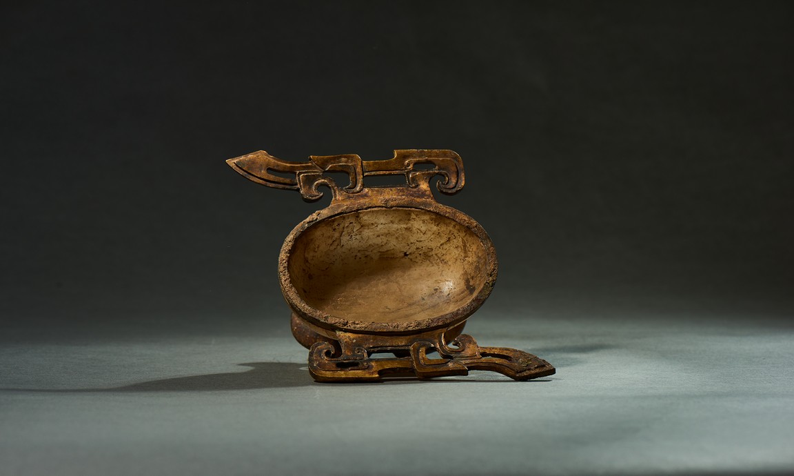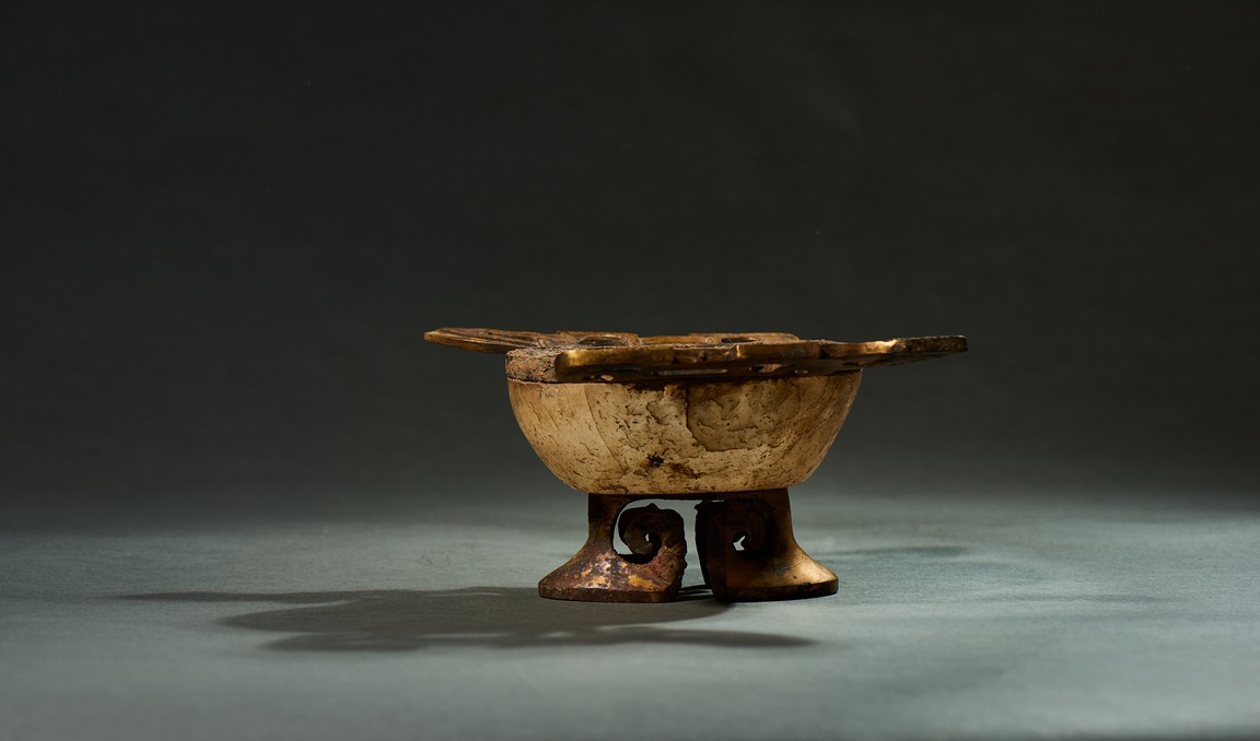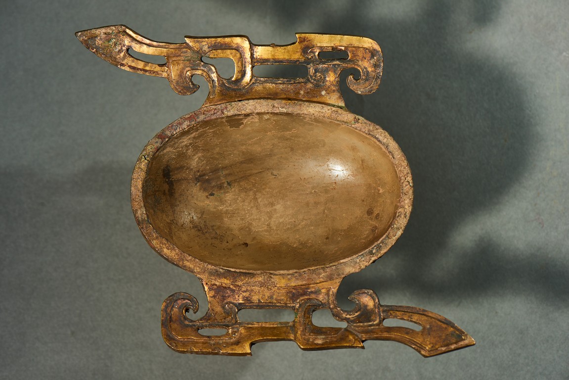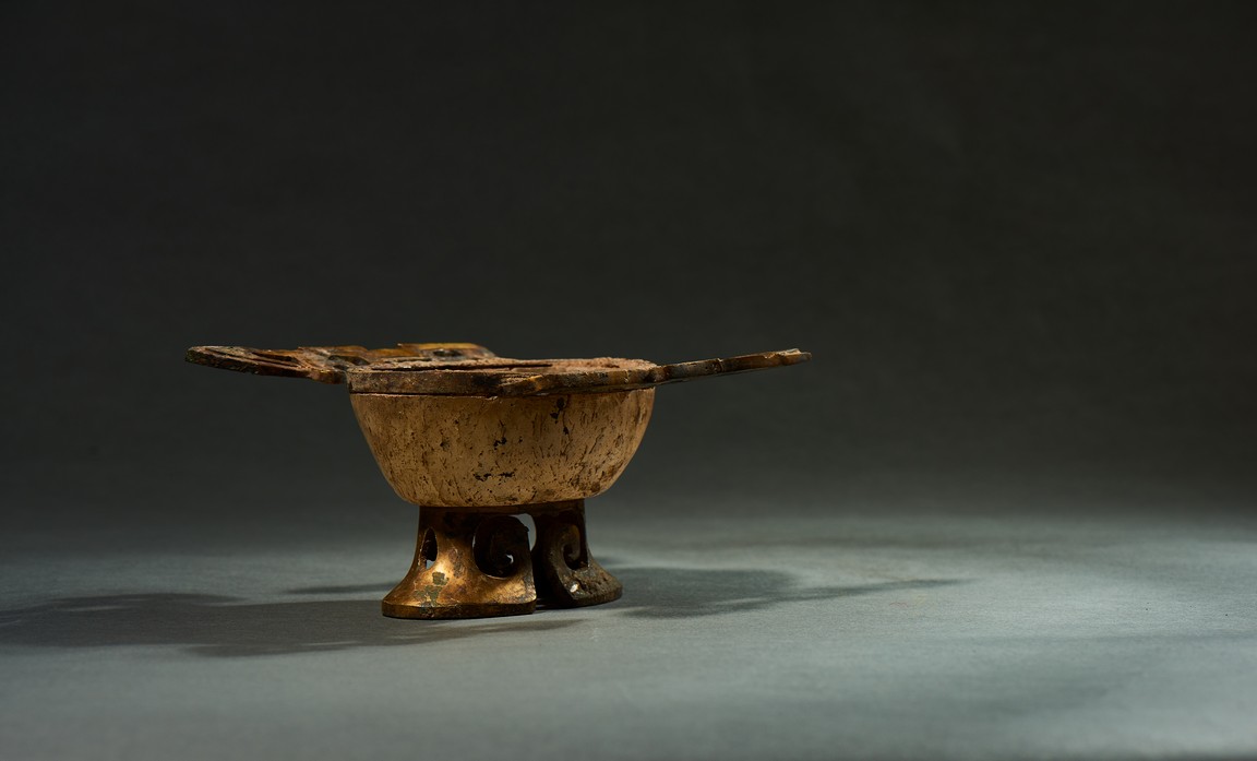 Carved in oval form and mouth rim mounted with gilt bronze band and flanked by two pointed openwork handles, all supported on spreading gilt bronze stand, with remains of excavation and age-related encrustation. Han Dynasty period.